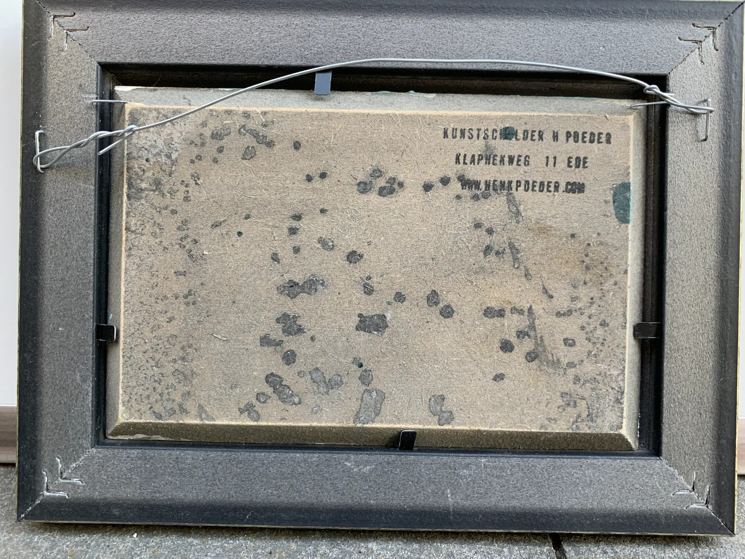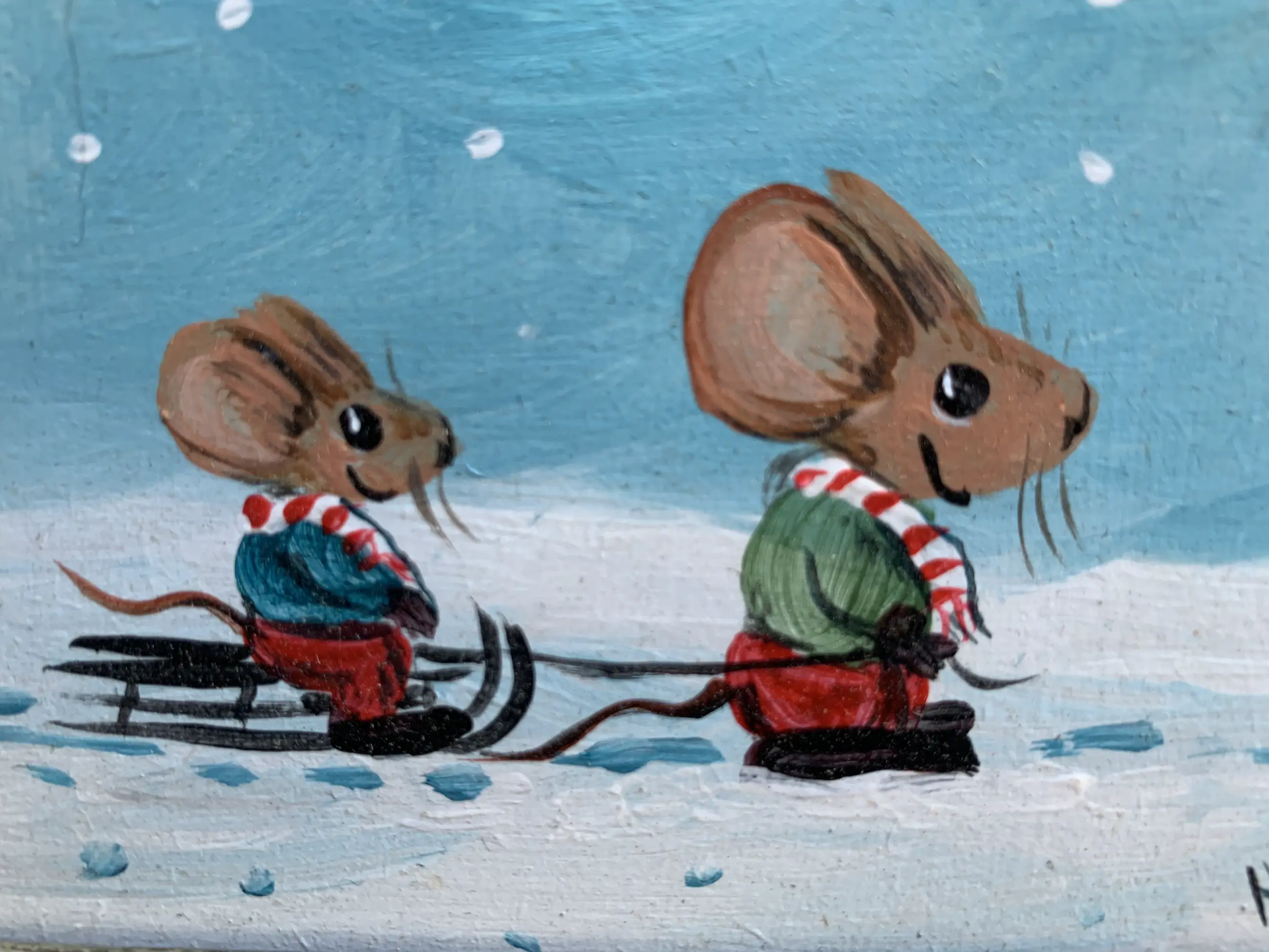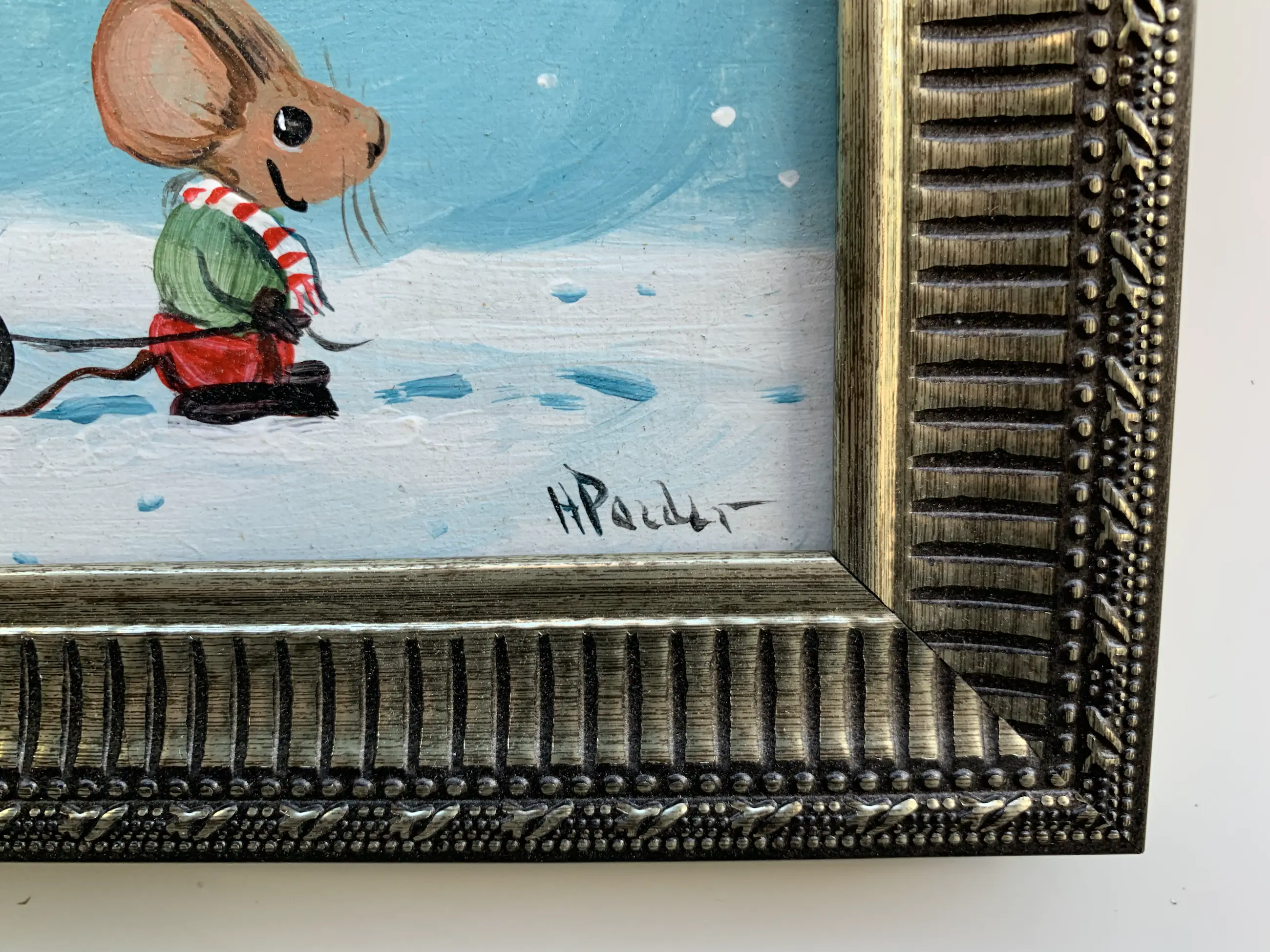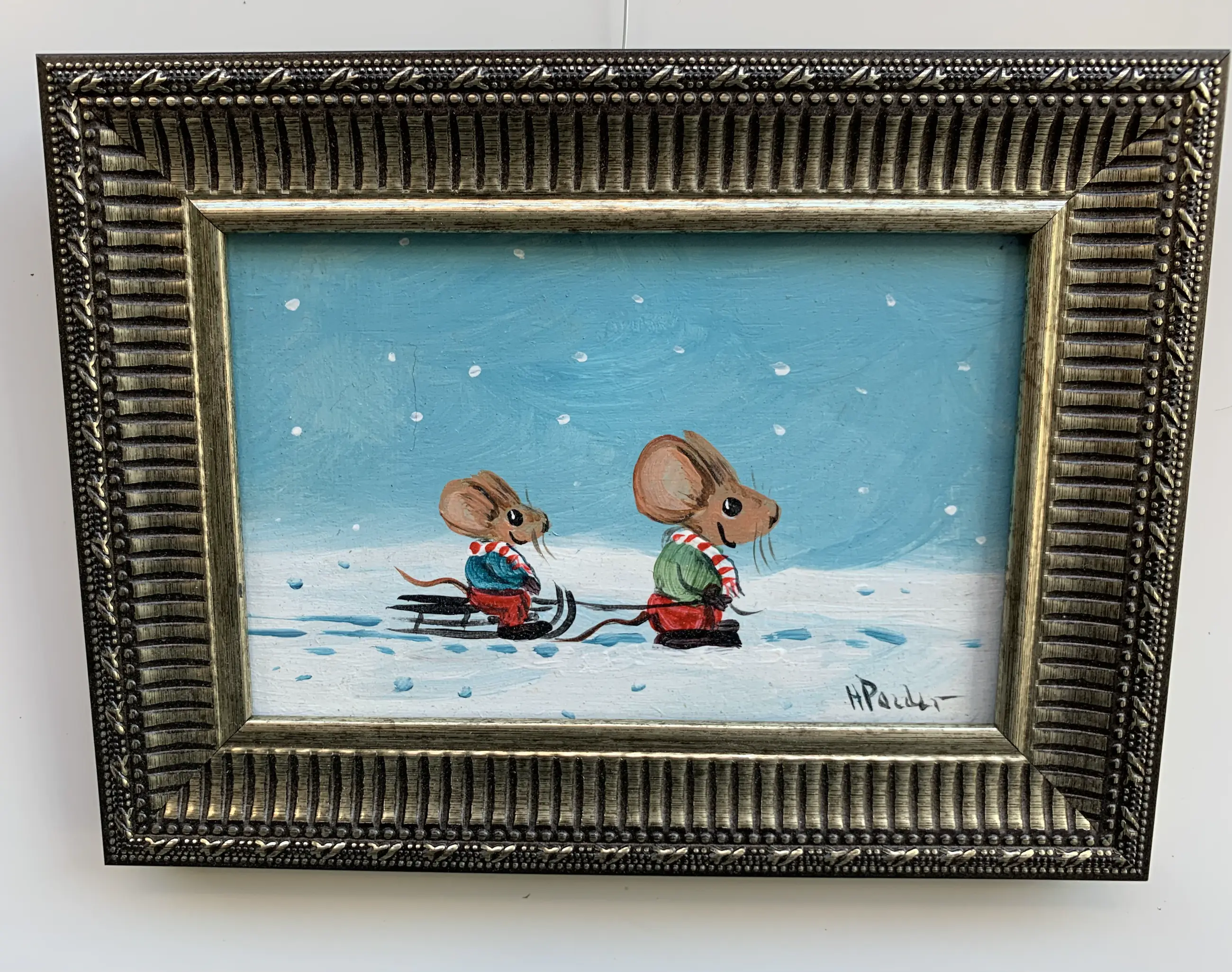 Grappig schilderijtje van Henk Poeder twee muisjes in de sneeuw erg leuk schilderijtje voor het komende jaargetijde , schilderij is rechts onder gesigneerd h poeder (zie ook voor info rkd in Denhaag , site rkd)