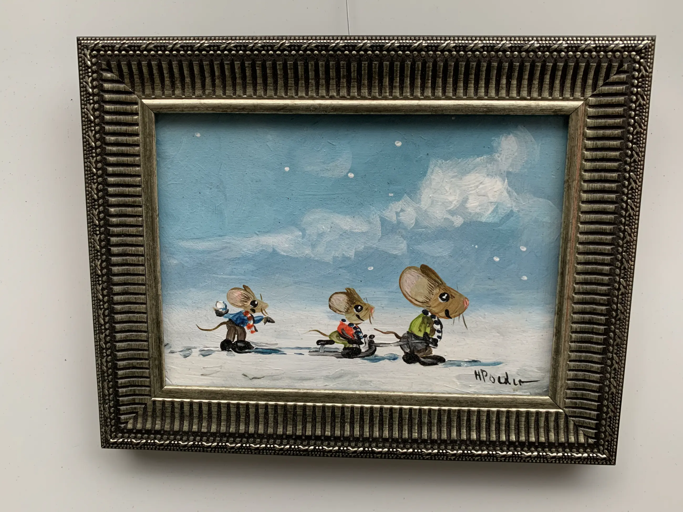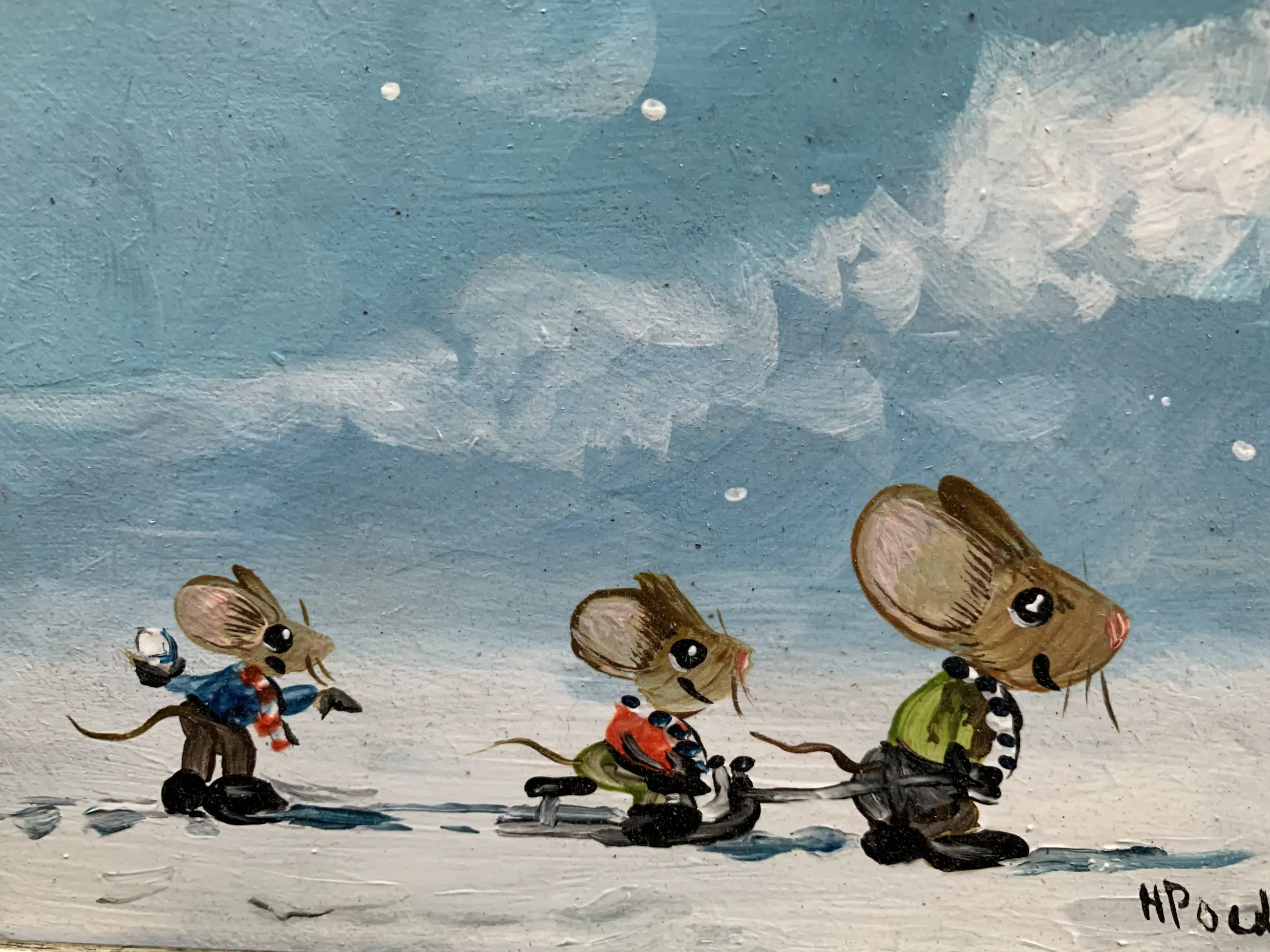 Leuk olieverf schilderij met muisjes in de sneeuw schilderij is rechts onder gesigneerd H Poeder geweldig leuk werk en kan zo aan de muur (info bij rijks kunst en documentaties in Denhaag (ook site van rkd )