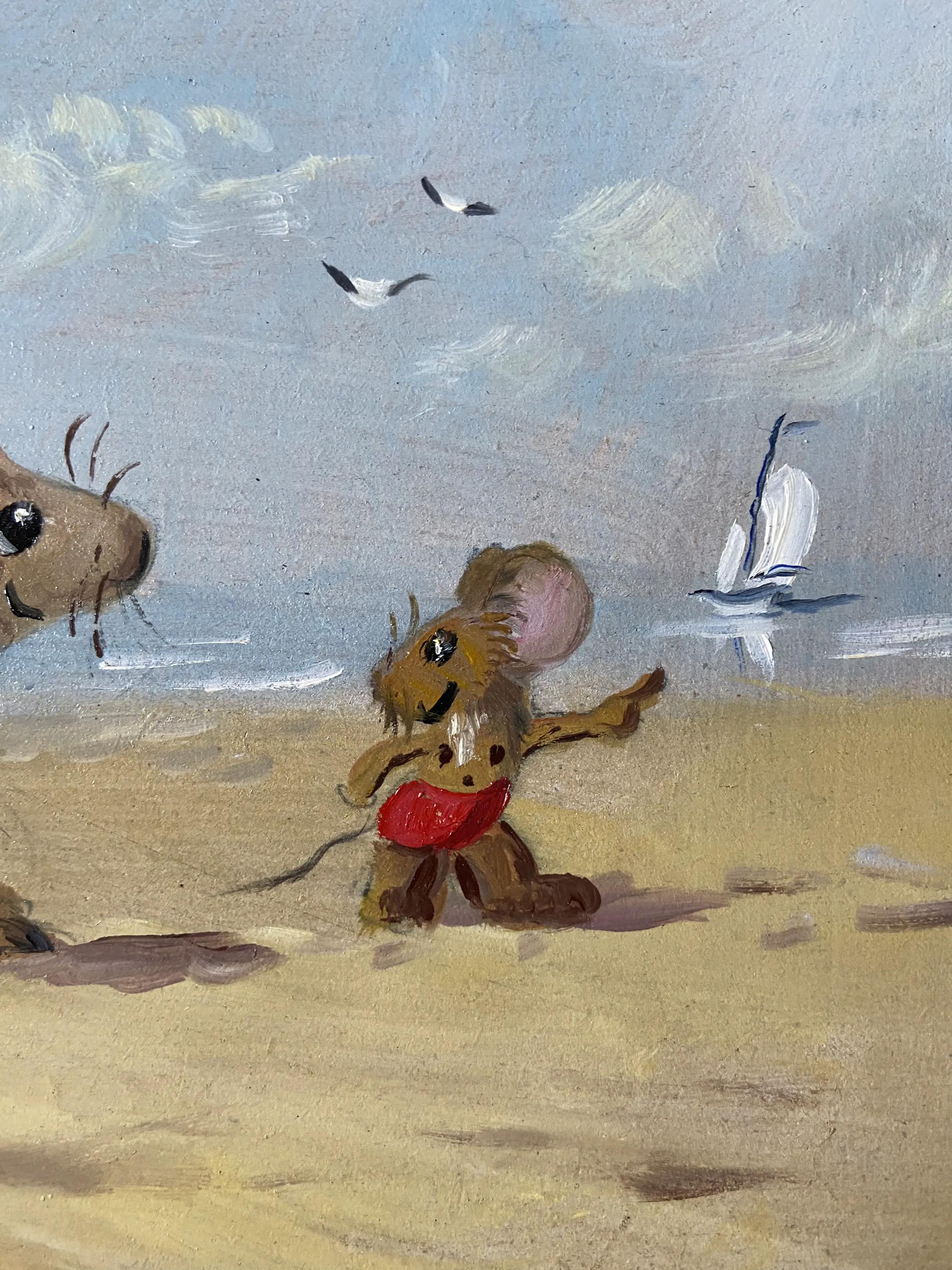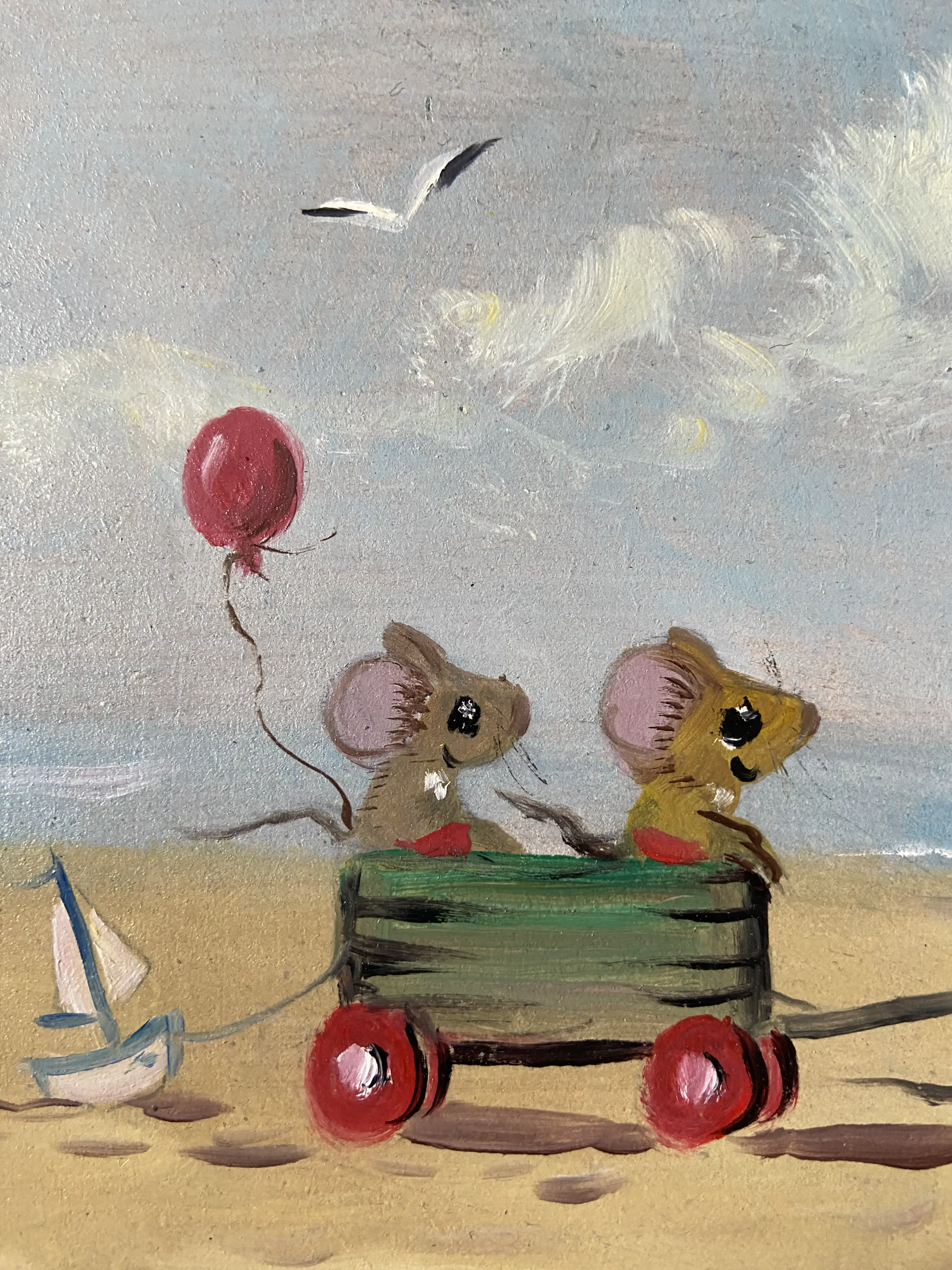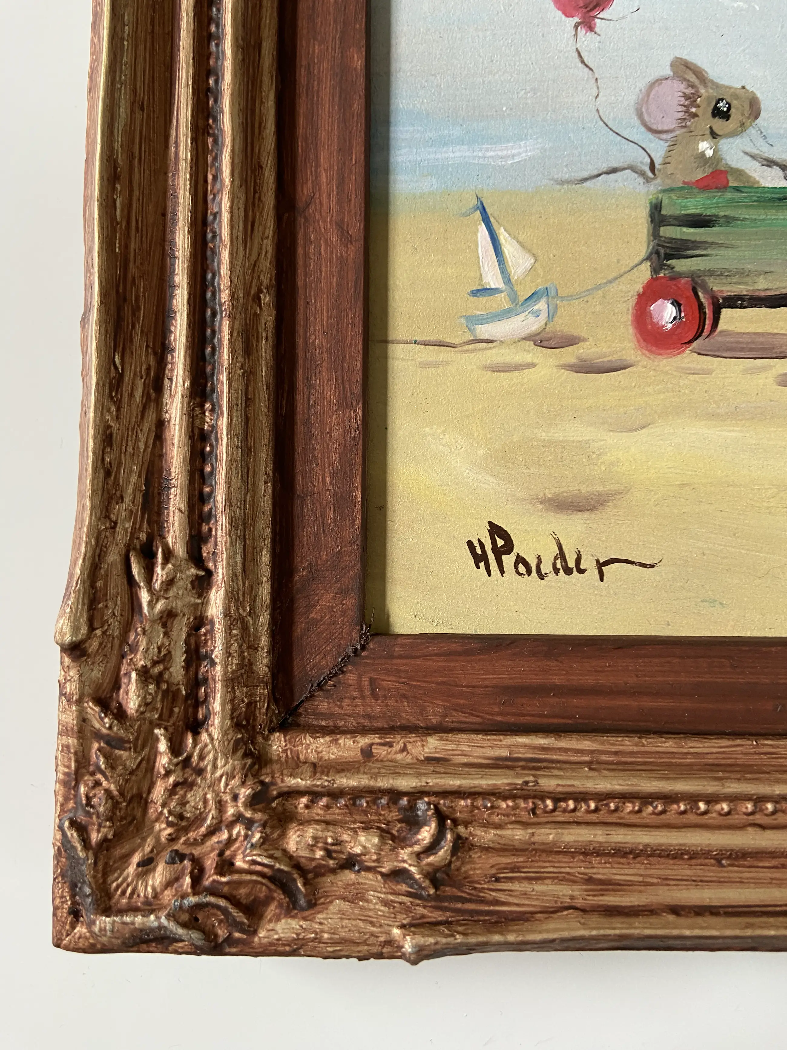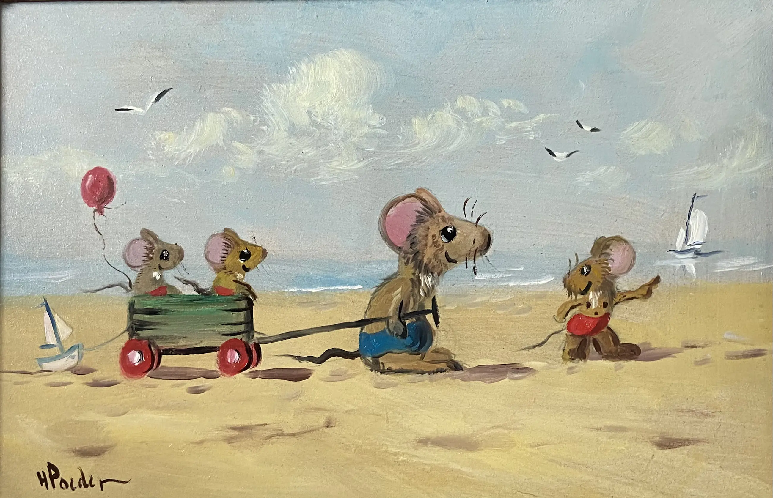 Muisjes aan het strand het is vader oppas dag schilderij is rechts onder gesigneerd h poeder schilderij zit in een netjes oudere lijst kan zo aan de muur .
