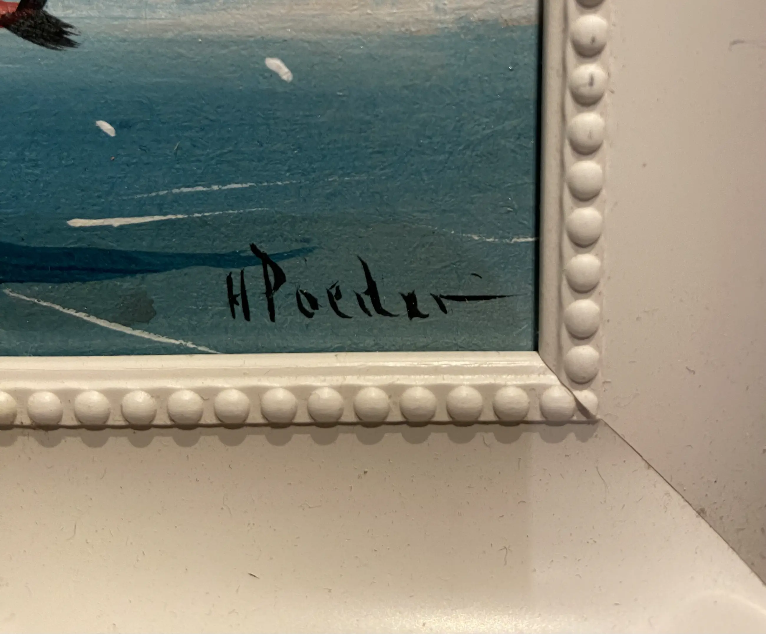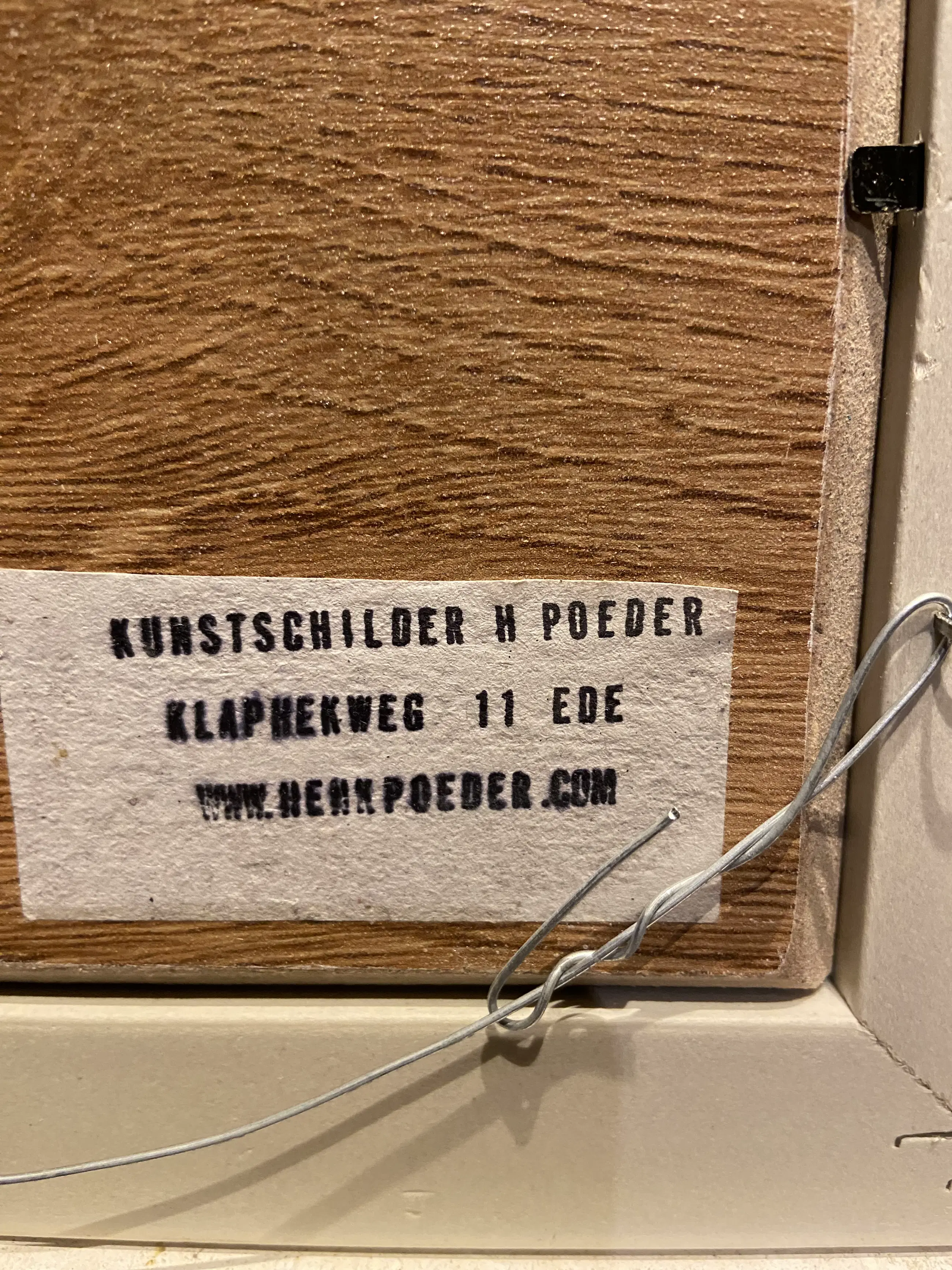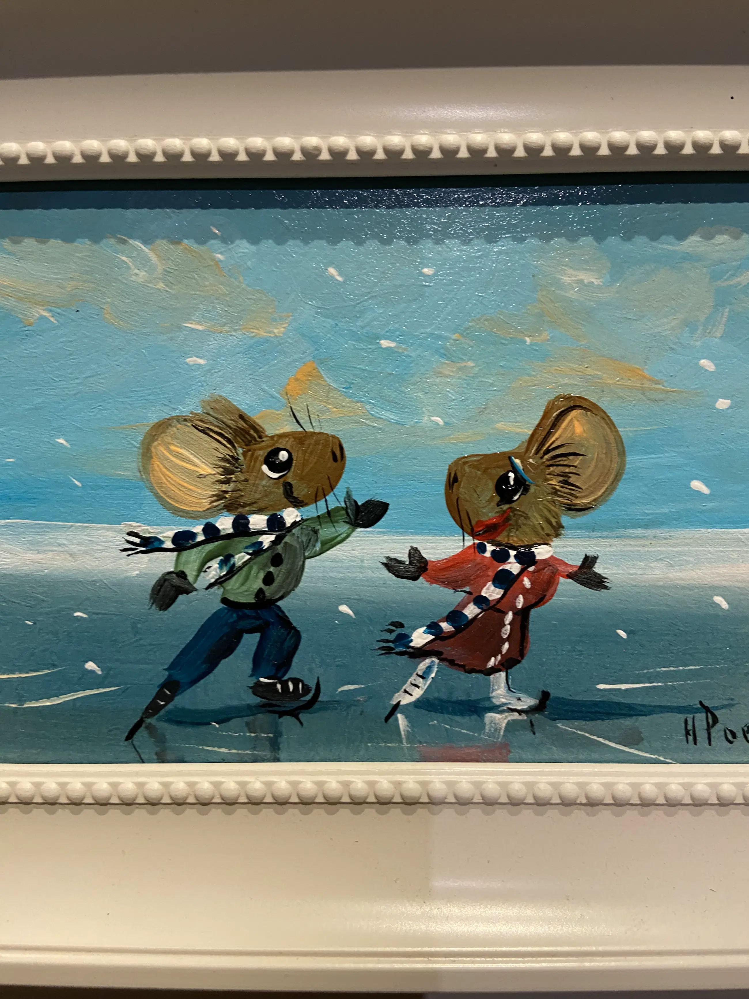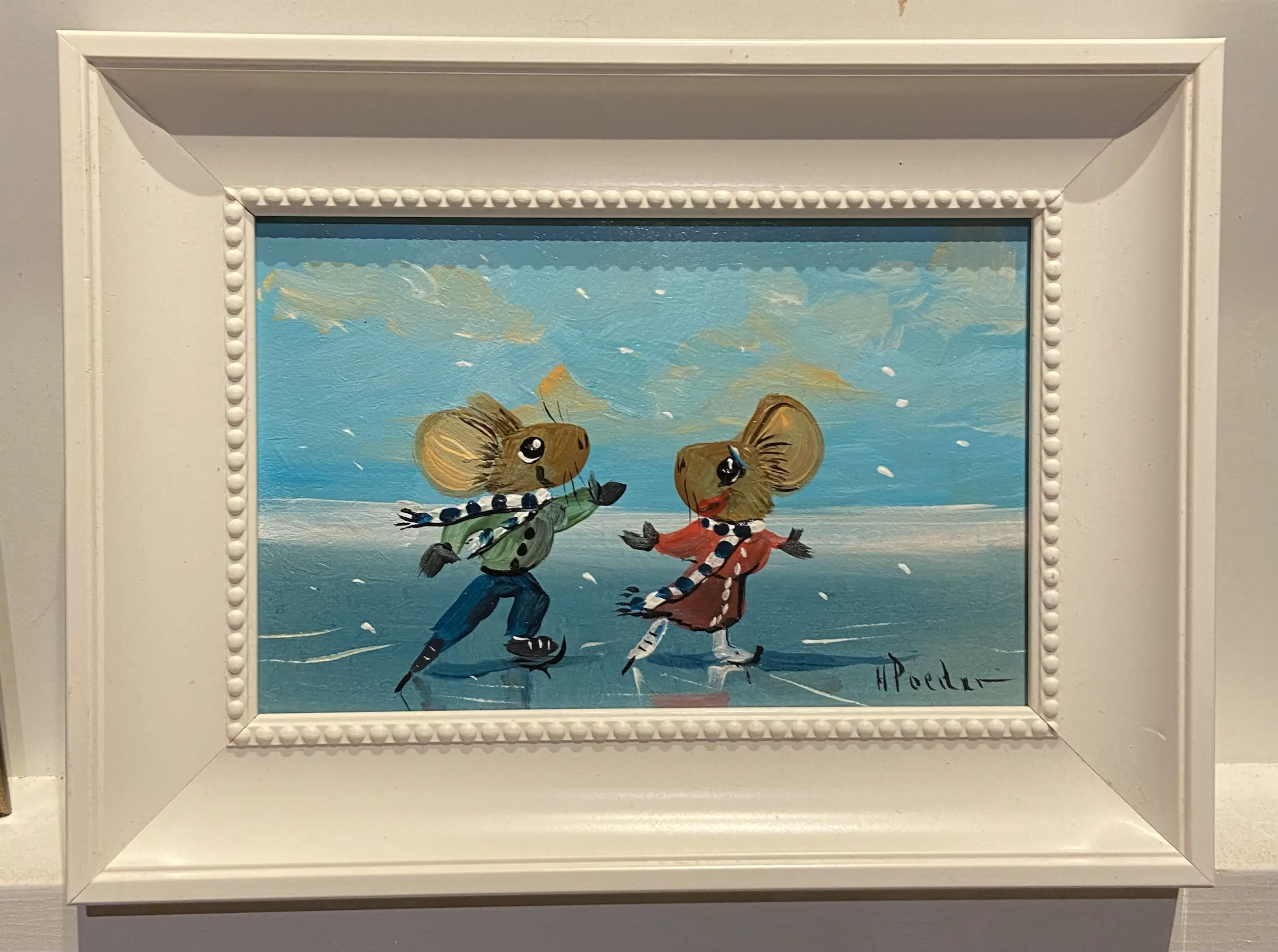 Leuk schilderijtje met verliefde muisjes die samen schaatsen schilderij is rechts onder gesigneerd H Poeder en zit in een leuk wit lijstje. zie ook info rijks kunst en documentaties in Denhaag (ook Site rkd) )