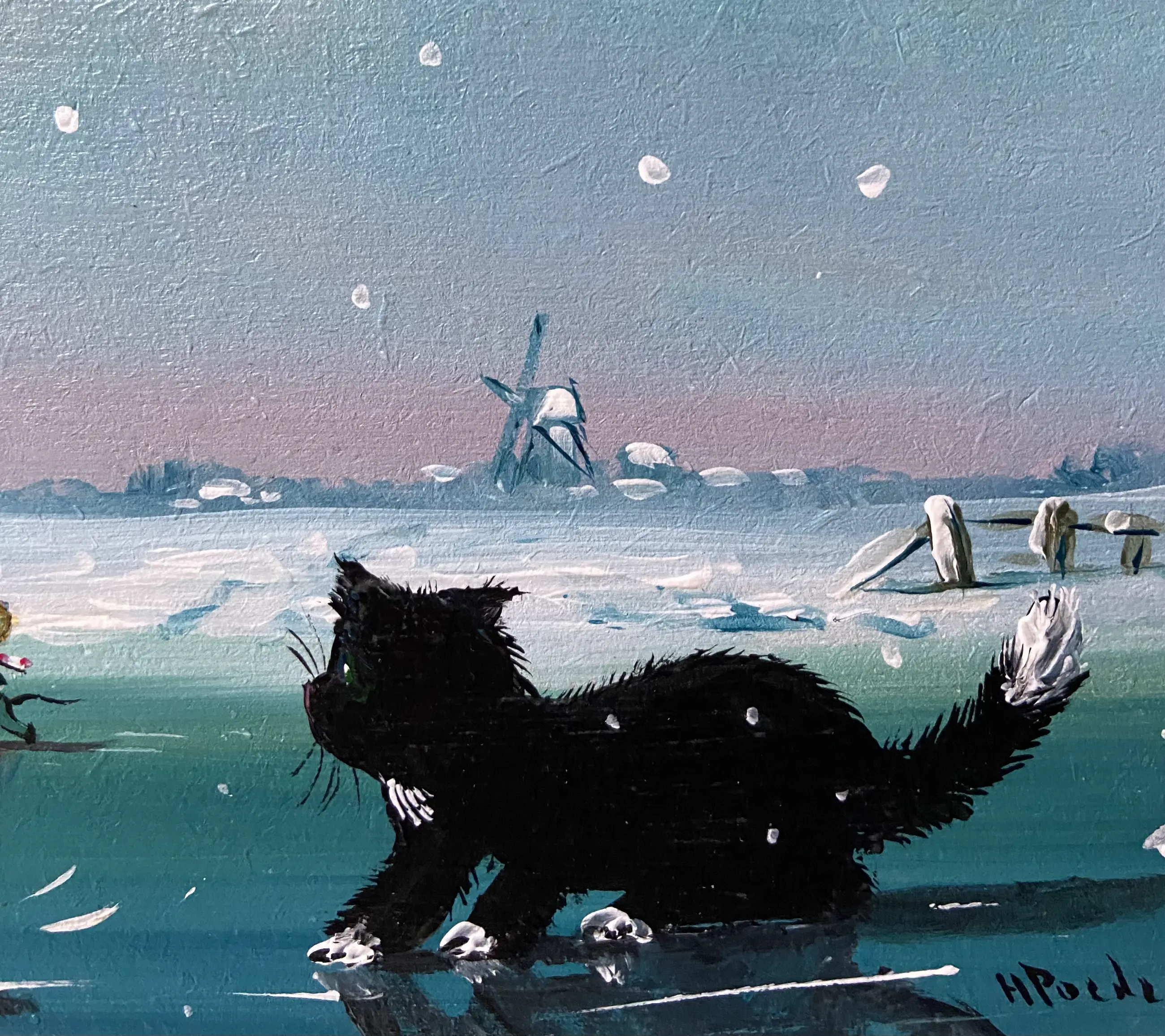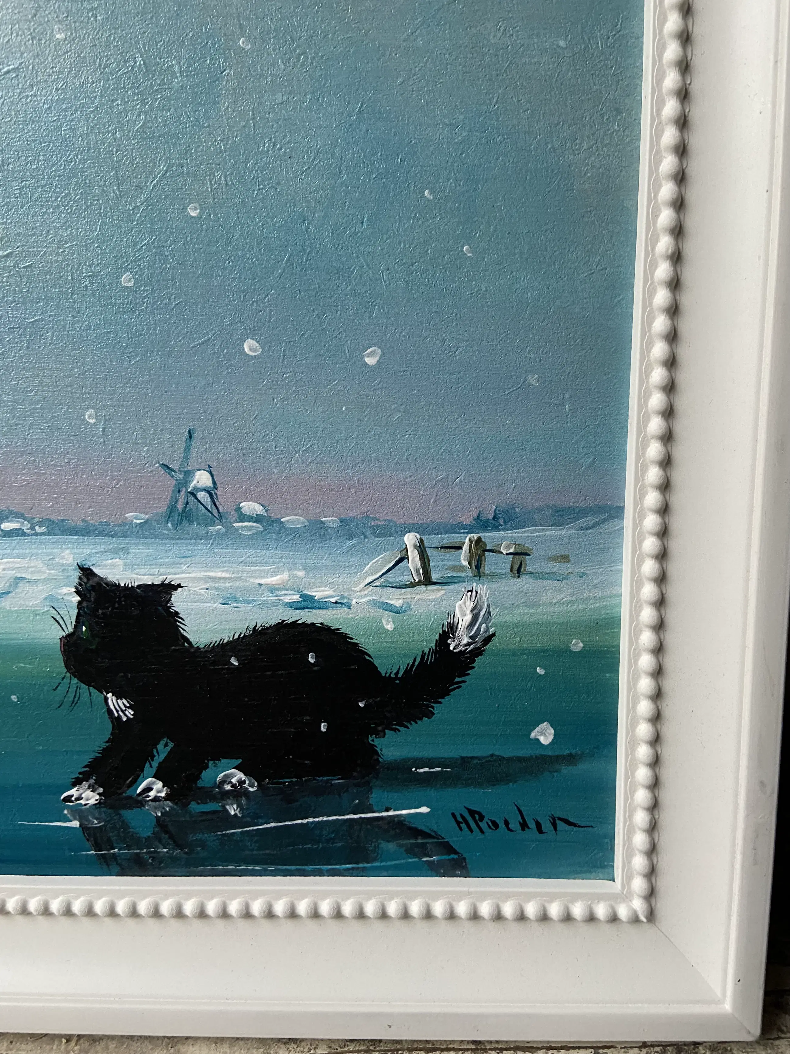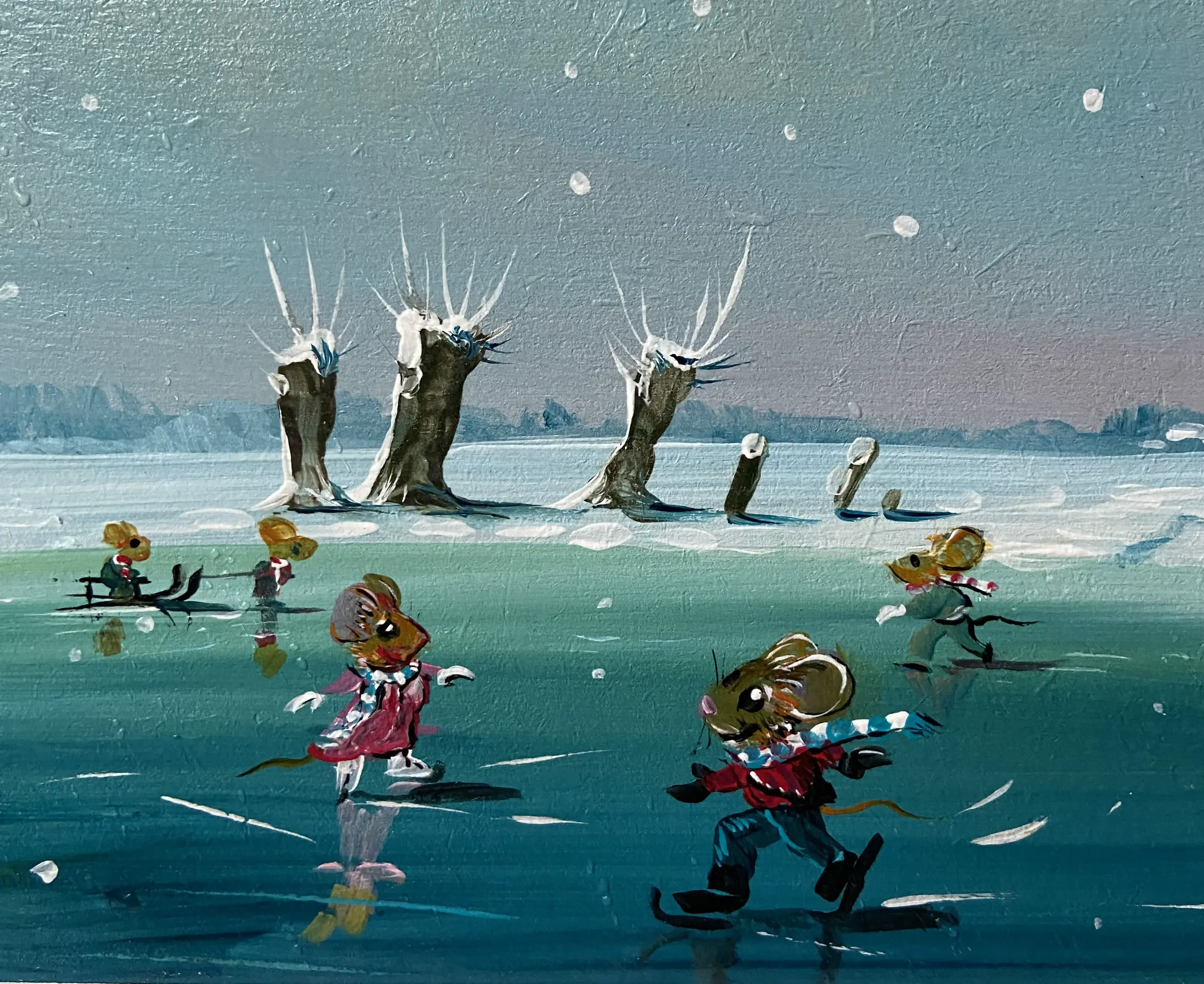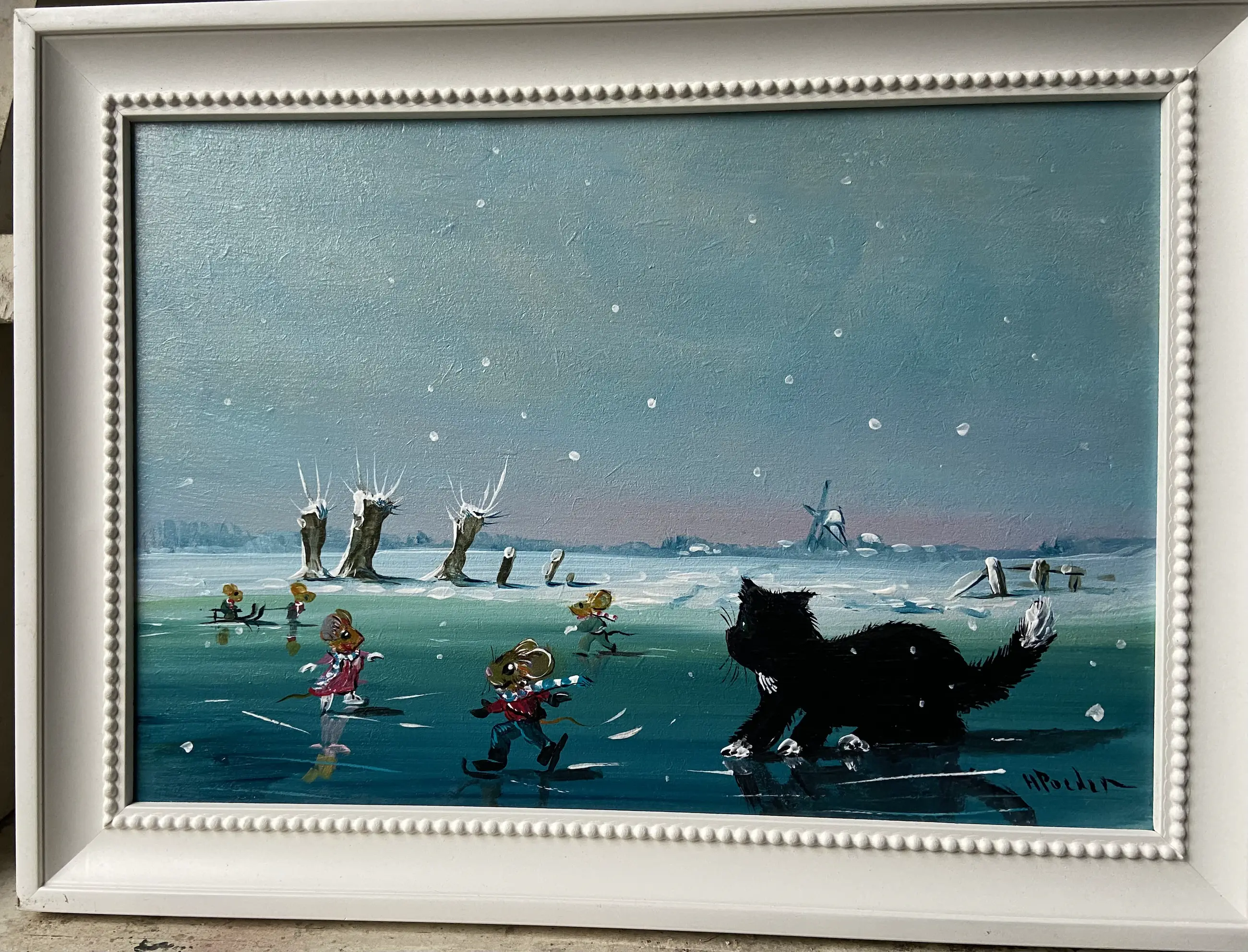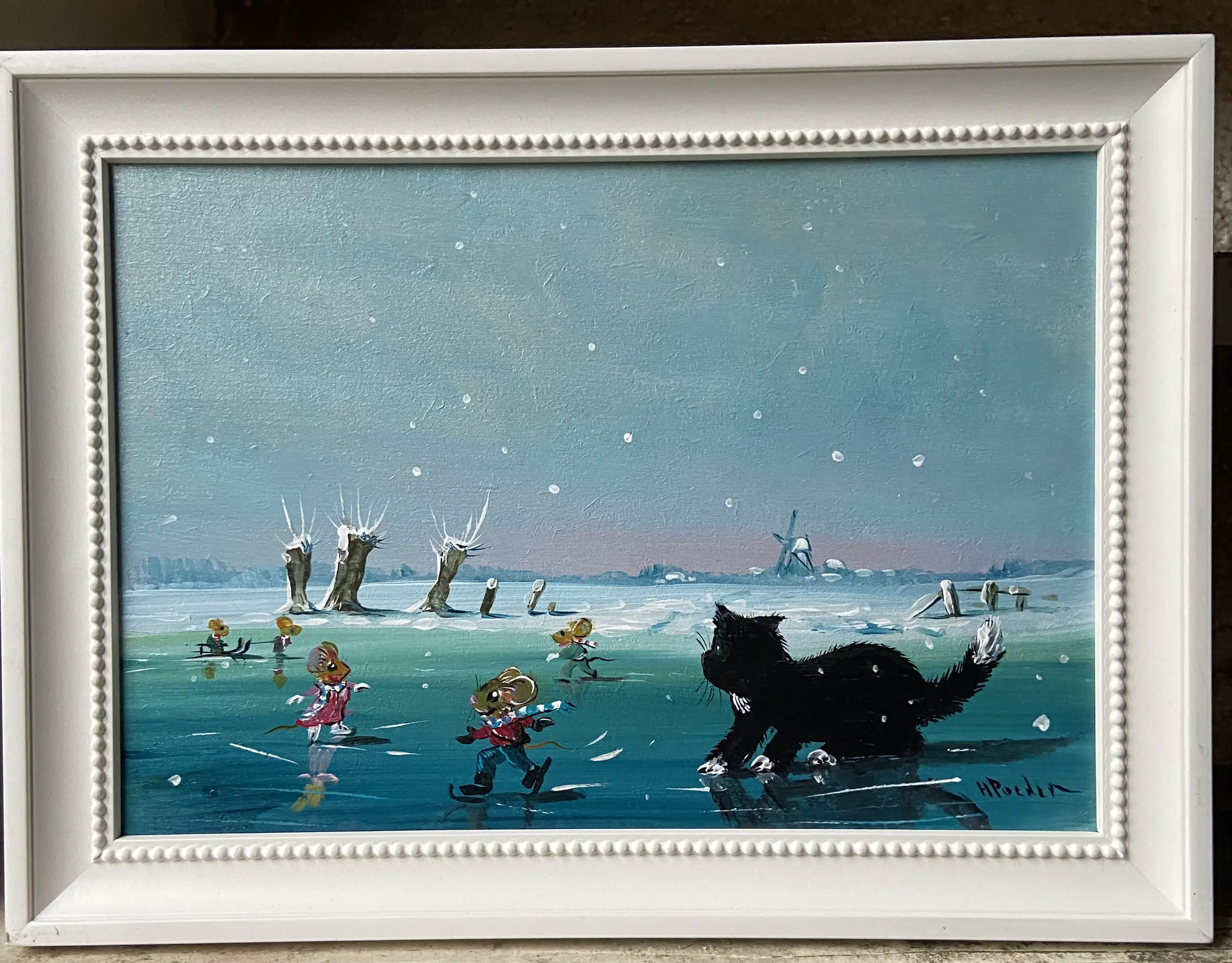 Leuk werk van Henk Poeder 1964 betreft zo als u ziet muisjes schaatsend op het ijs en een poef kijkt verbaast ,, wat is dat ,, schilderij is rechts onder gesigneerd H Poeder
