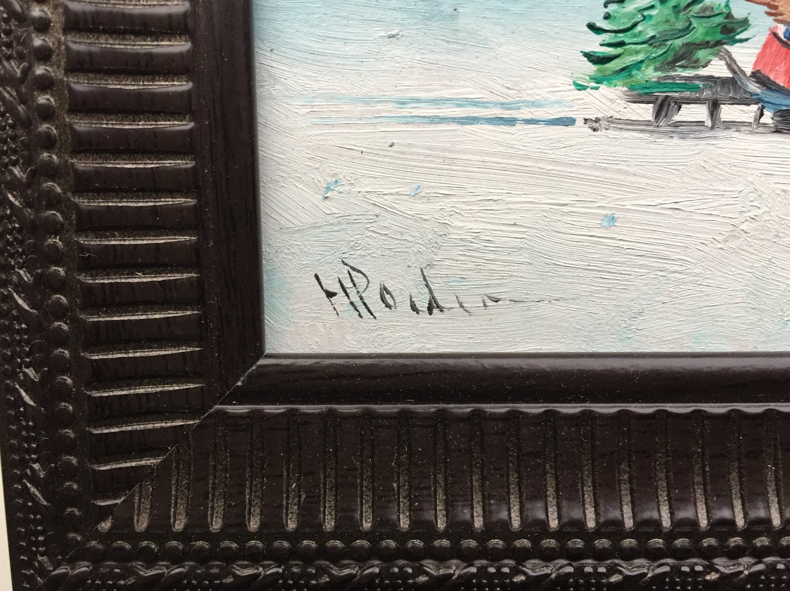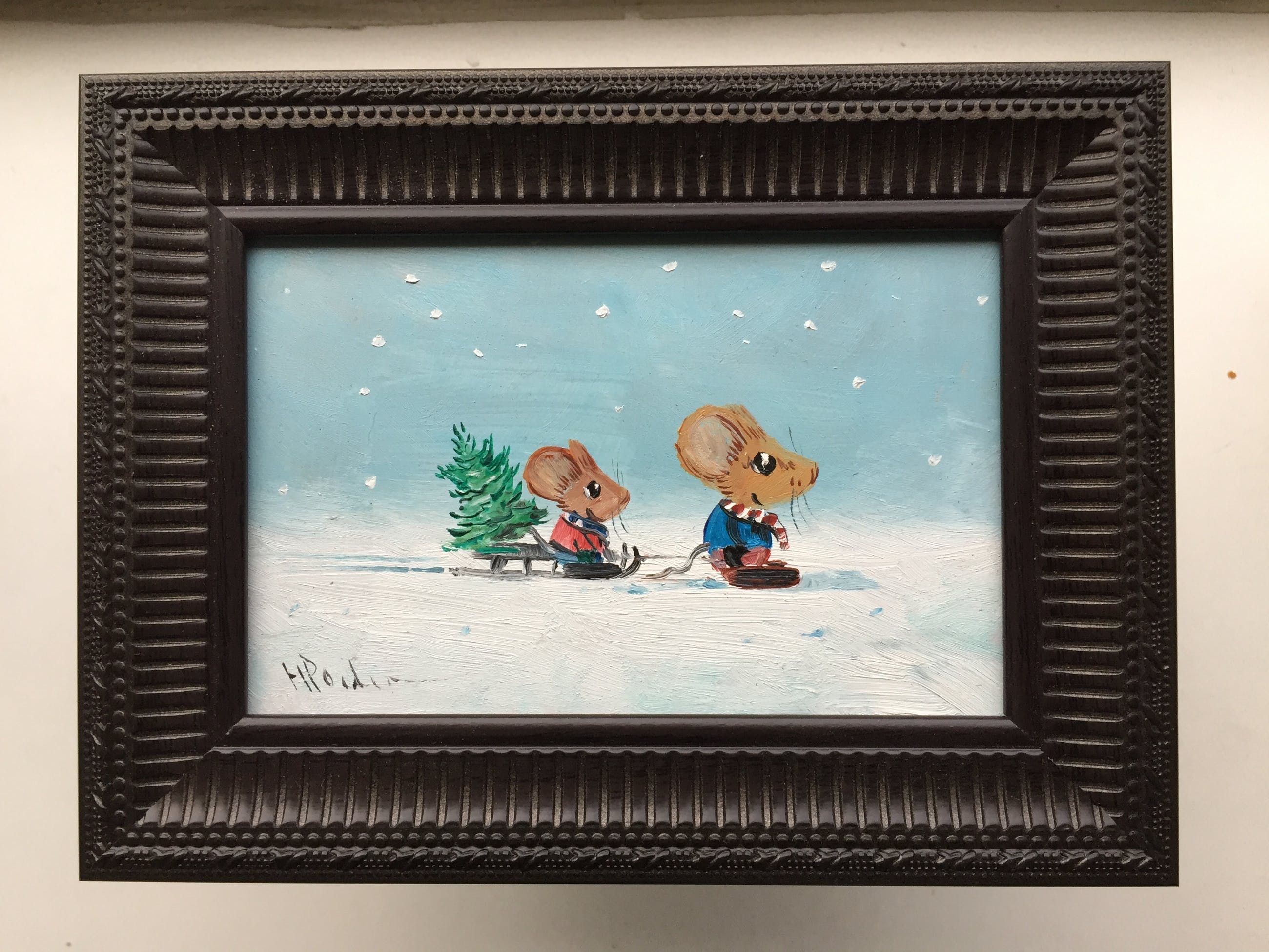 Twee muisjes die een kerstboom zijn wezen halen in het bos olie verf op painterboard gesigneerd links onder h poeder