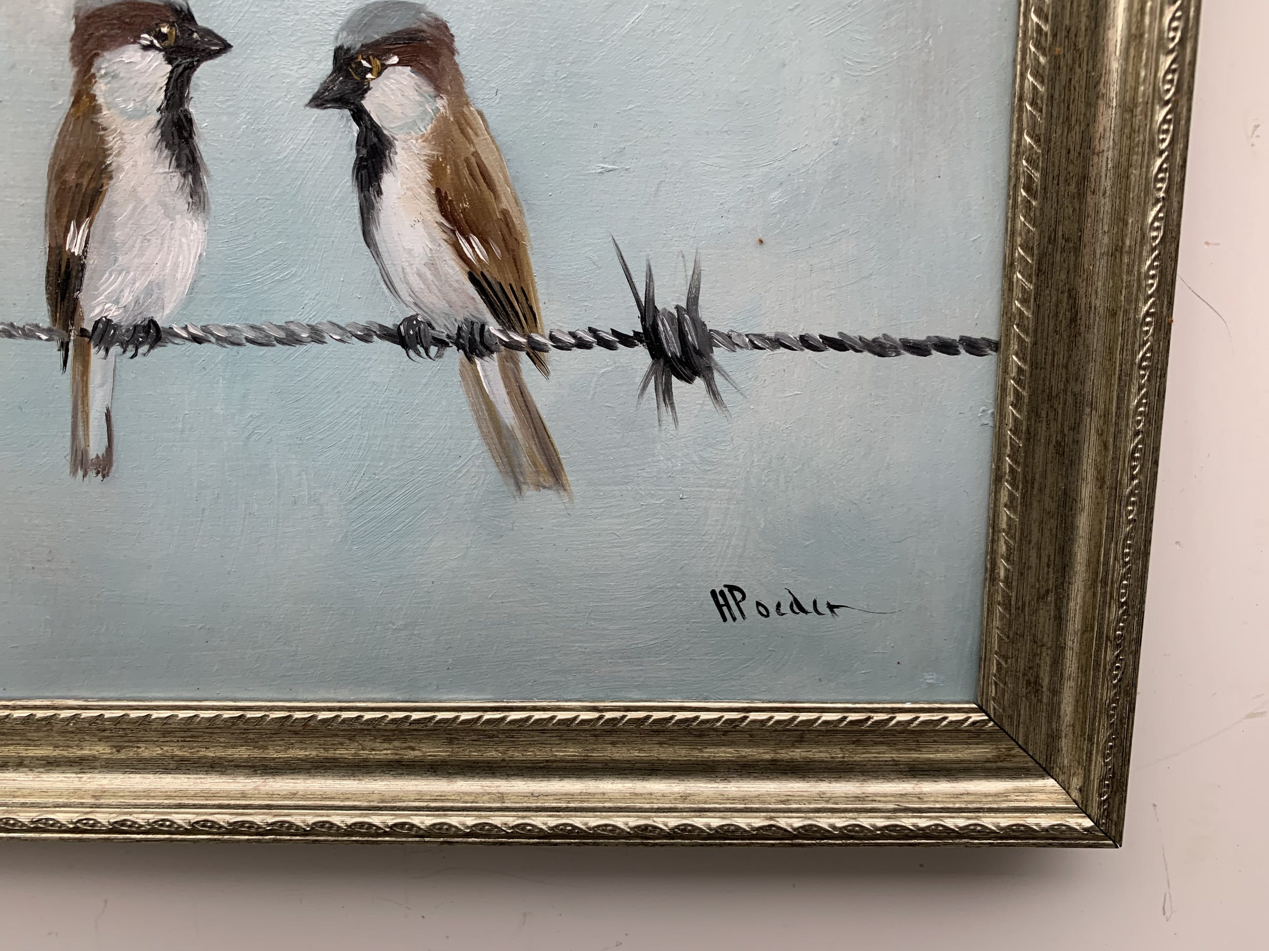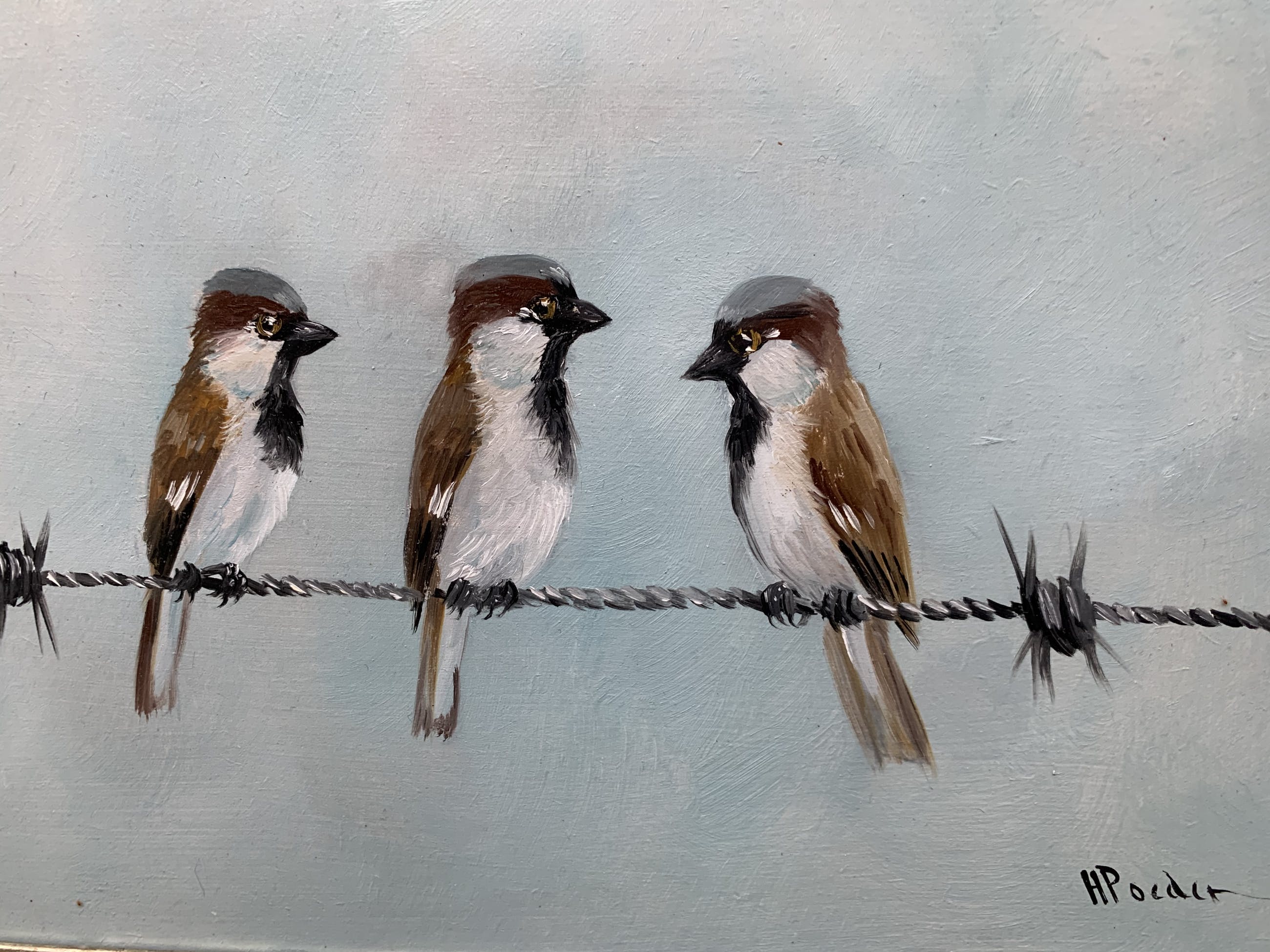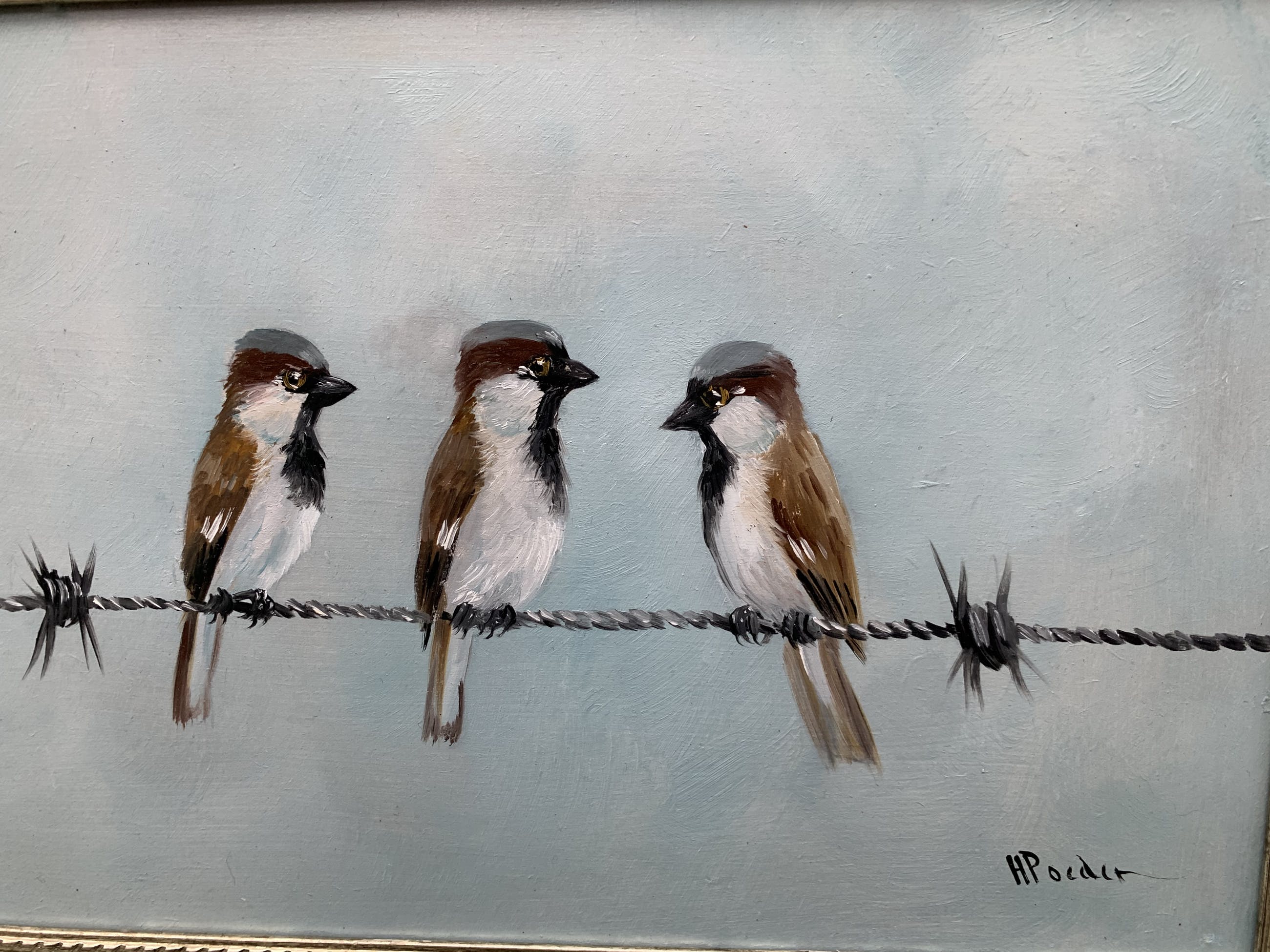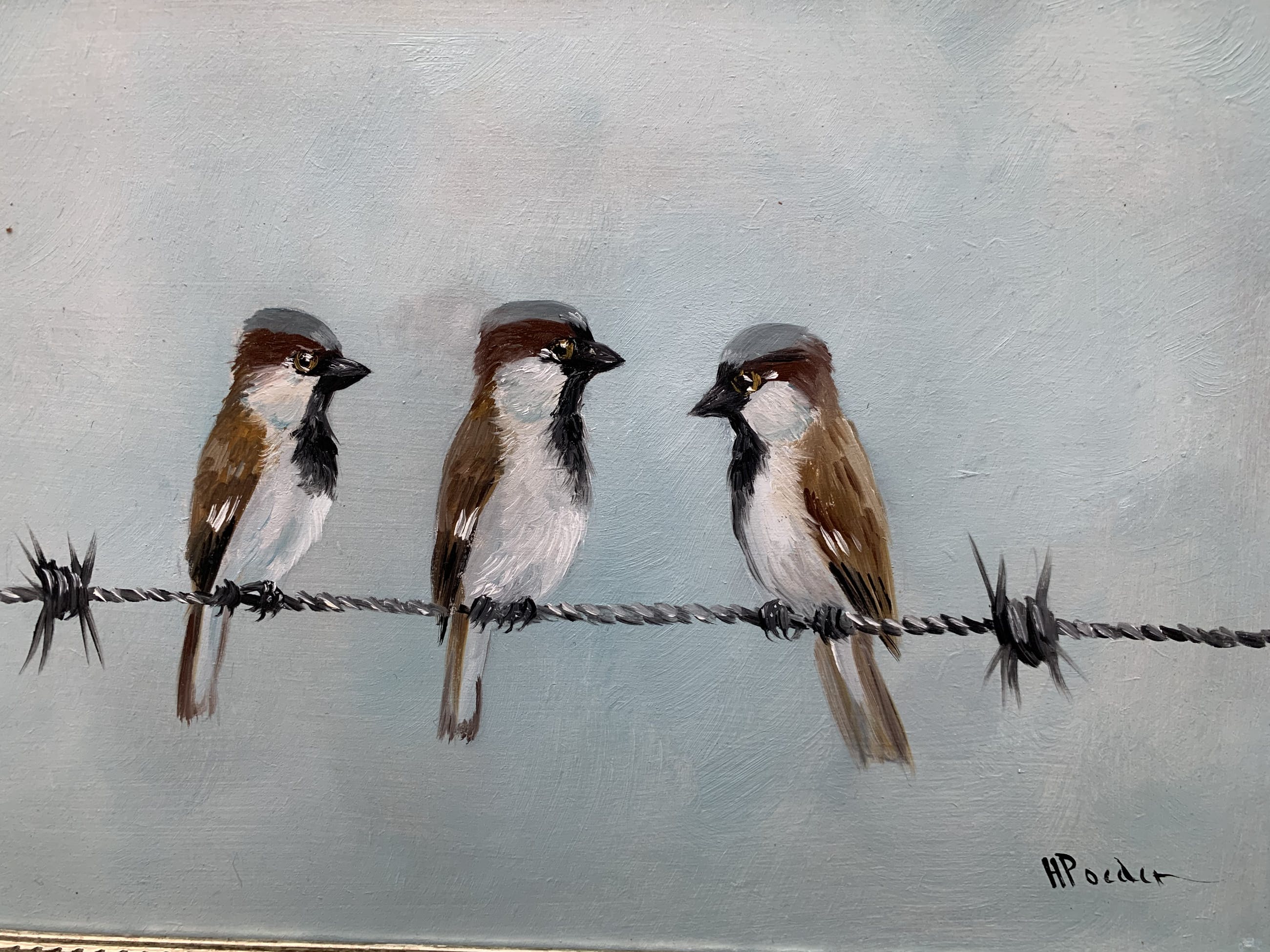 Drie mussen op het prikkeldraad wat licht besneeuwd is in de winter links onder gesigneerd HPoeder verder spreekt het schilderij voor zich .