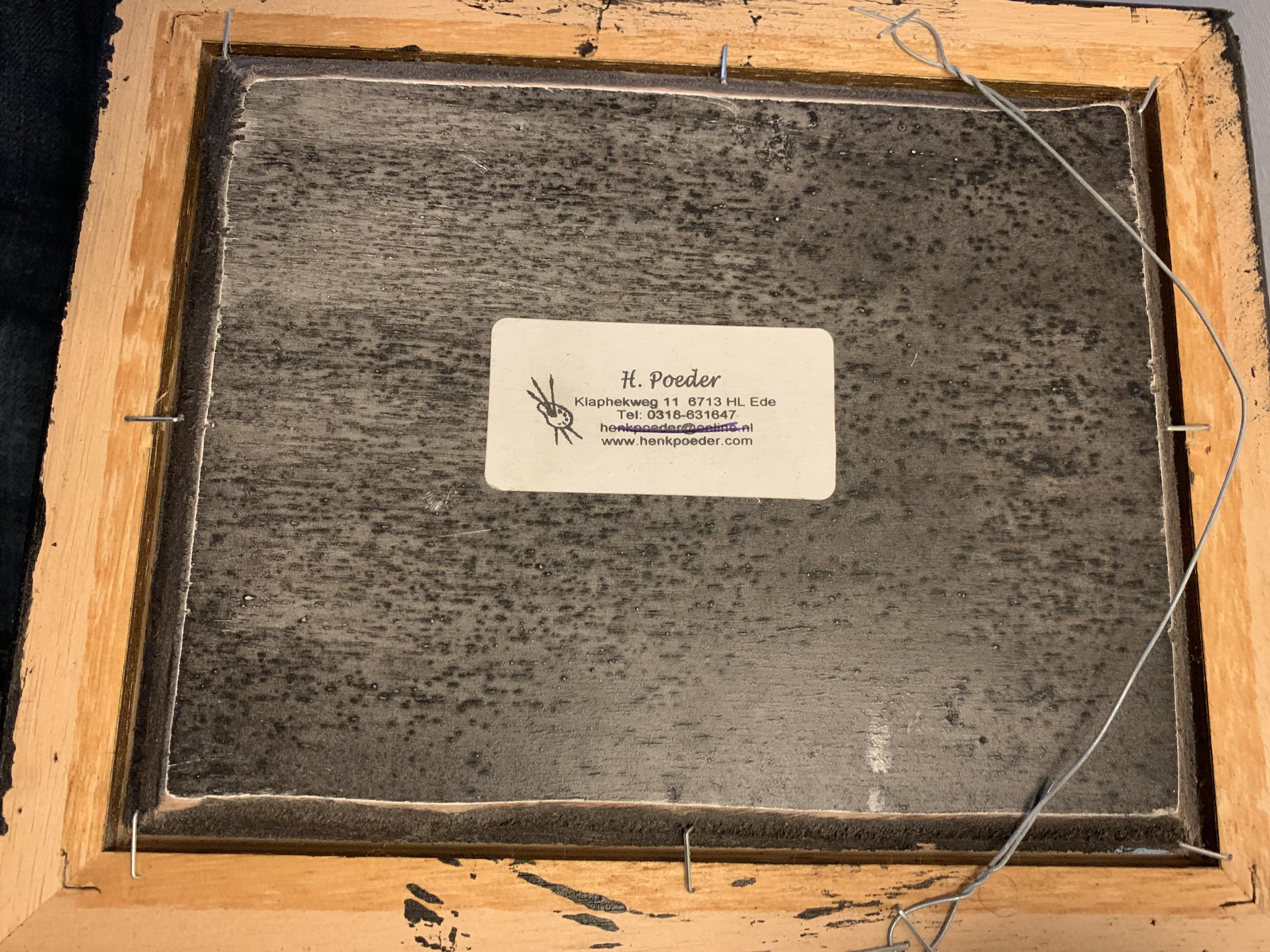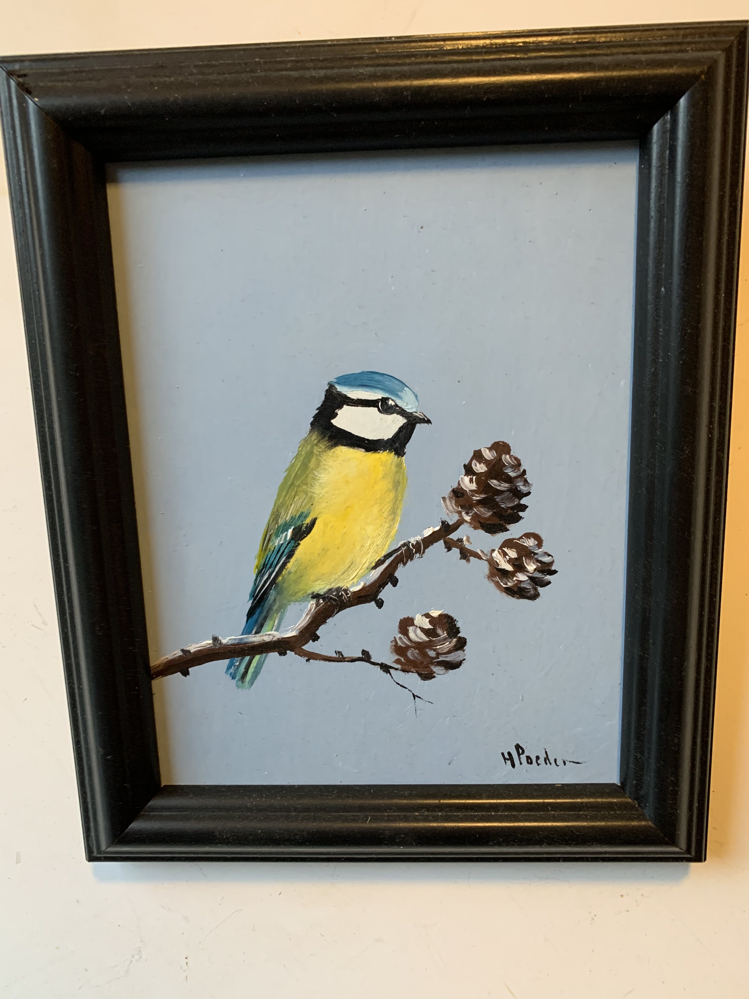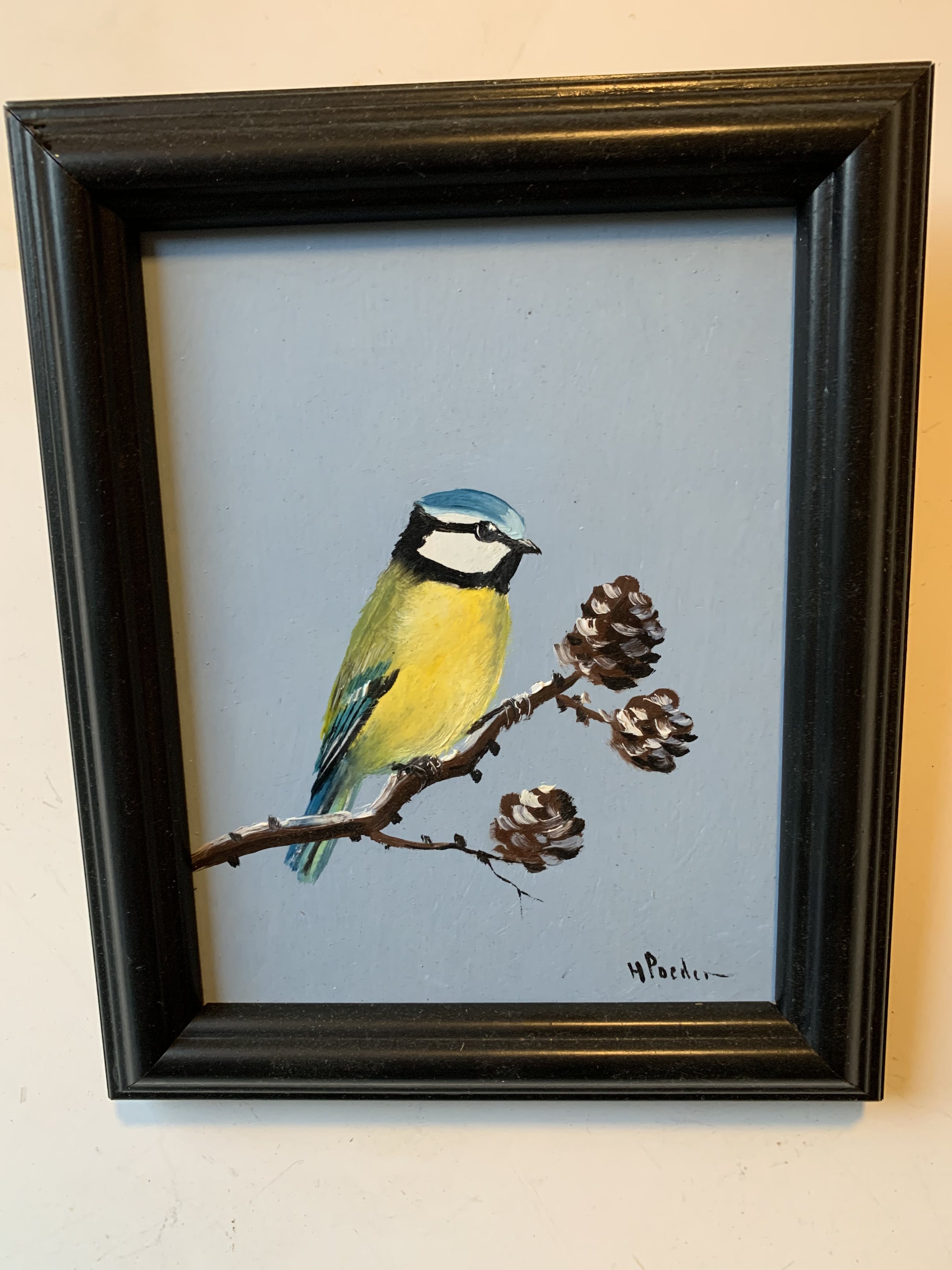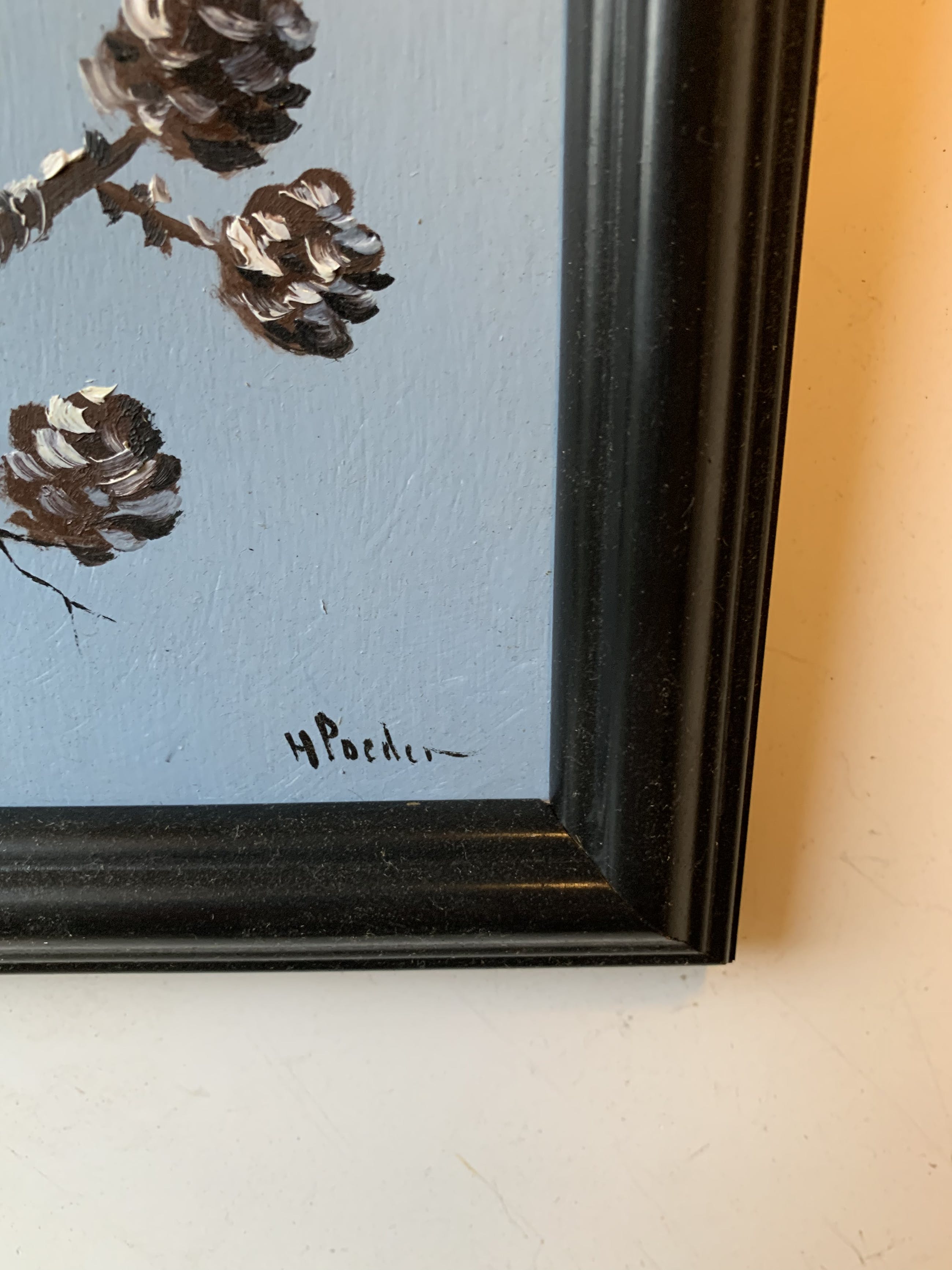 Heel leuk werk van H Poeder betreft een pimpelmeesje op een besneeuwde tak met een dennen appeltje schilderijlijst rechts onder gesigneerd H Poeder ook info in te winnen bij het rijks kunst en documentaties in Denhaag (rkd)