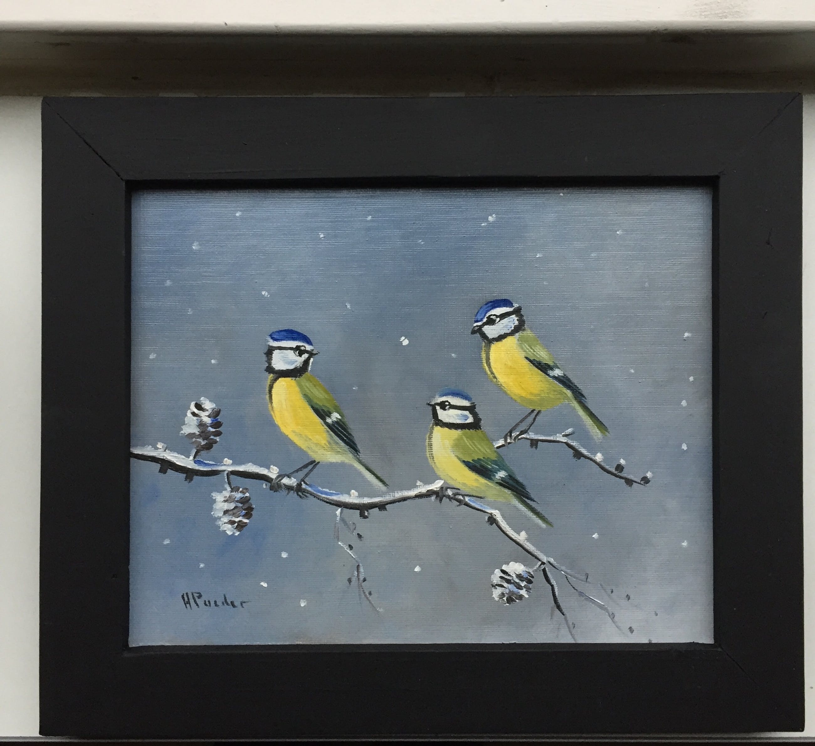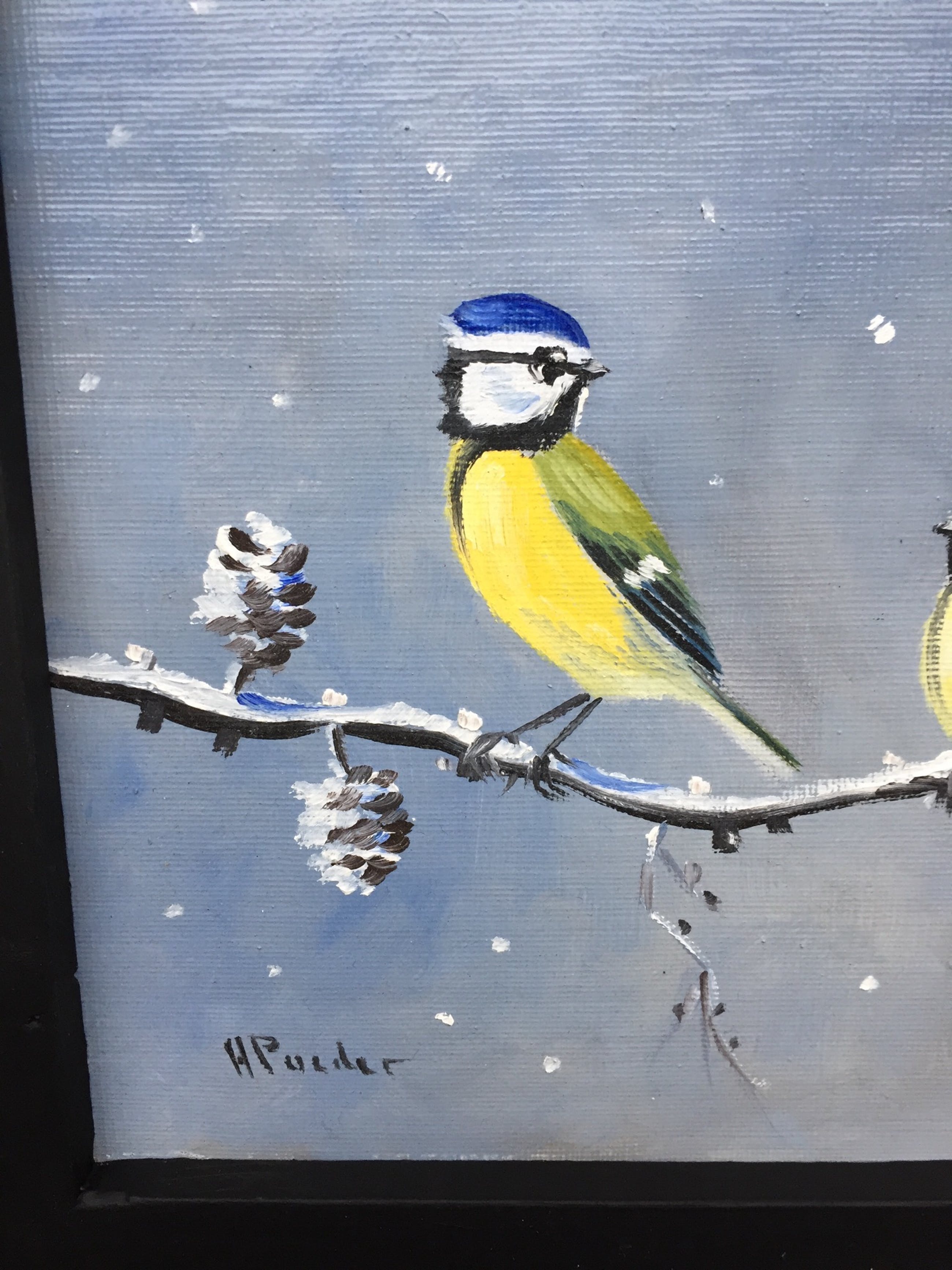 Super leuk schilderij op doek van 3 pimpel meesjes in de winter gesigneerd h poeder links onder , leuk schilderij om het thuis gezelliger te maken voor de winter dag .