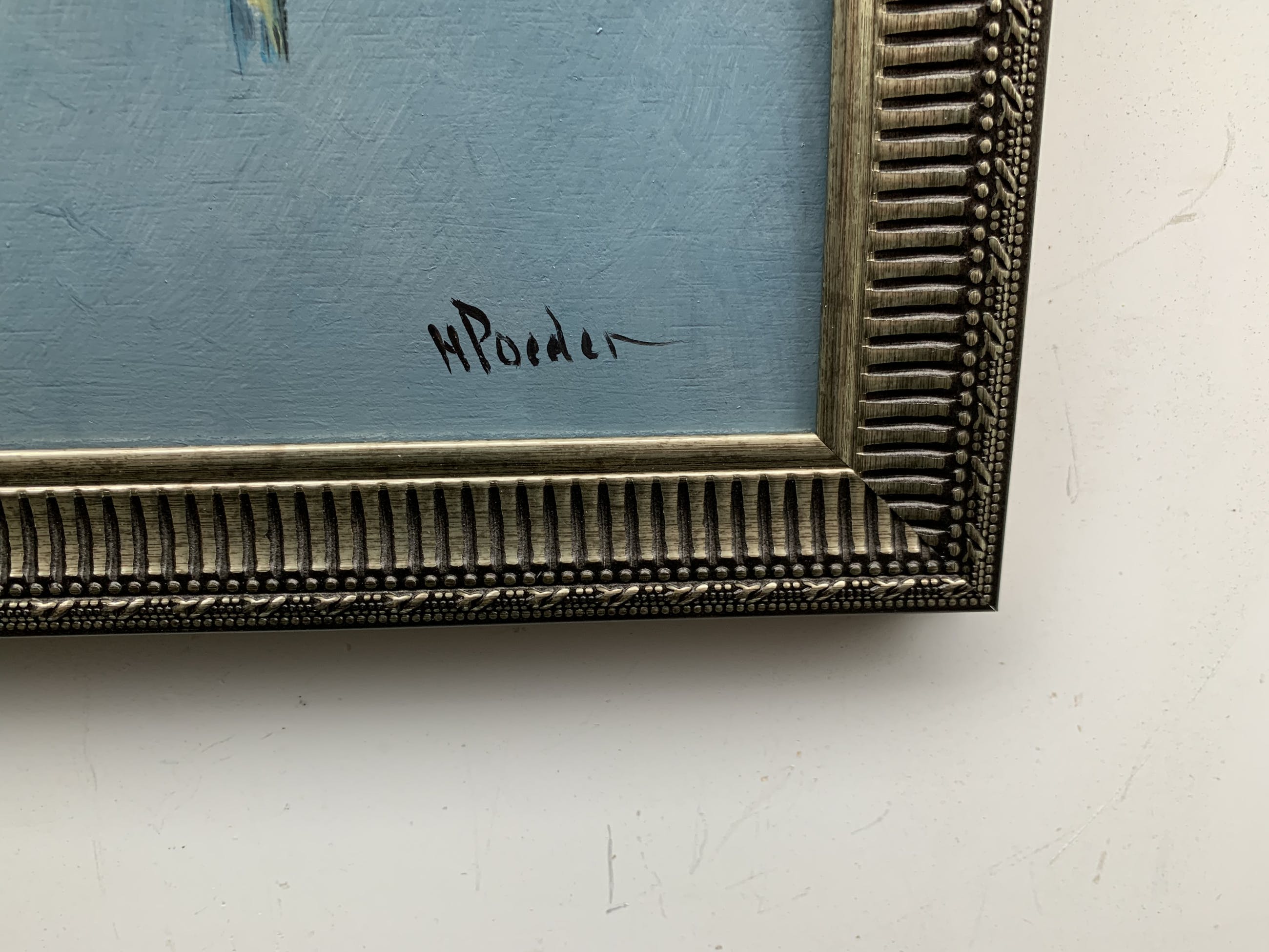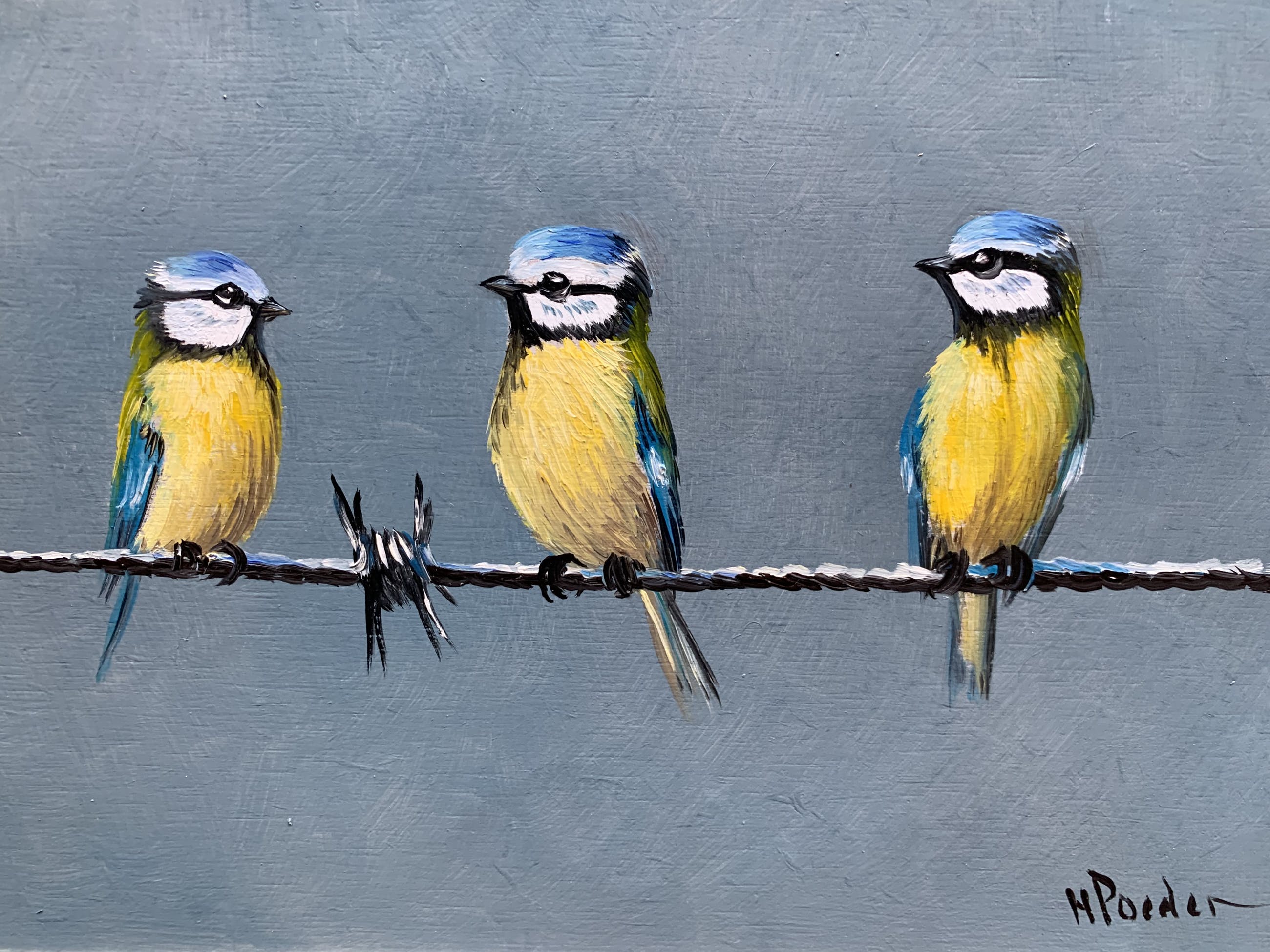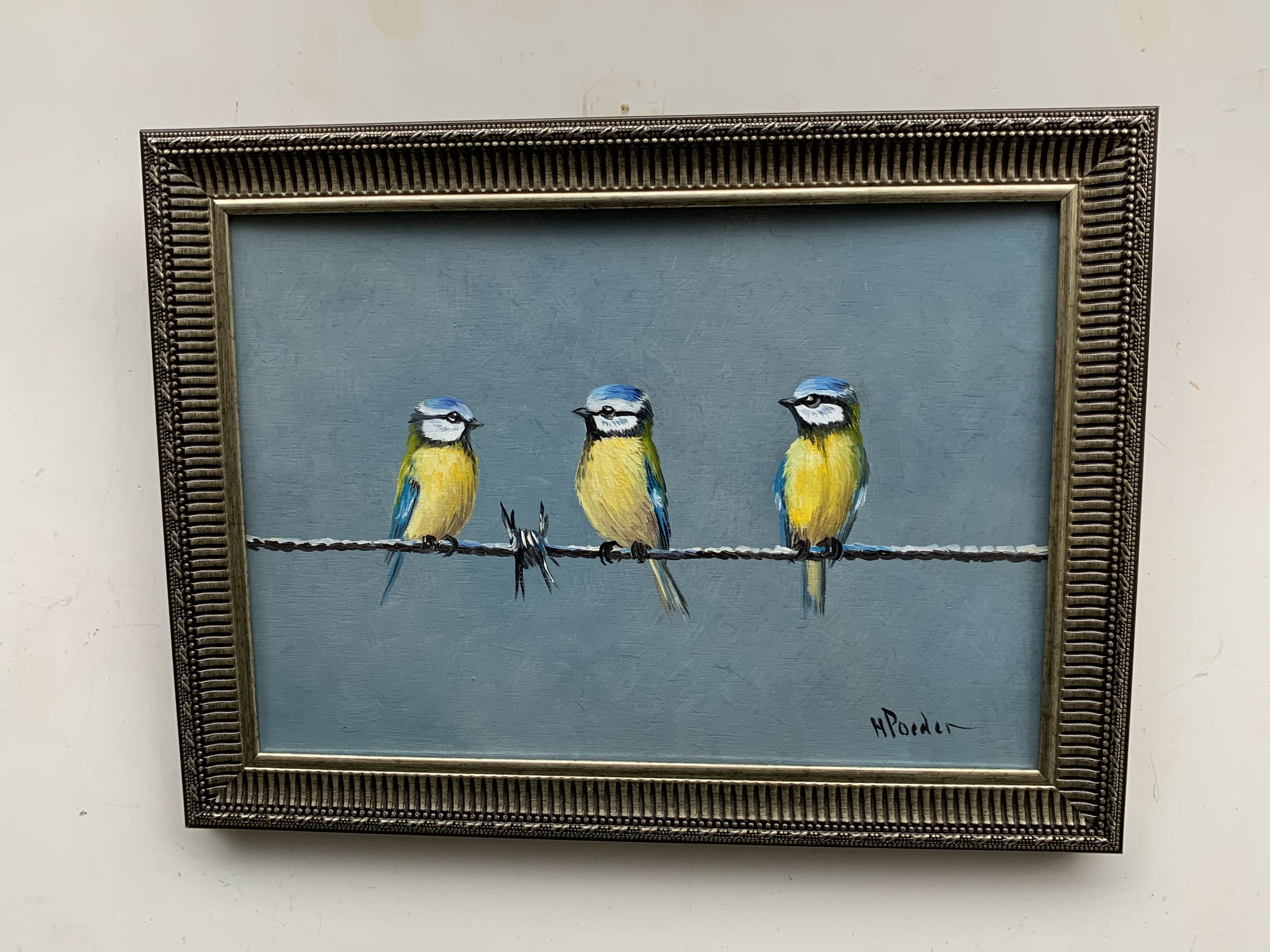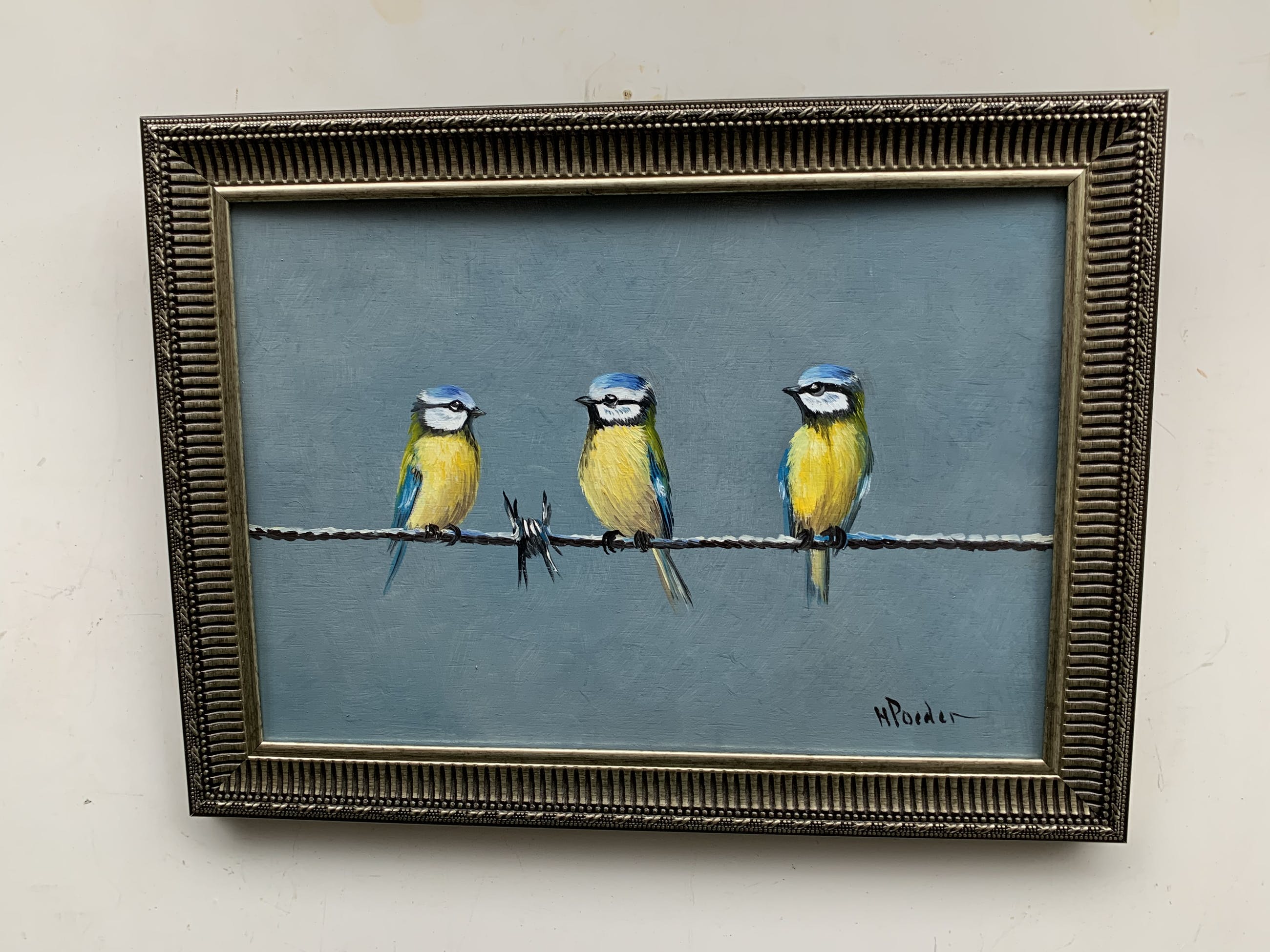 Leuk schilderij met 3 pimpelmeesje op het besneeuwde prikkeldraad rechts onder gesigneerd h poeder geboren (geboren1964) zie ook rijks kunst en documentaties in Denhaag( rkd) internet
