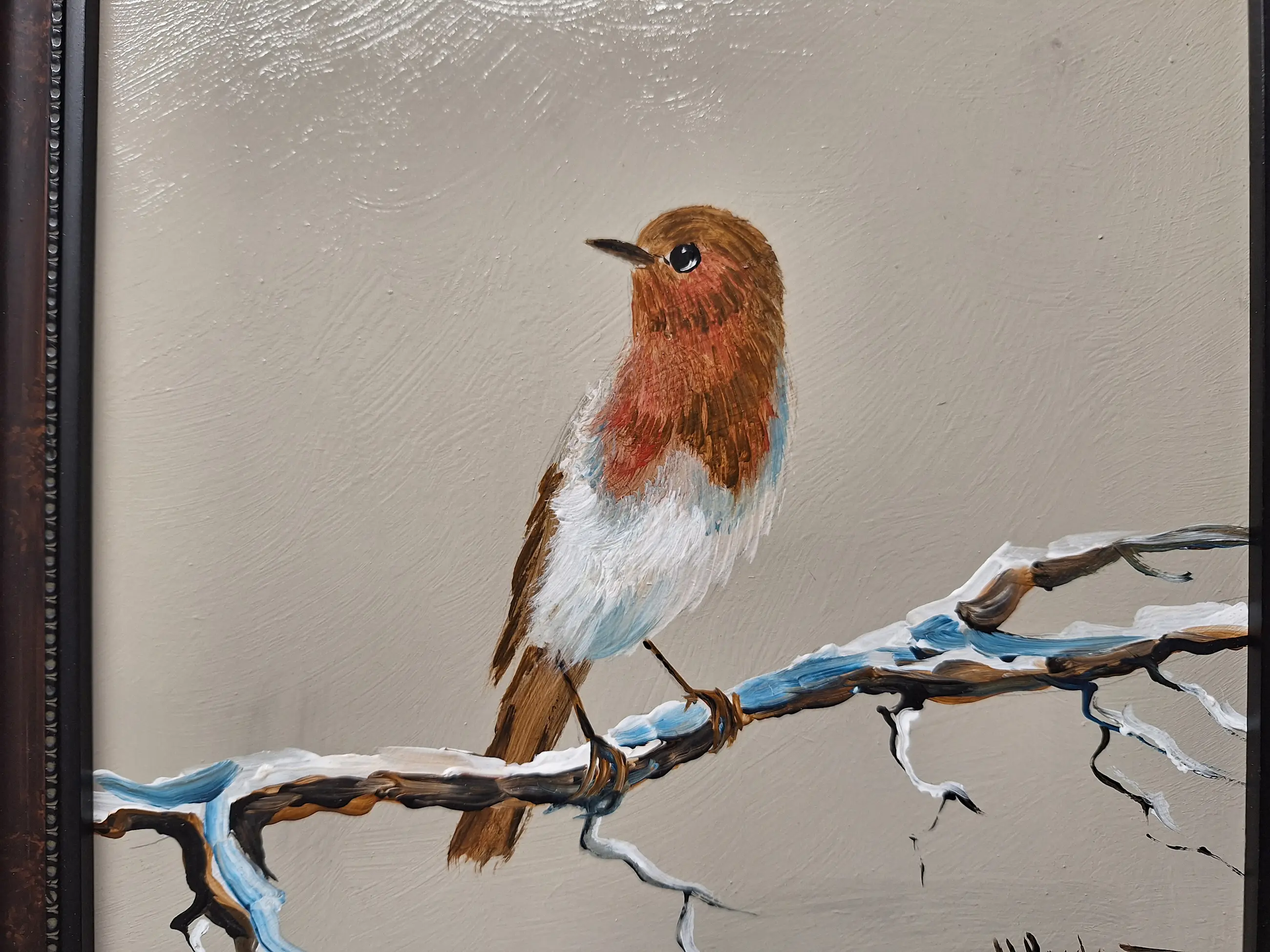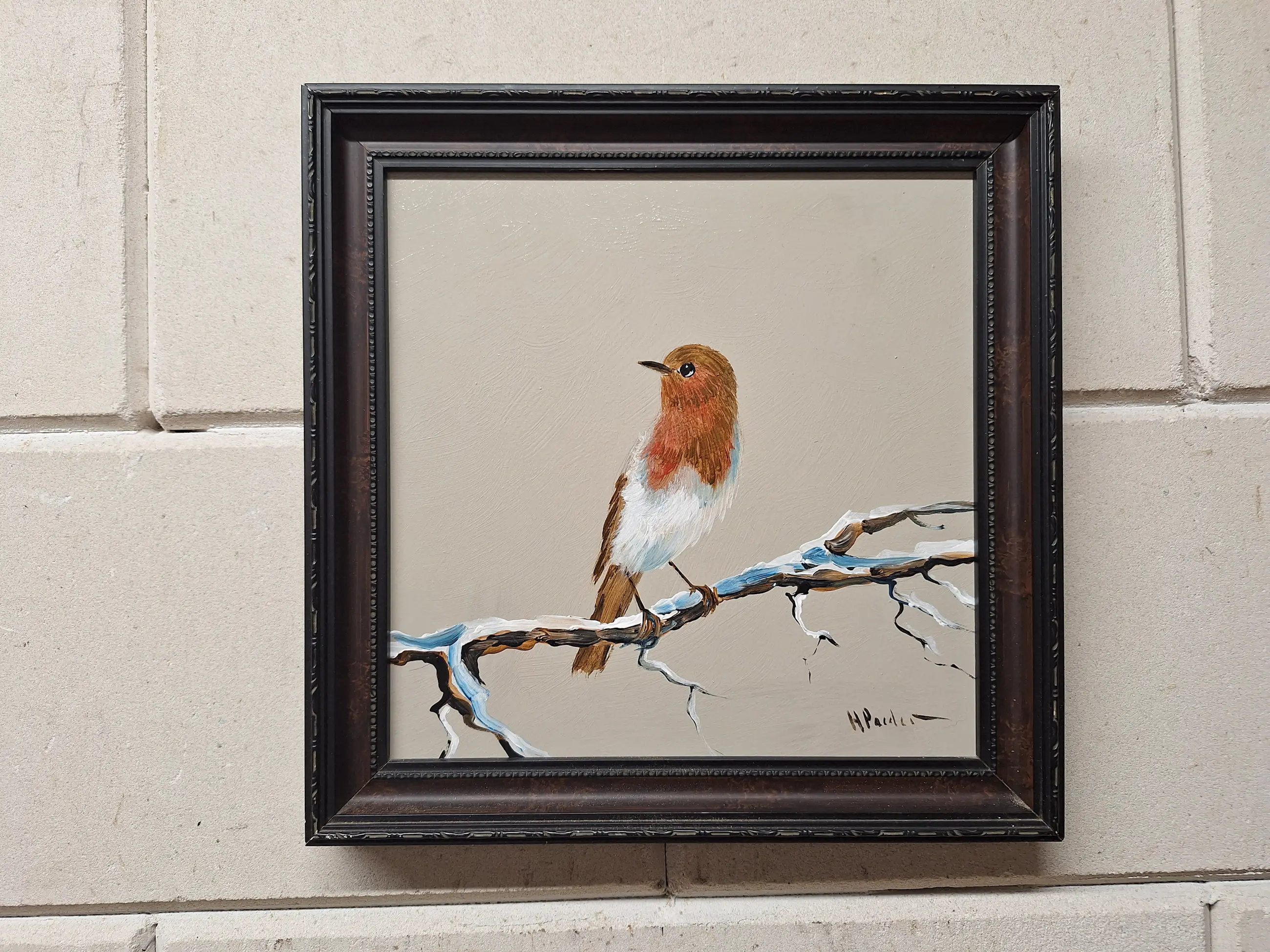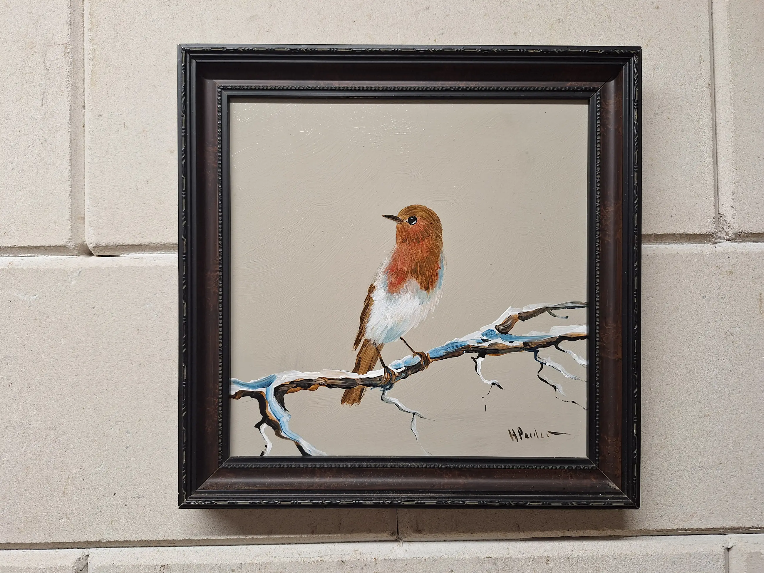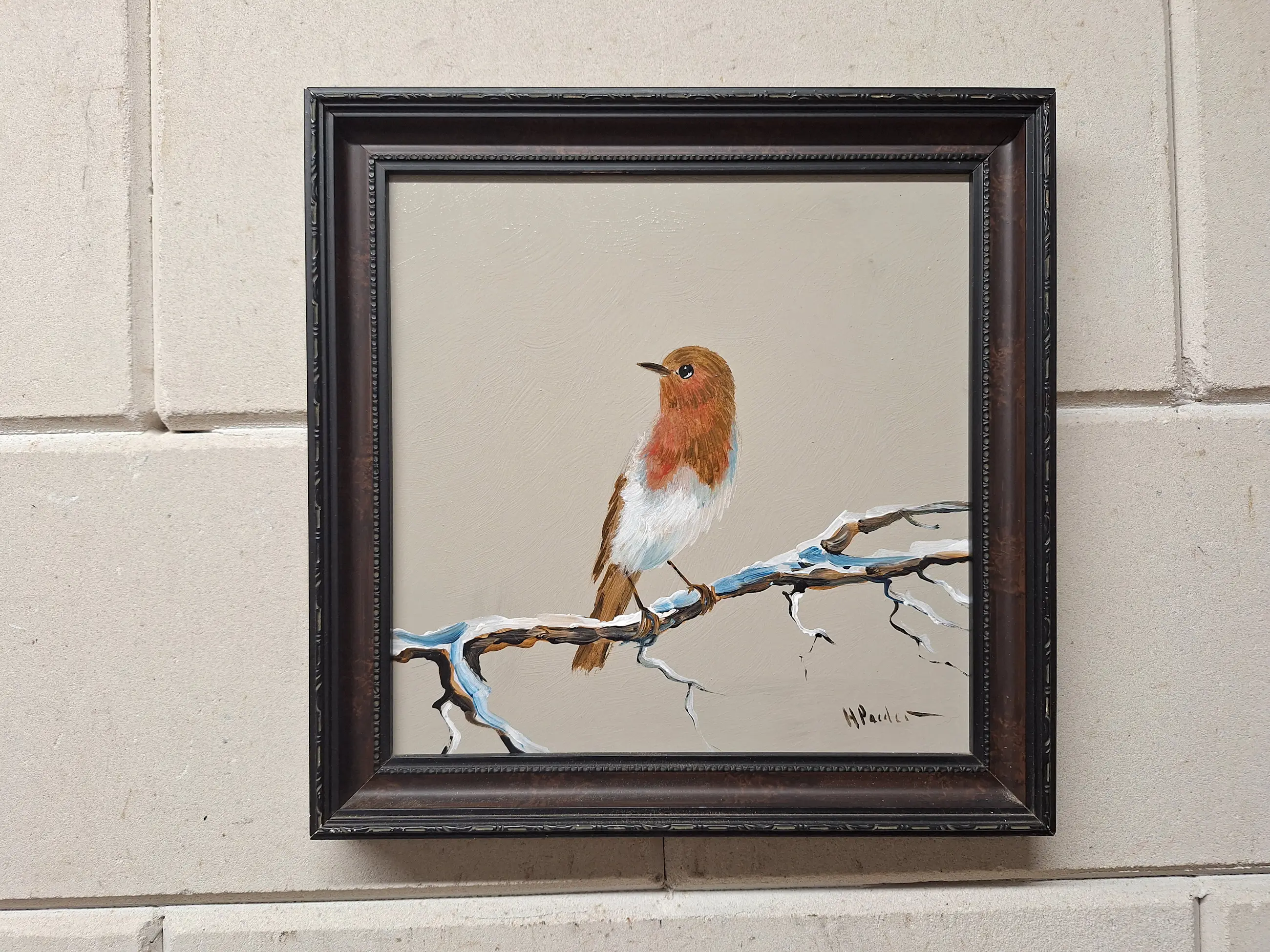 Een erg mooi en gaaf schilderij met een Roodborstje Maat met mooie lijst is 29 bij 29 Gesigneerd H Poeder