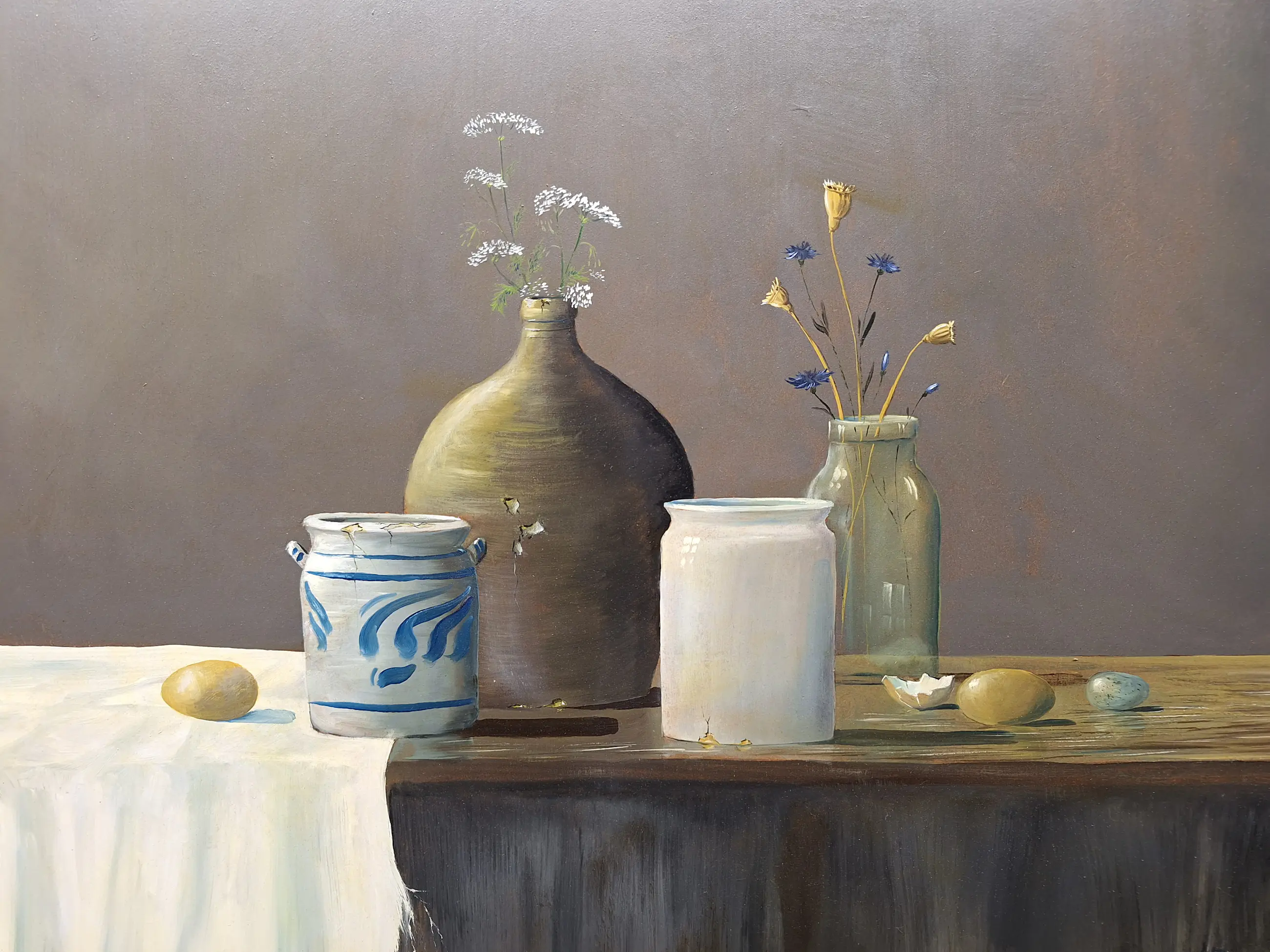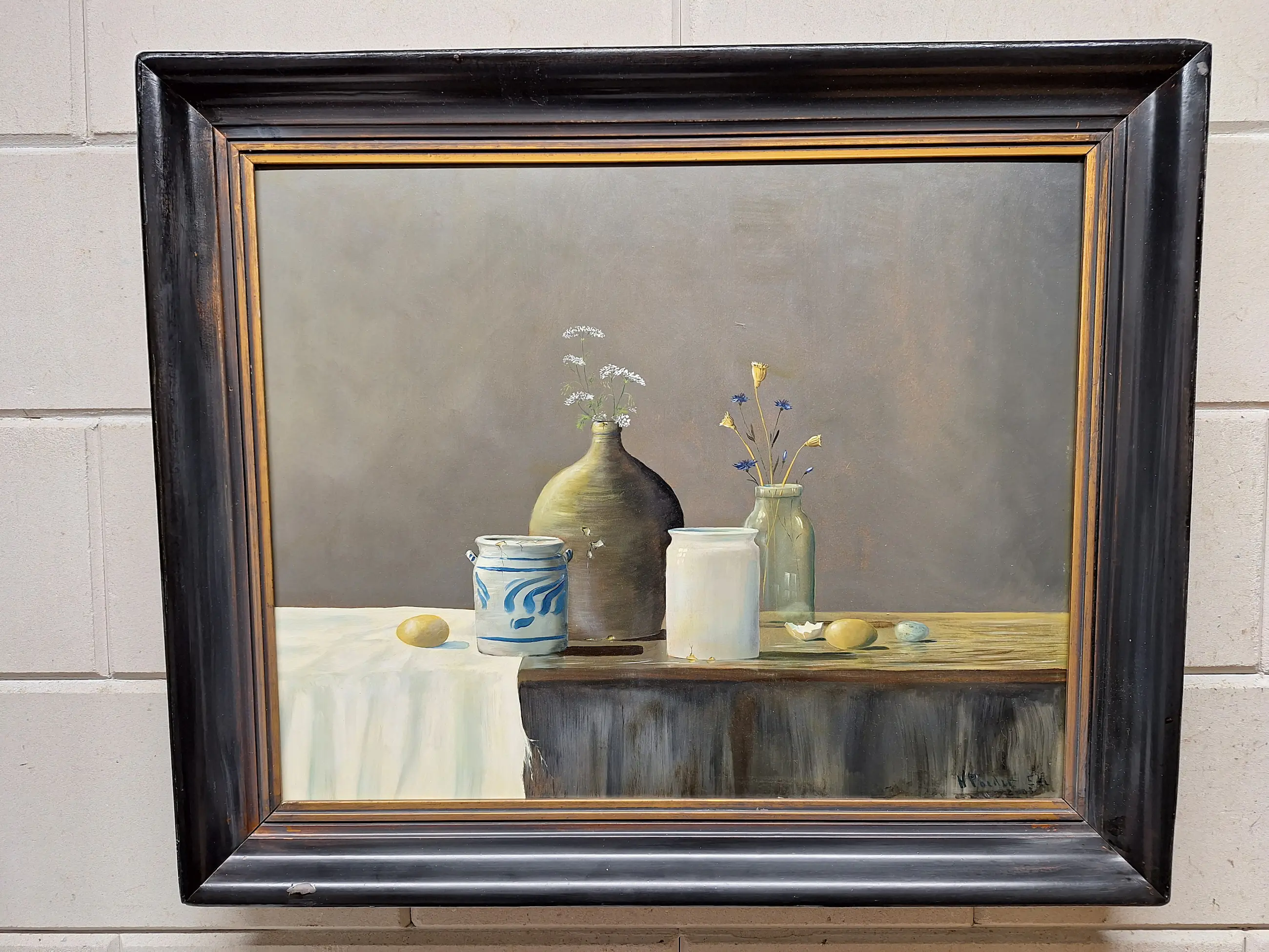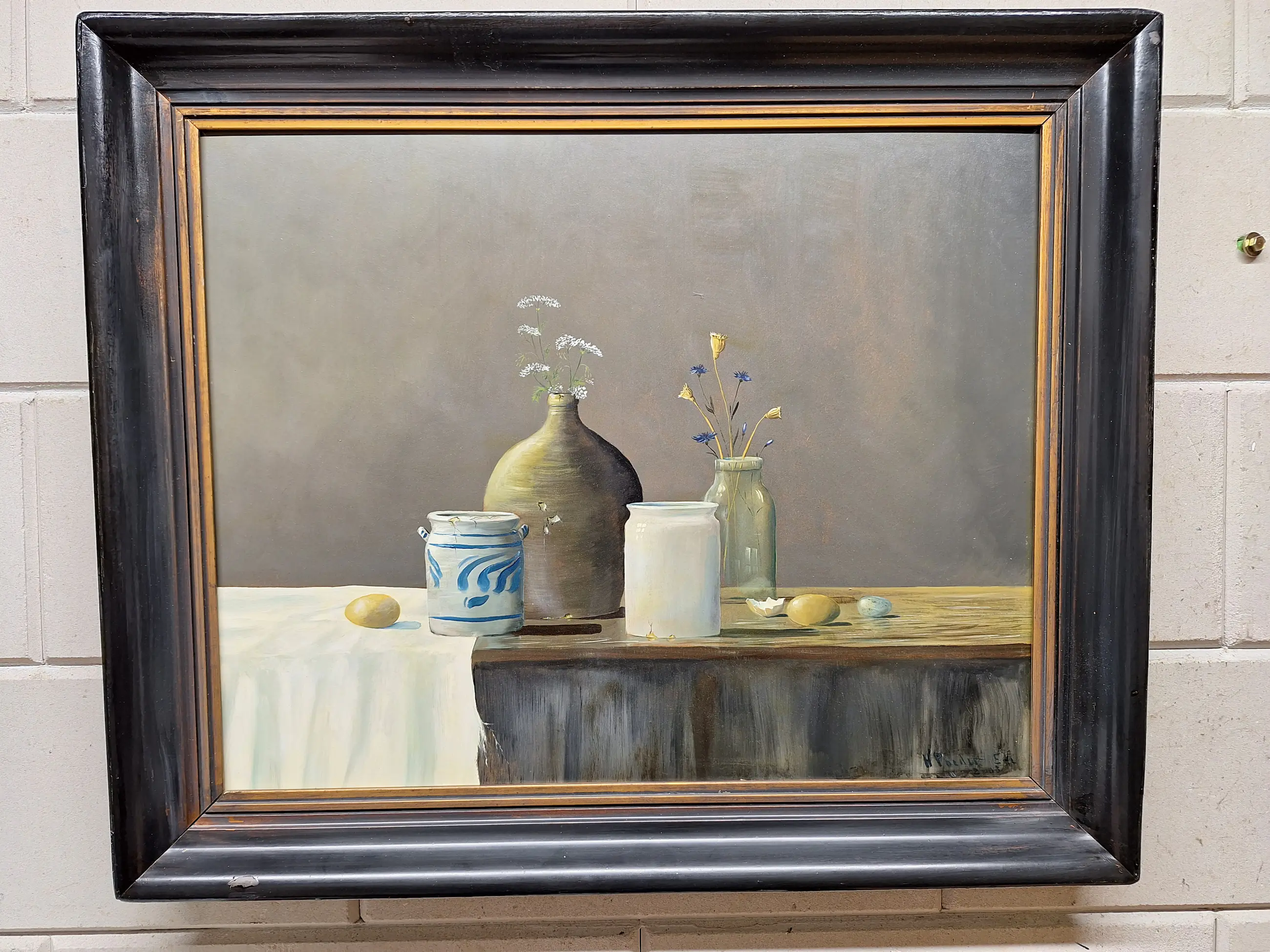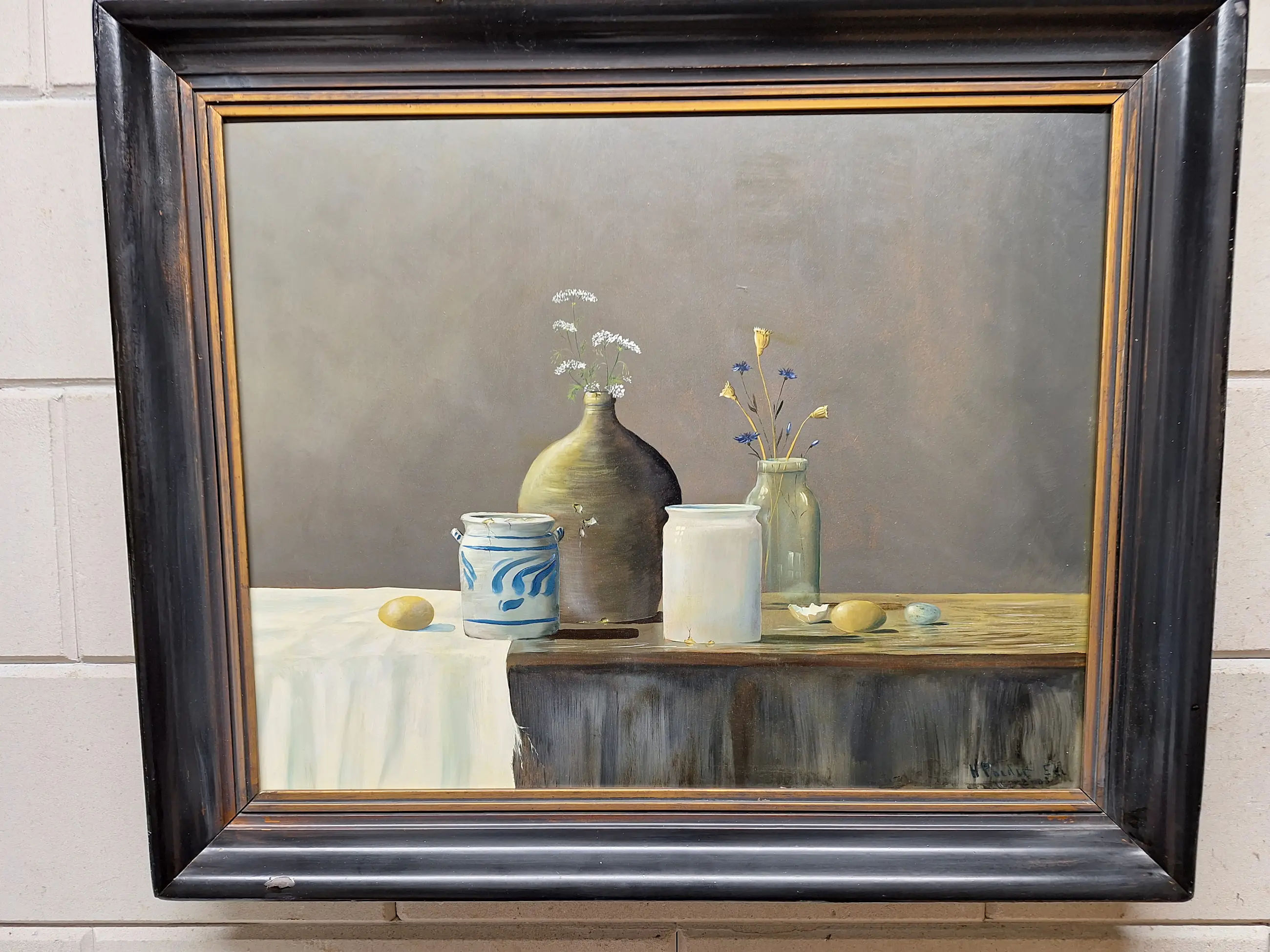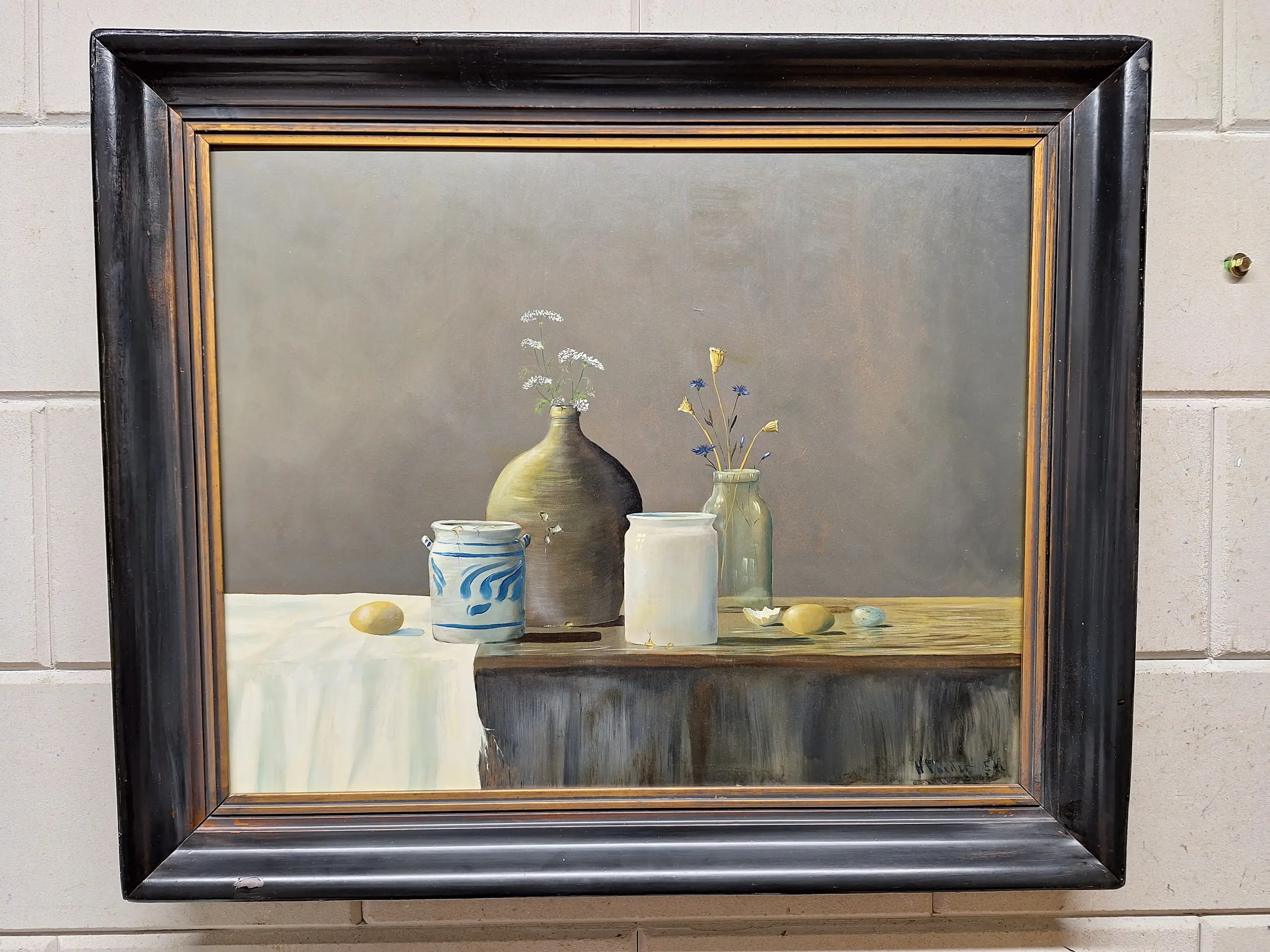 Een erg mooi stilleven met Vaasje met bloemen en Eieren en twee aardewerk Potten Maat met lijst is 60 bij 70 Gesigneerd en gedateerd H Poeder 2003