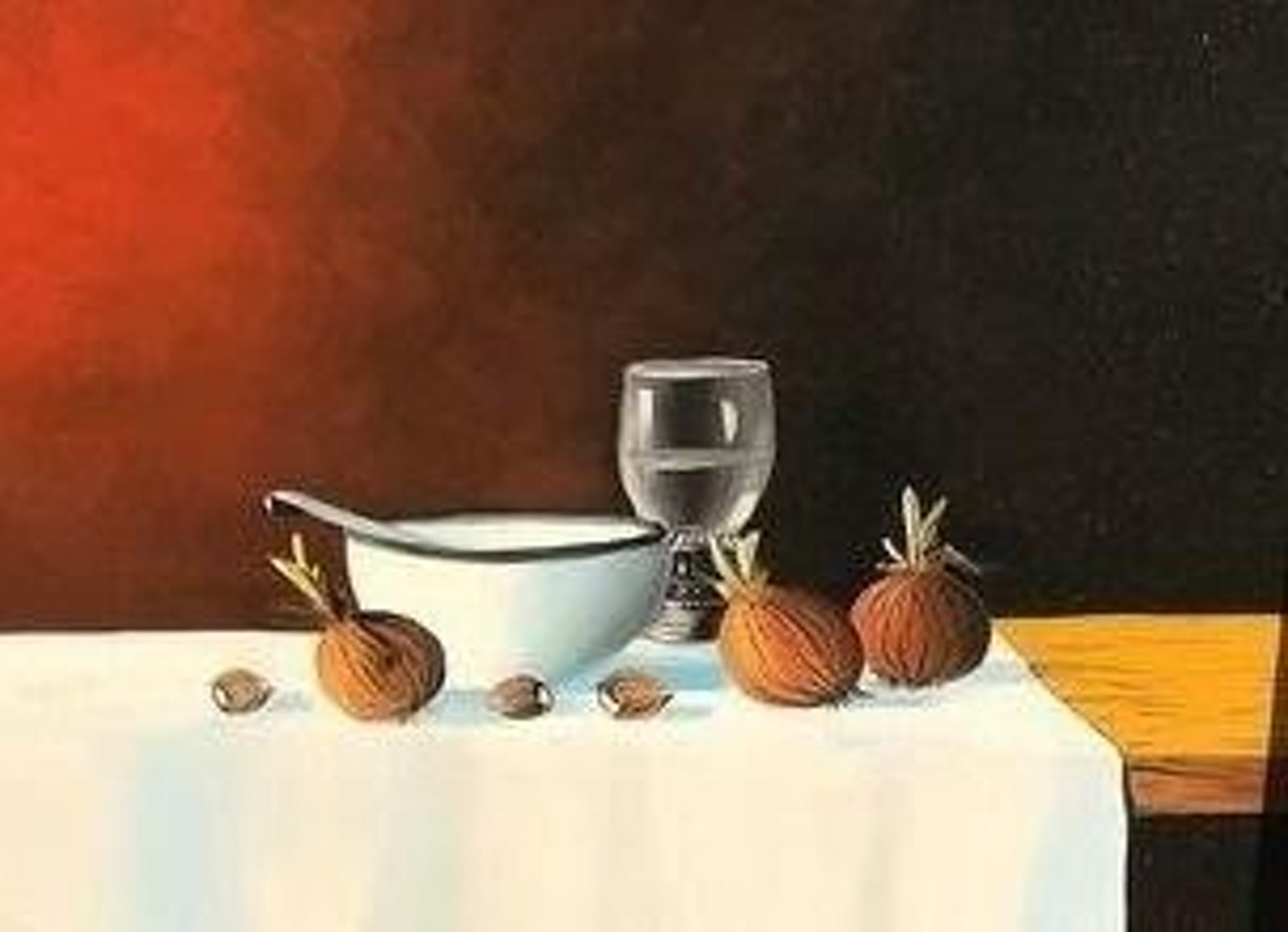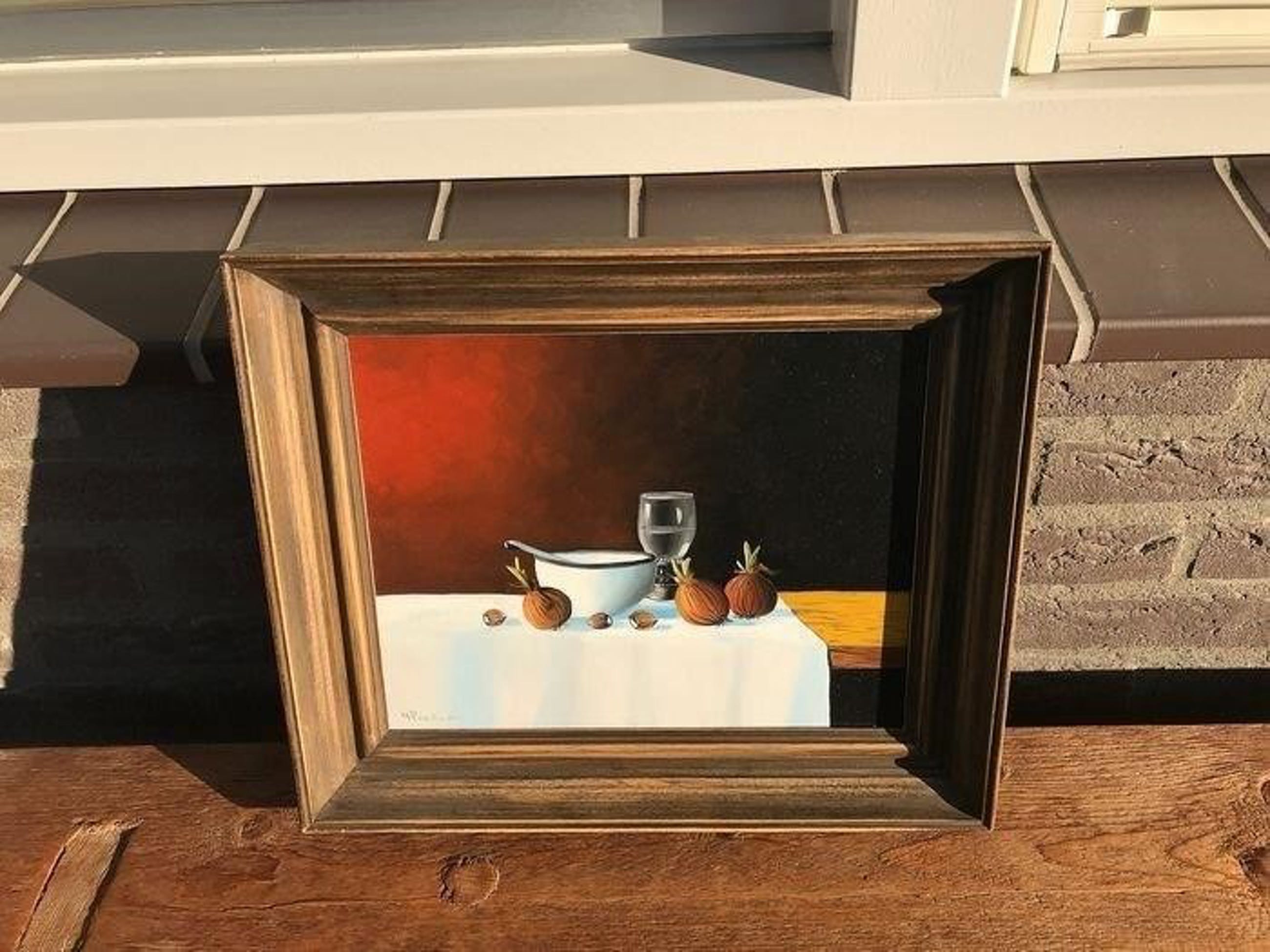 Stilleven met diverse attributen. Geschilderd door Henk Poeder. 21 eeuw. Techniek: olieverf op paneel. Gesigneerd aan de linker onderzijde. De afmetingen van het doek zijn: 30 cm x 24 cm. Inclusief de lijst zijn de afmetingen: 38 cm x 32 cm.