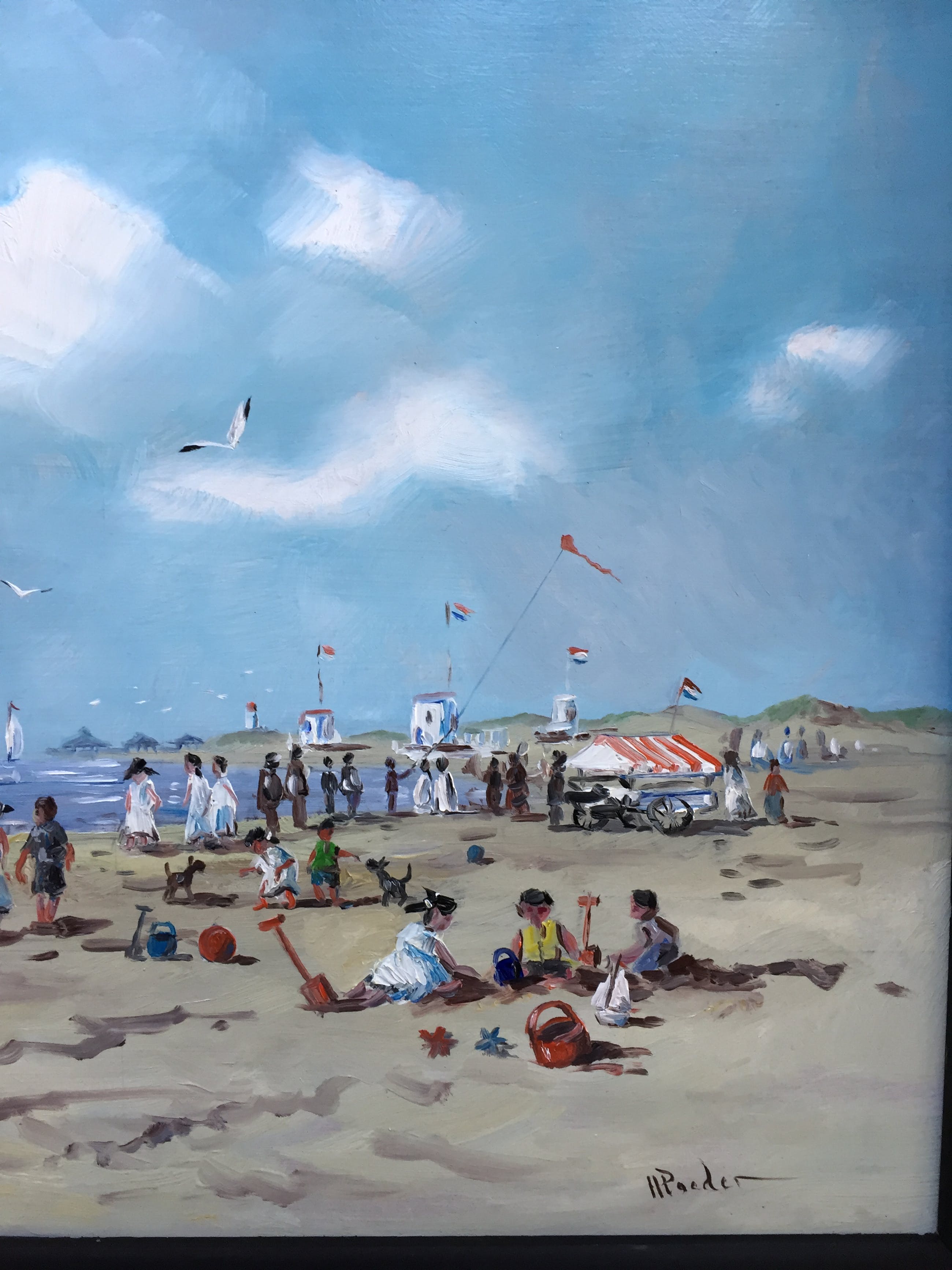 Olieverf op paneel door h poeder betreft strand bij scheveningen met balonne man Gesigneerd rechts onder verder spreekt het schilderij voor zich .