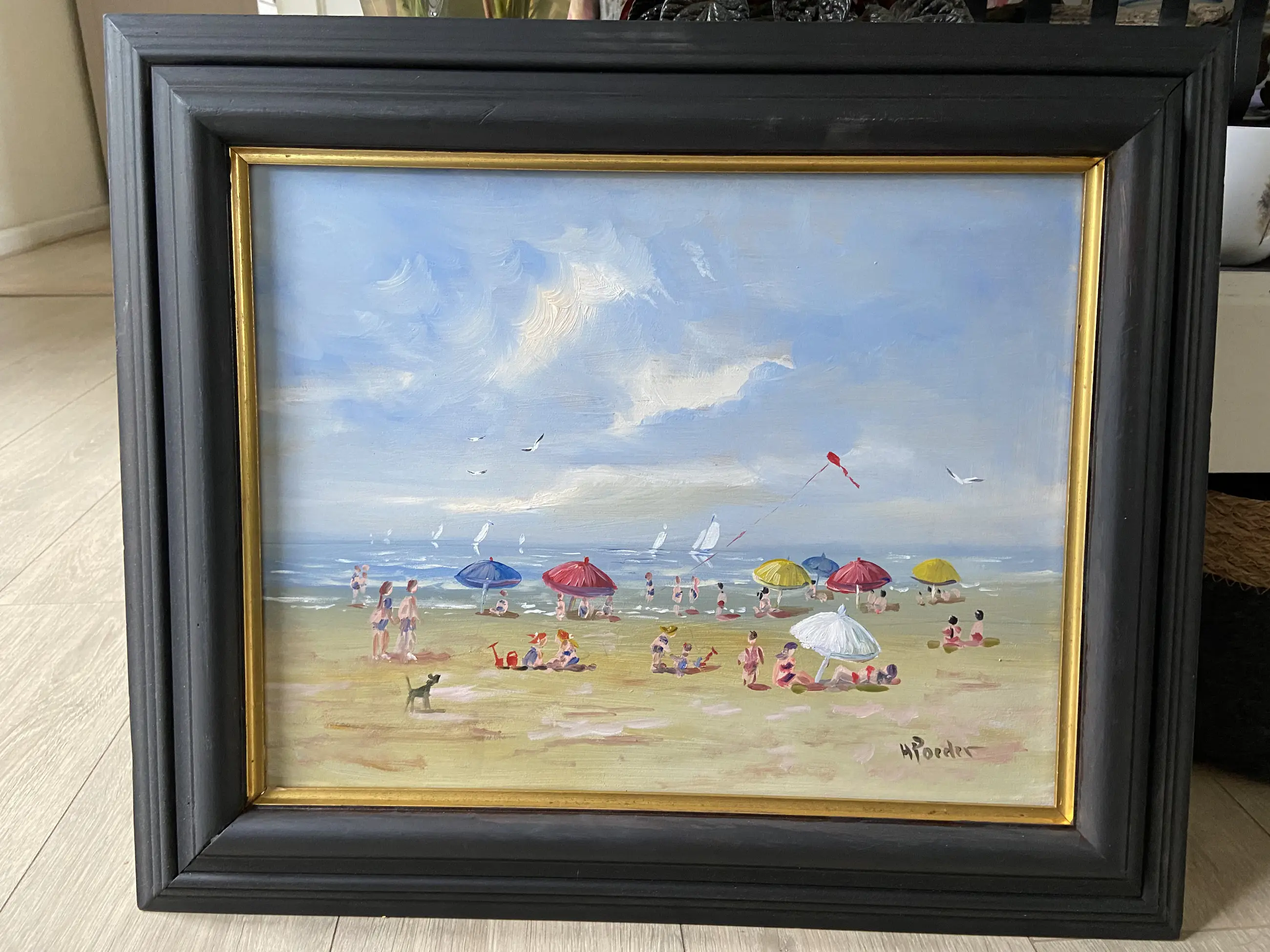 Erg leuk werk van H Poeder geb 1964 betreft een strandgezicht met badgasten dit impressionistische werk is rechts onder gesigneerd H Poeder