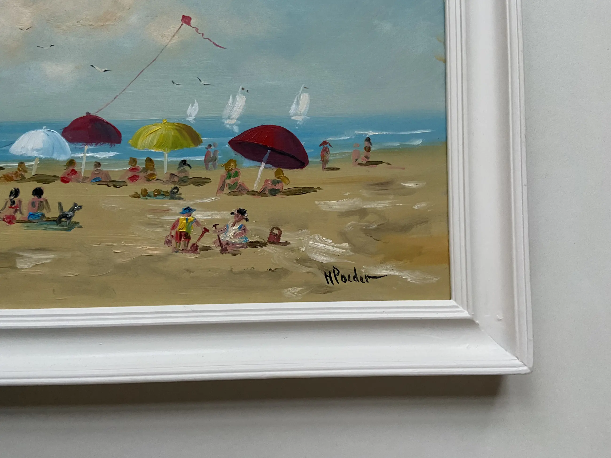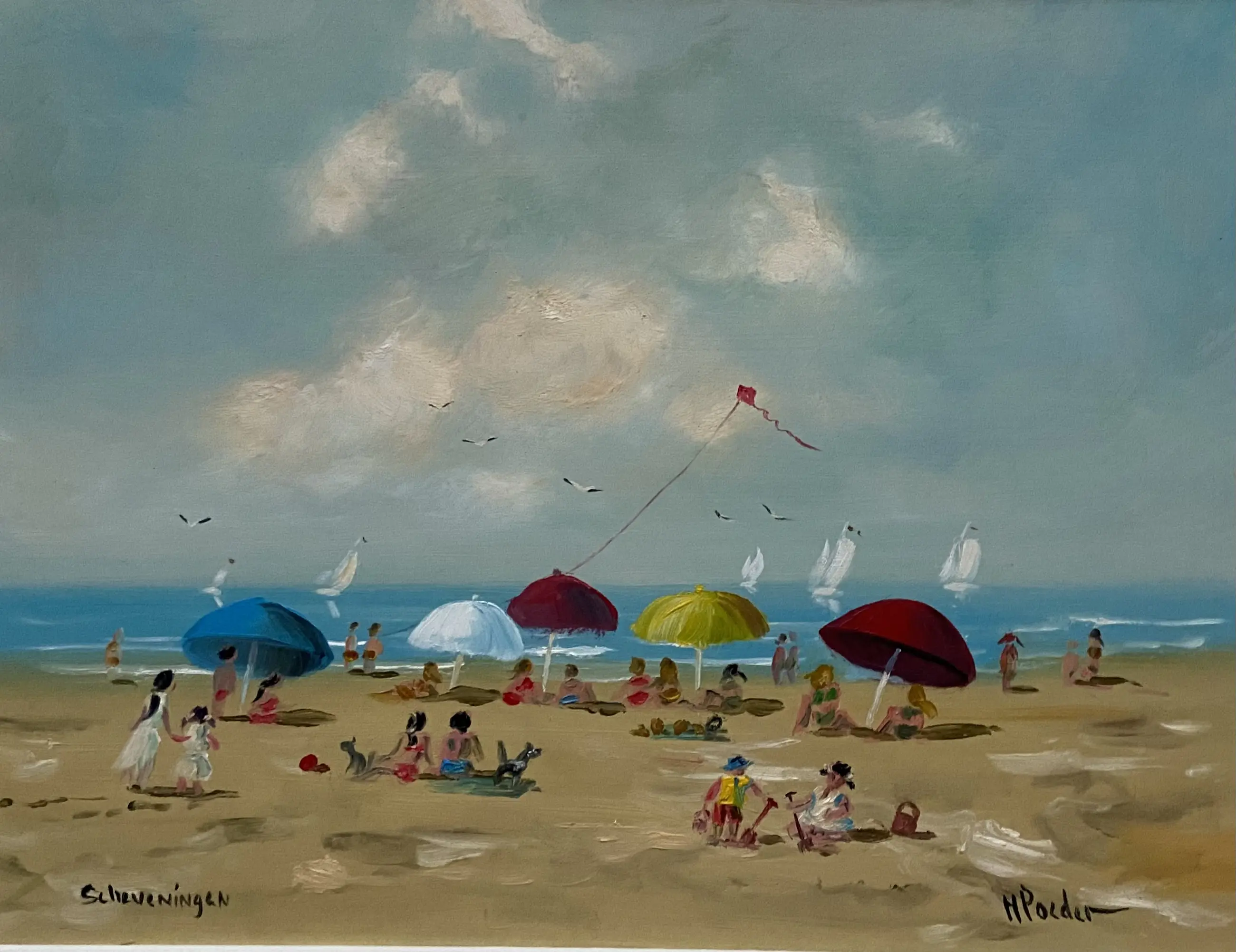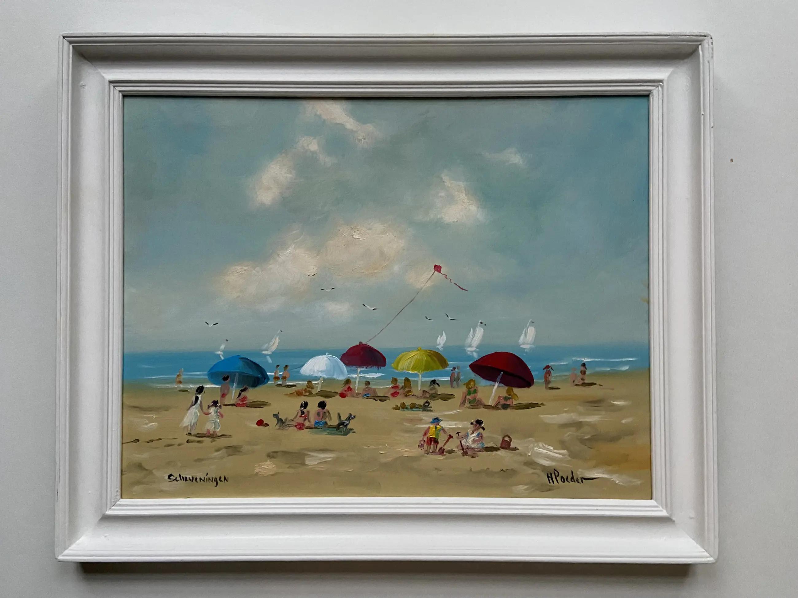 Prachtig strand gezicht nabij Scheveningen een heerlijk weertje om naar het strand te gaan en de vlieger gaat mee , scheepjes op het water wat wil je nog meer het schilderij zit in een nette oudere witte lijst en rechts onder gesigneerd HPoeder .H Poeder geb 1964 ( info rkd in Denhaag)