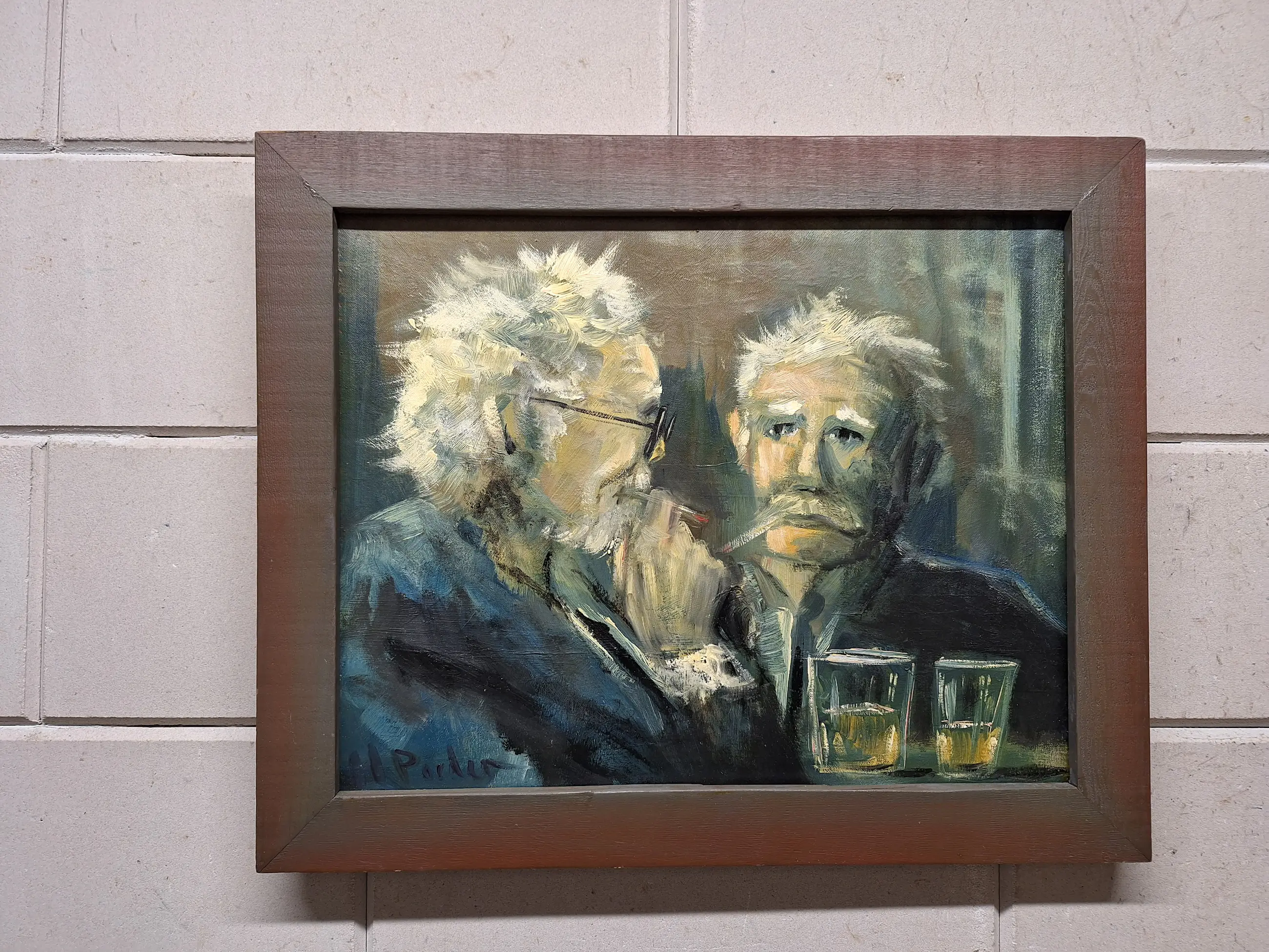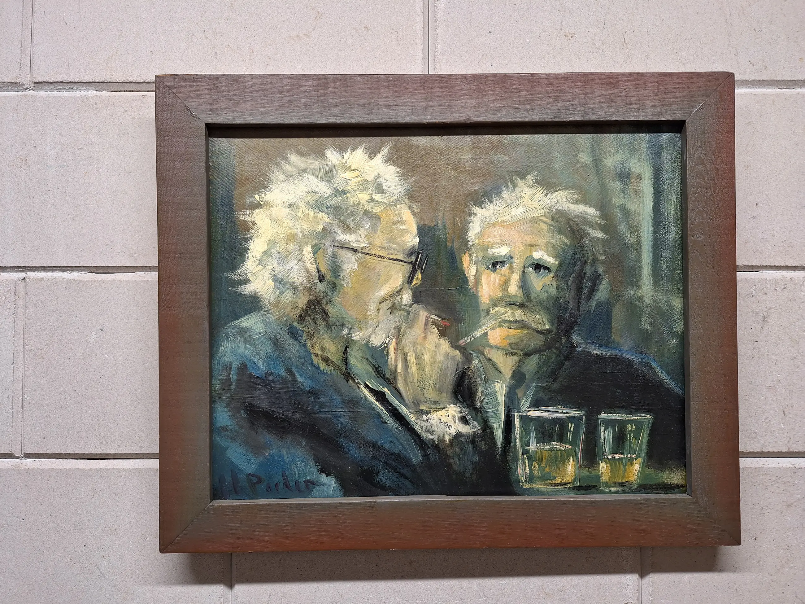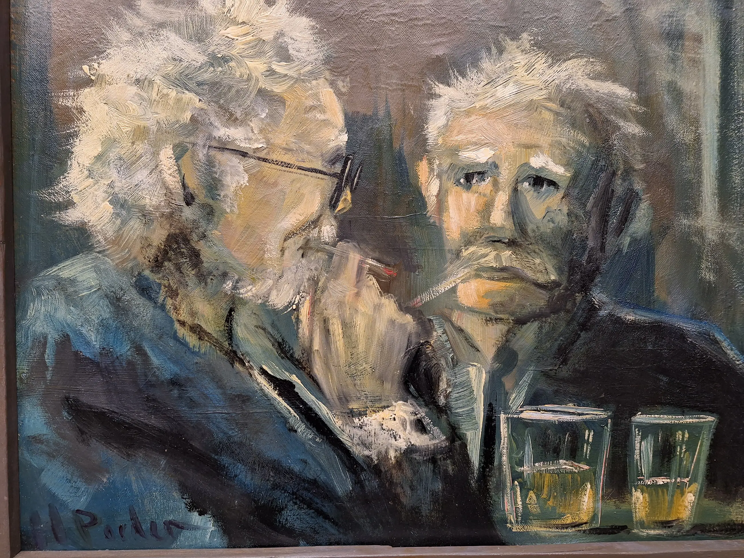 Een mooi oud schilderij op doek met twee mannen in een Cafe aan de Borrel Maat is 48 bij 58 Gesigneerd H Poeder