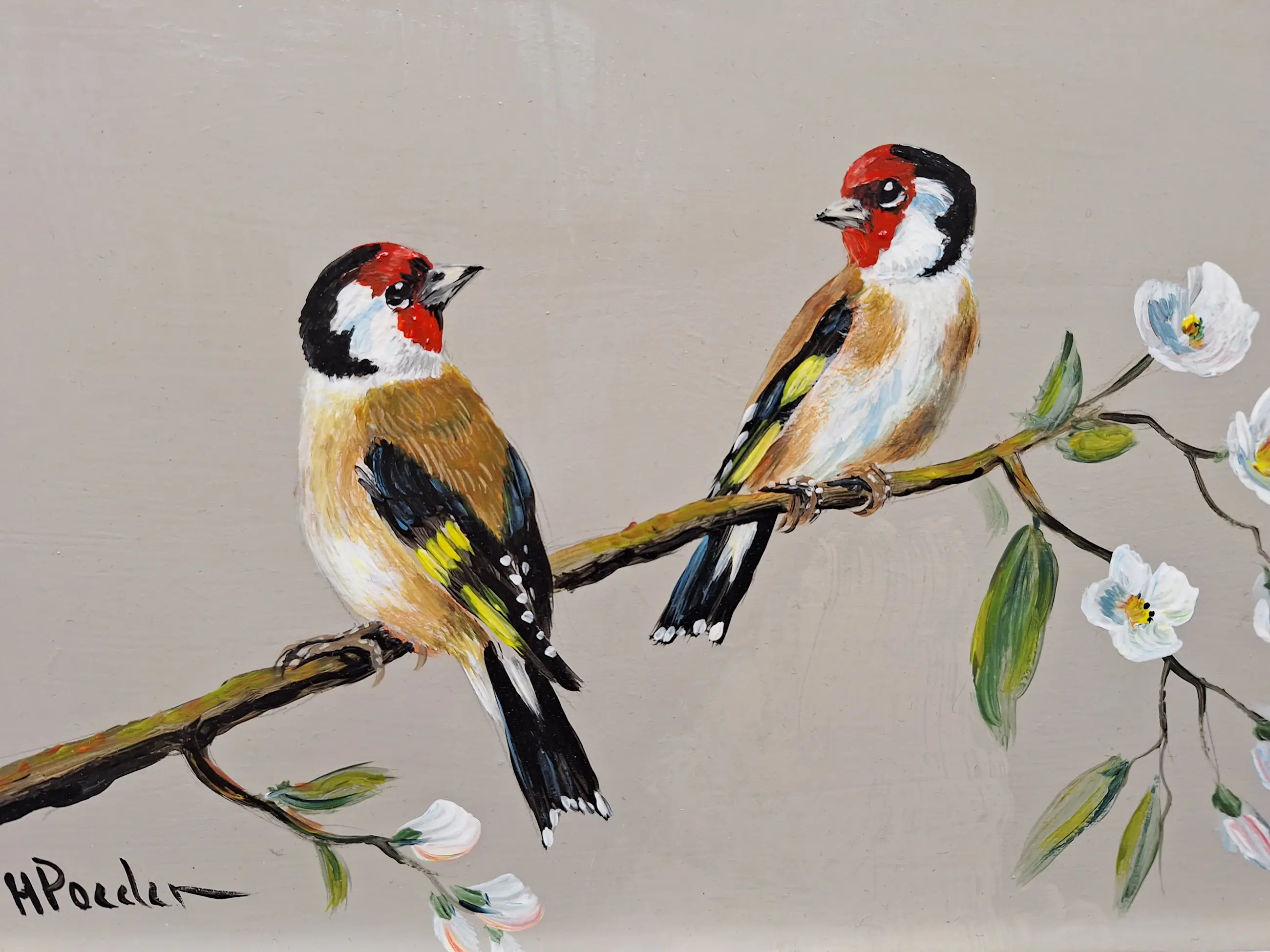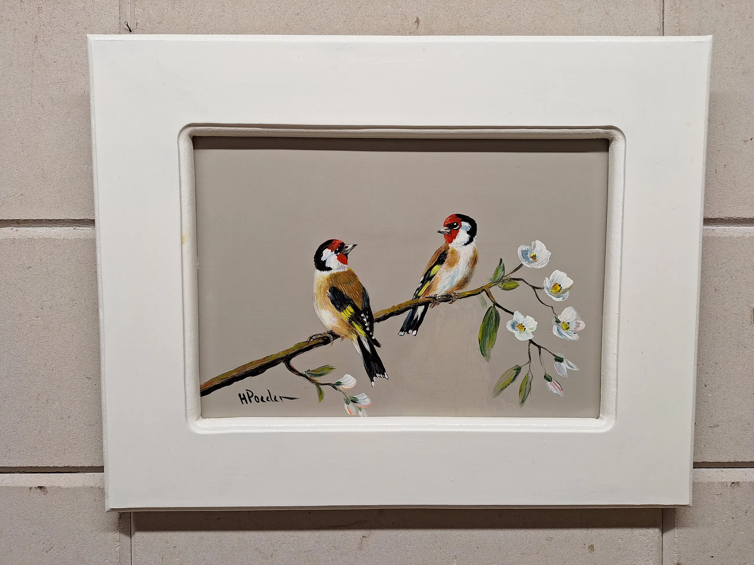 Erg leuk werk van Henk Poeder geb 1964 betreft een schilderij van twee putters ook wel distelvinken genoemd dit schilderij met twee verliefde putters is links onder gesigneerd H Poeder en zit in een nette lijst en kan zo aan de muur Maat is 36 bij 45