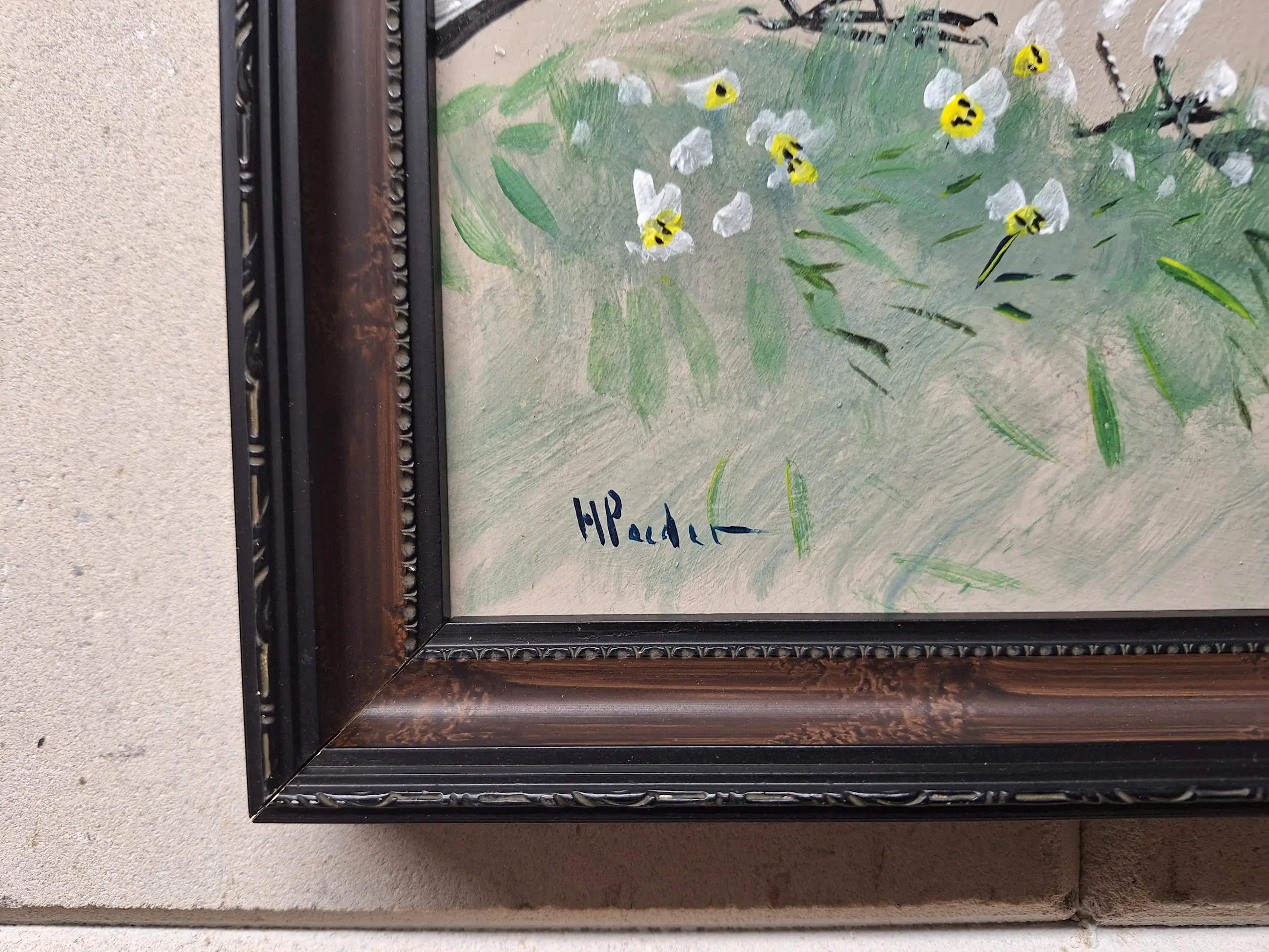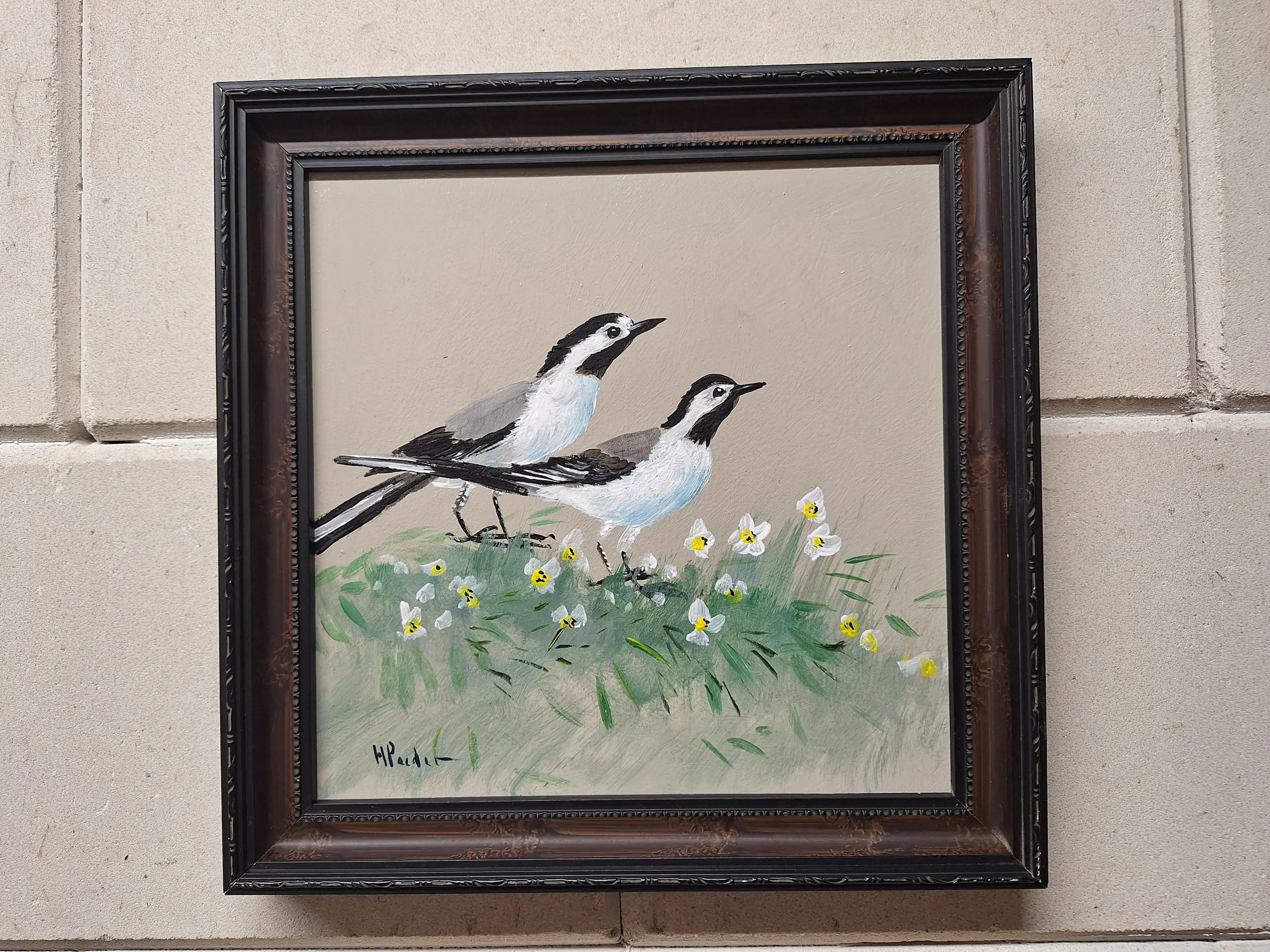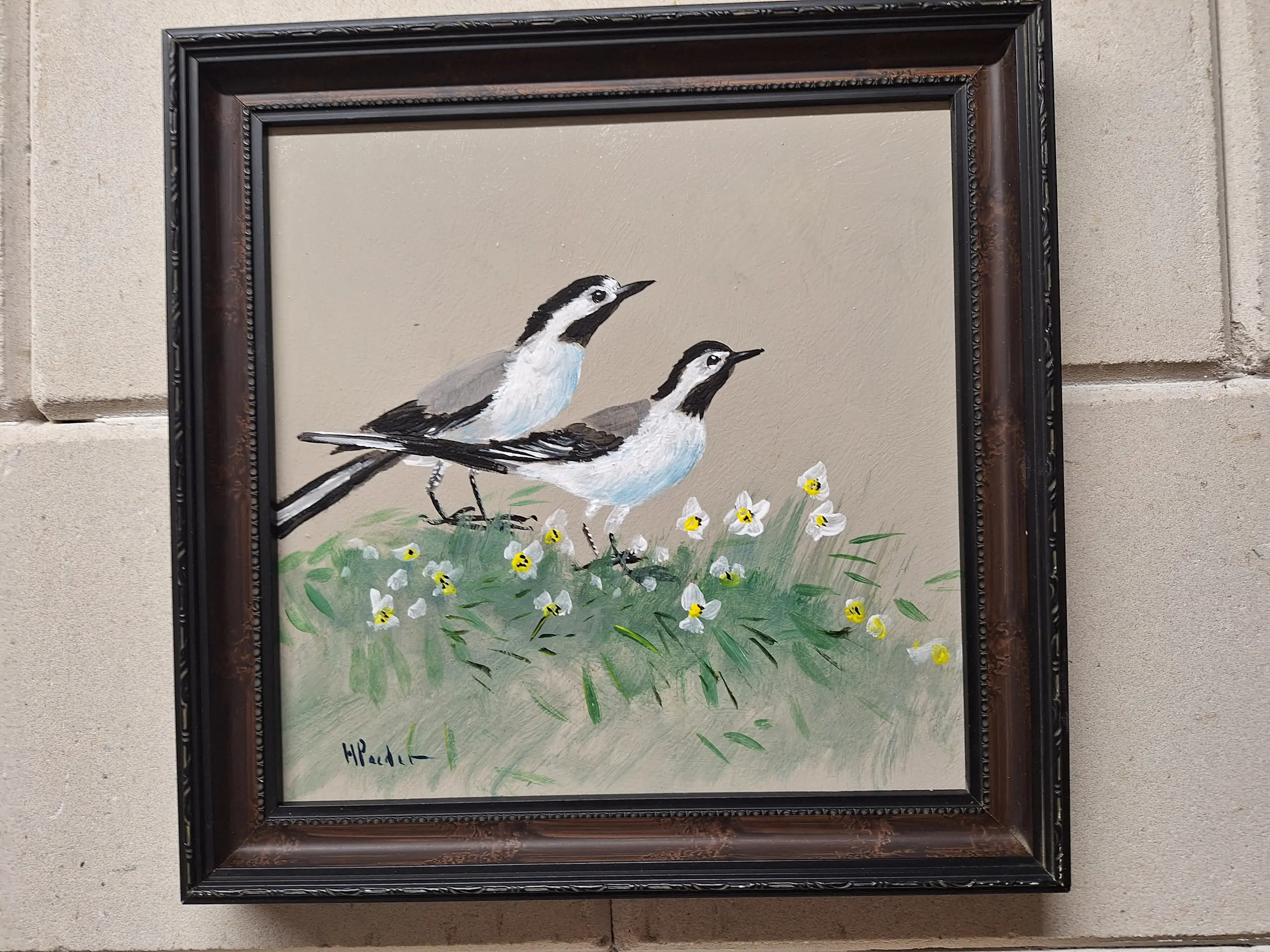 Een erg mooi en gaaf schilderij met twee Witte Kwikstaart vogeltjes Maat met mooie lijst is 29 bij 29 Gesigneerd H Poeder