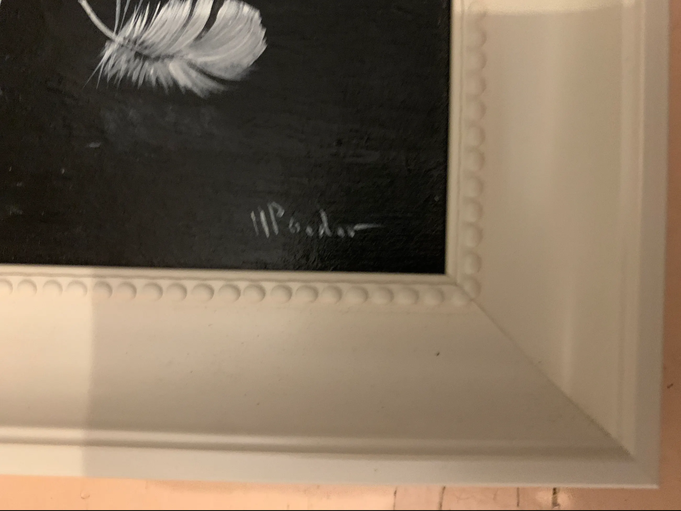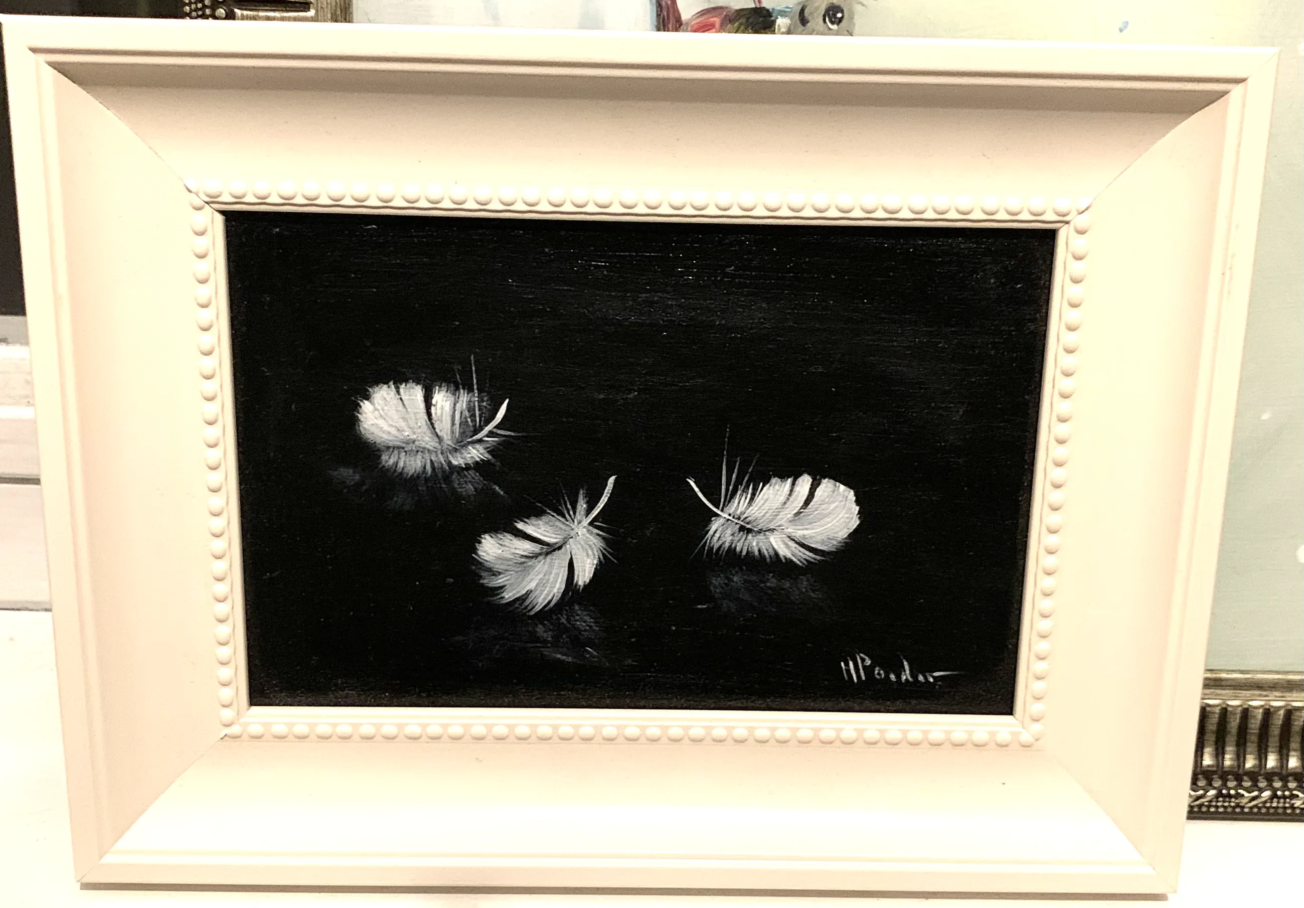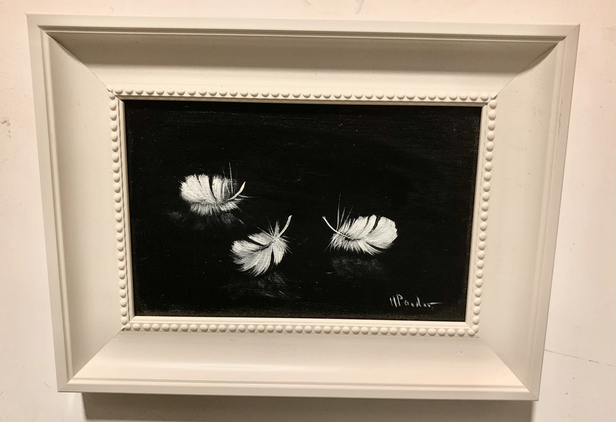 Super leuk werk van H Poeder betreft 3 veertjes en mooi wit lijstje ,fijn schilder werk maar Henk poeder maakt meerde stijlen zo als landschappen zeegezichten dieren impressionistisch werk en stillevens ook info rkd in Denhaag.