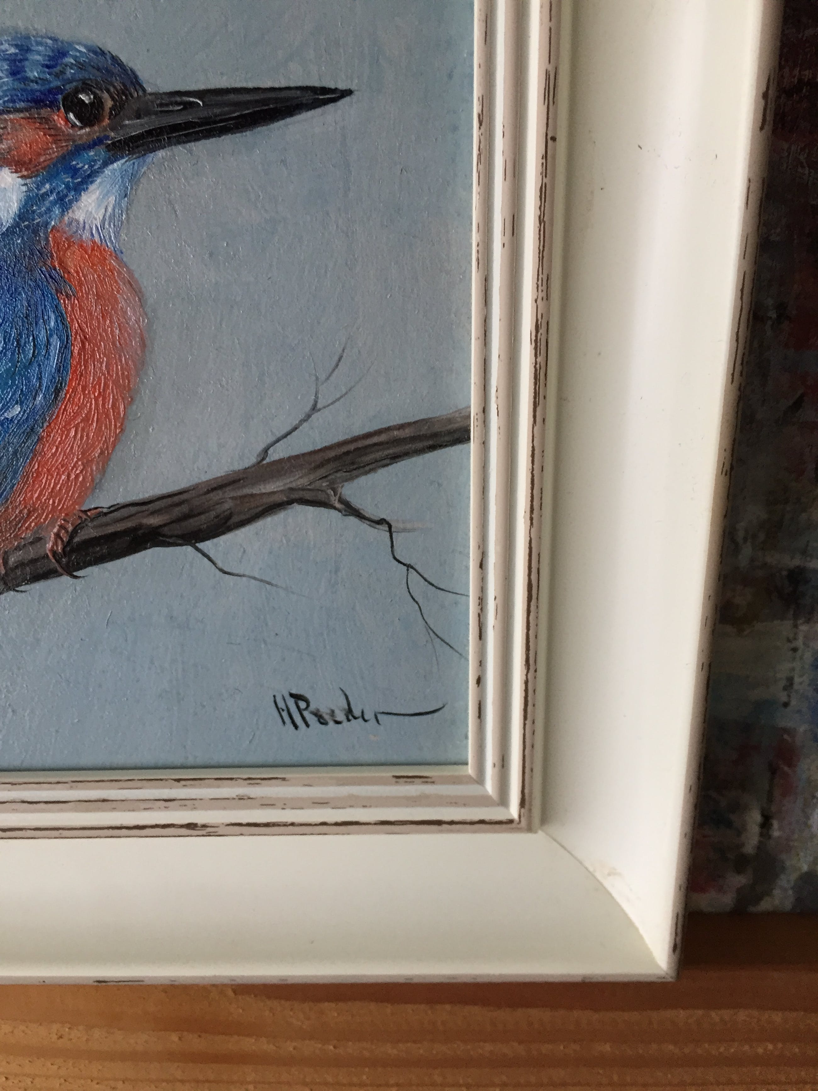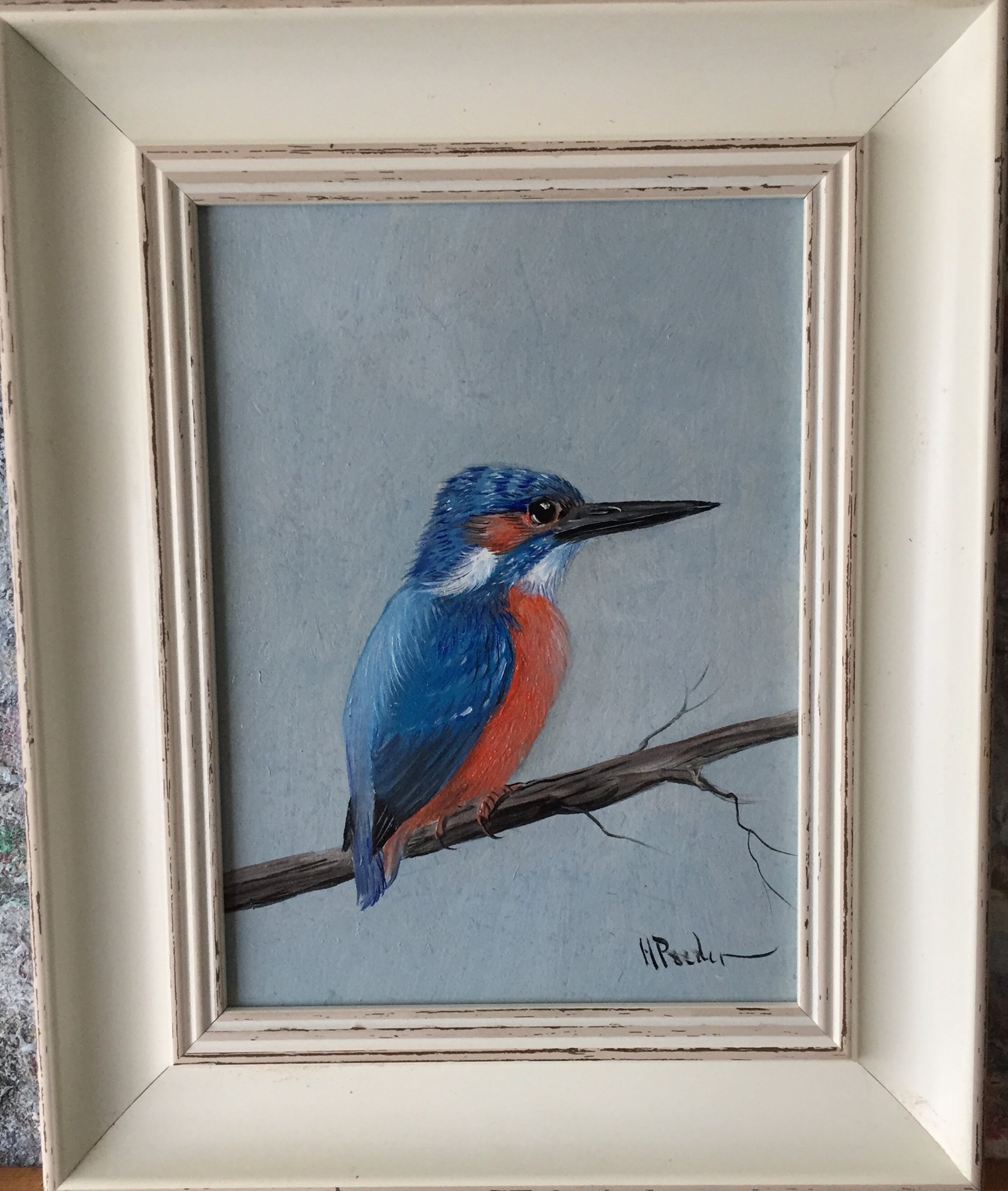 Olieverf op painterboard betreft een ysvogeltje rechts onder gesigneerd h poeder lijst is nieuw en schilderij netjes vernist verder spreekt het schilderij voor zich