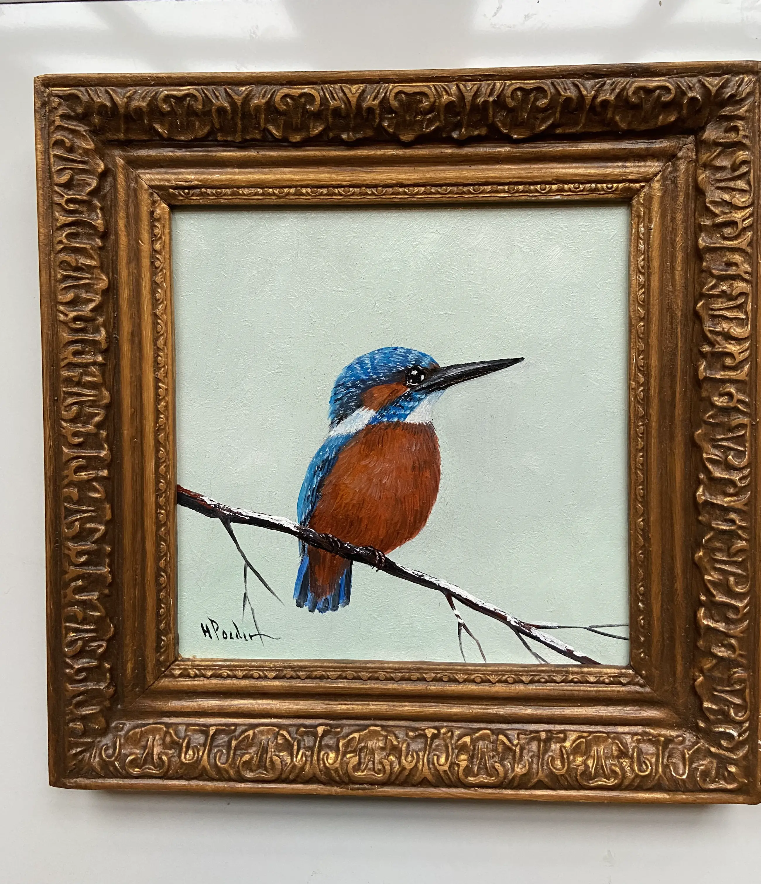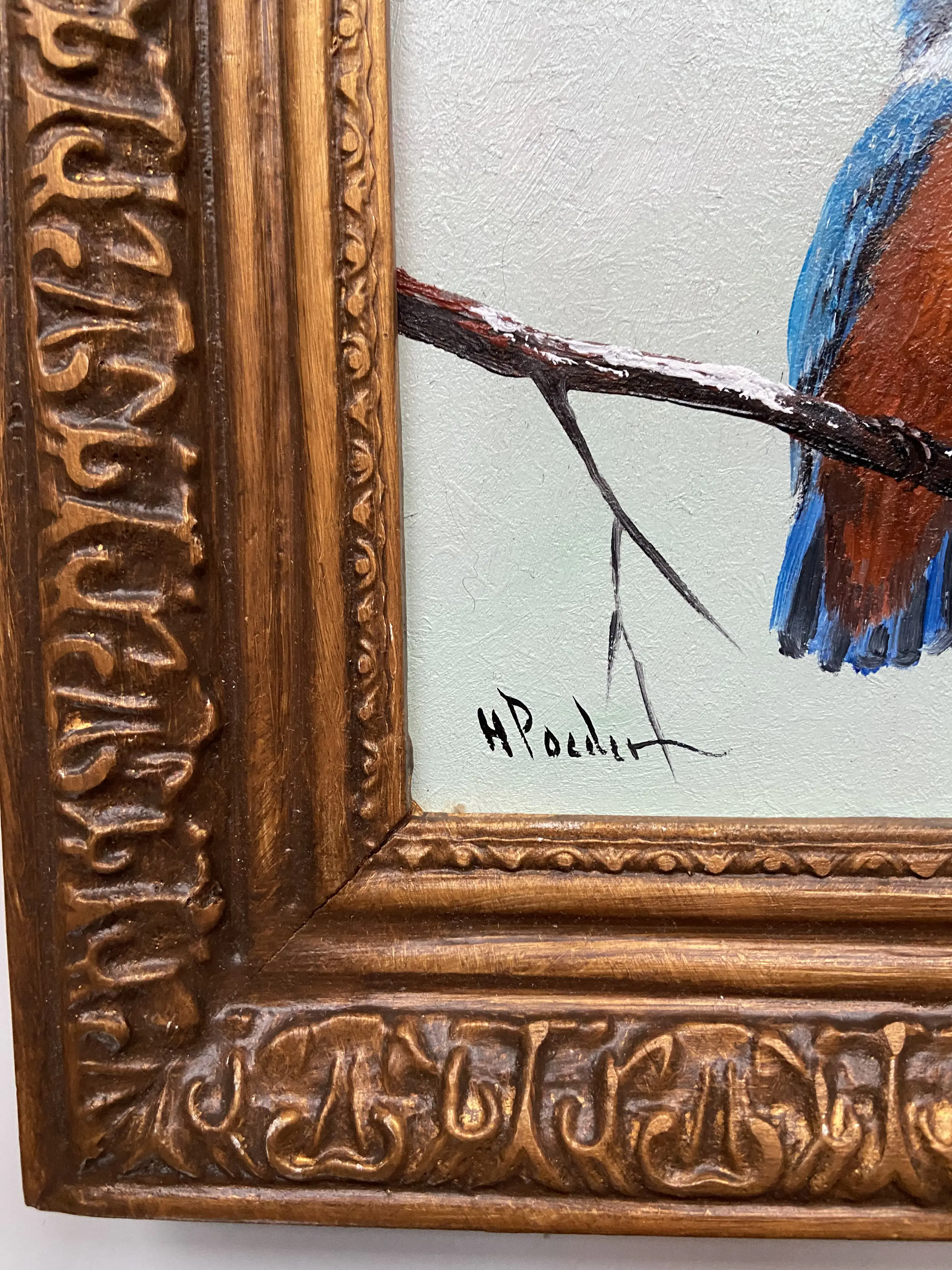 Prachtig schilderij van Henk poeder 1964 links onder gesigneerd .Betreft een Ijsvogel op winterse tak .info over de schilder H poeder rijks kunst en documentaties in Denhaag (ook site rkd)