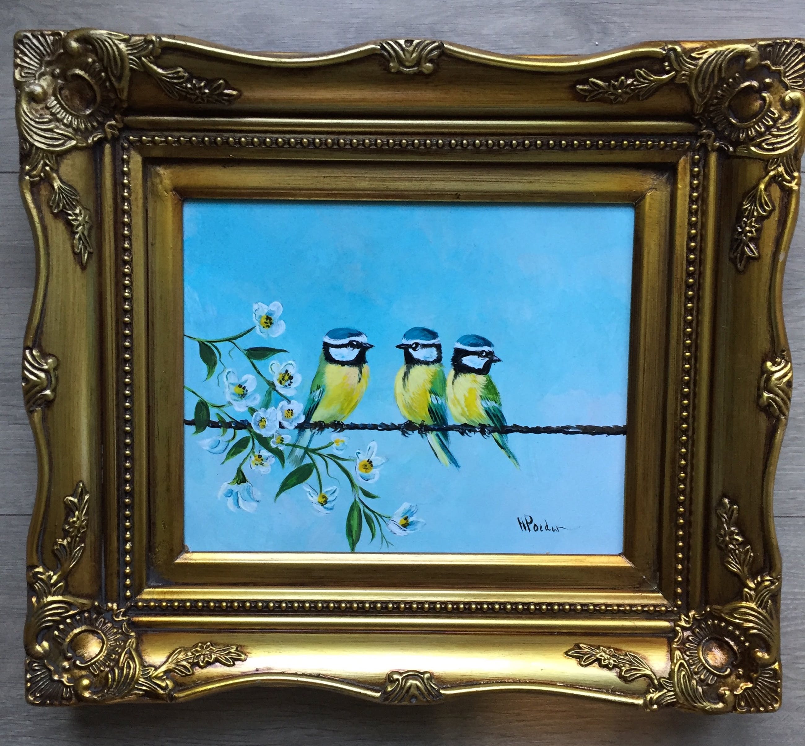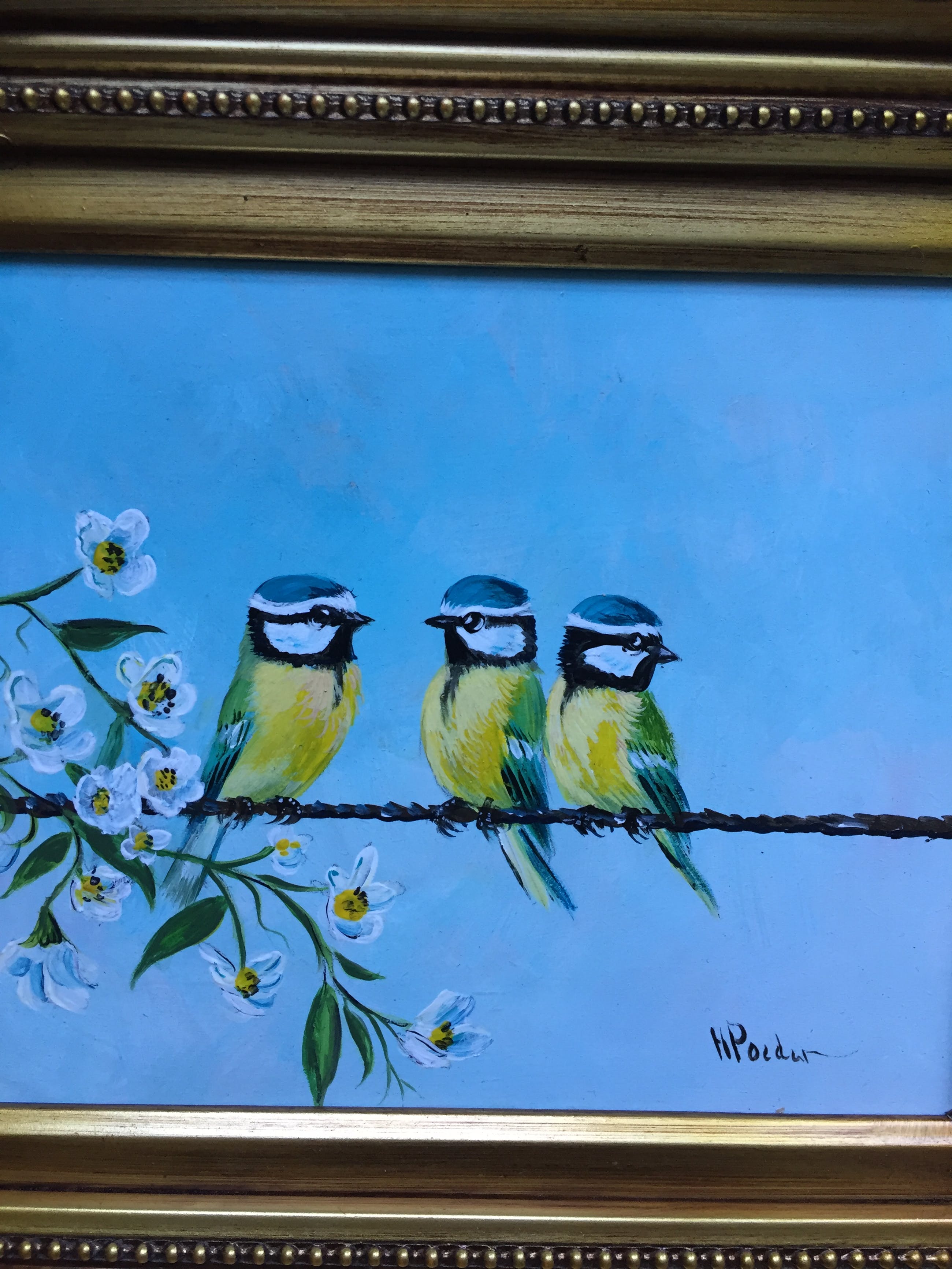 3 pimpelmeesjes op het prikkeldraad met bloemen rechts onder gesigneerd h poeder gemaakt op paneel en met een prachtige lijst .