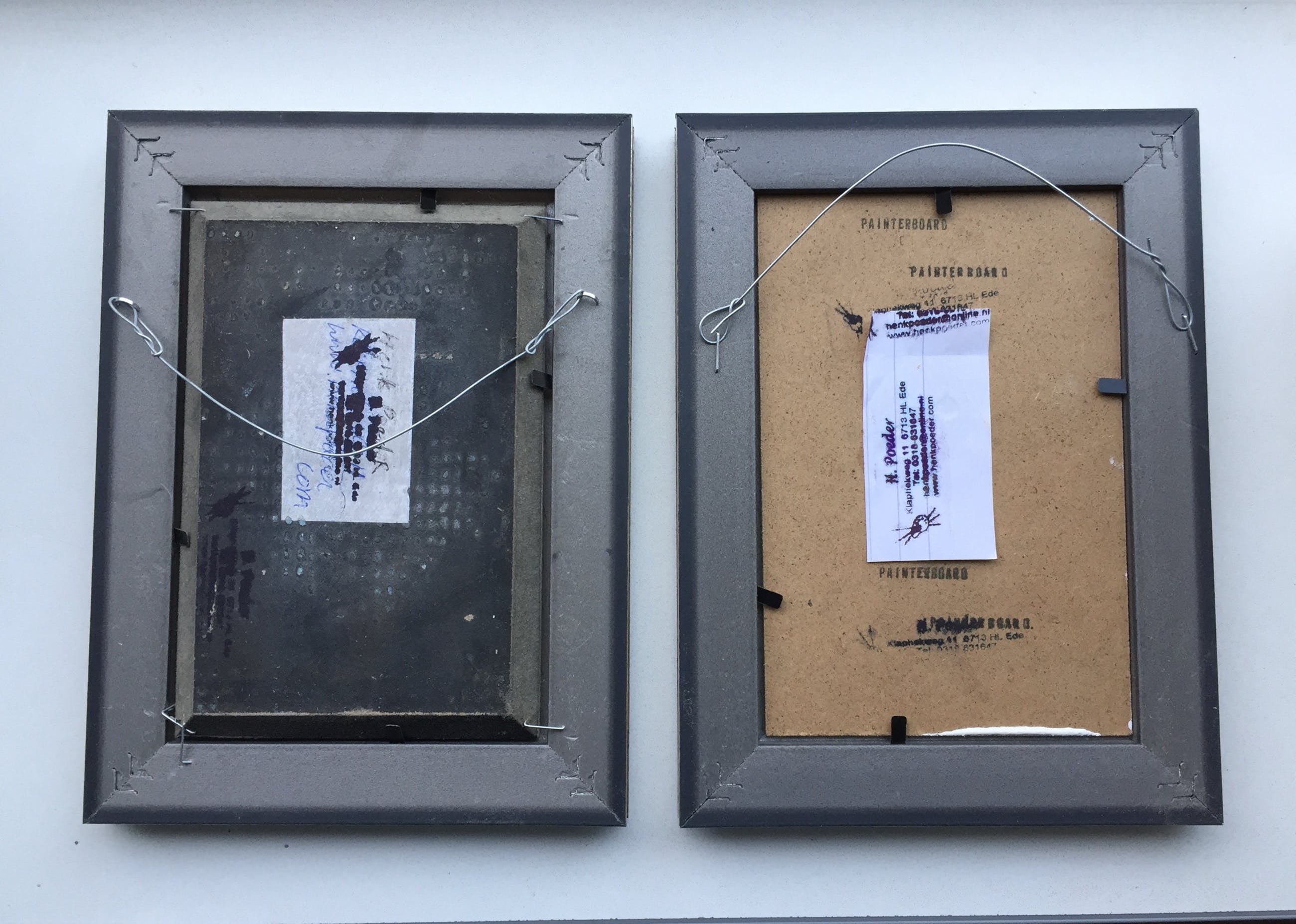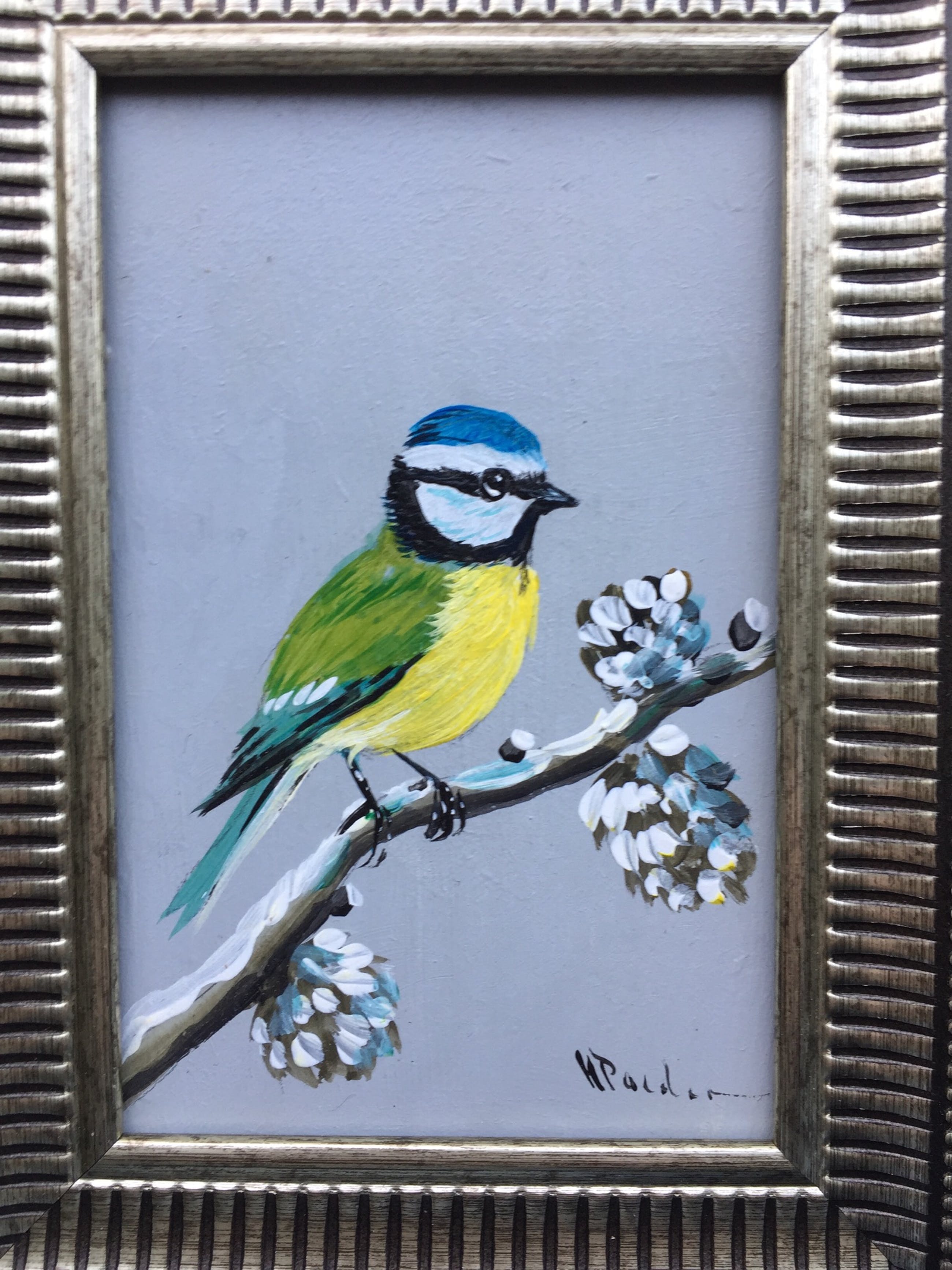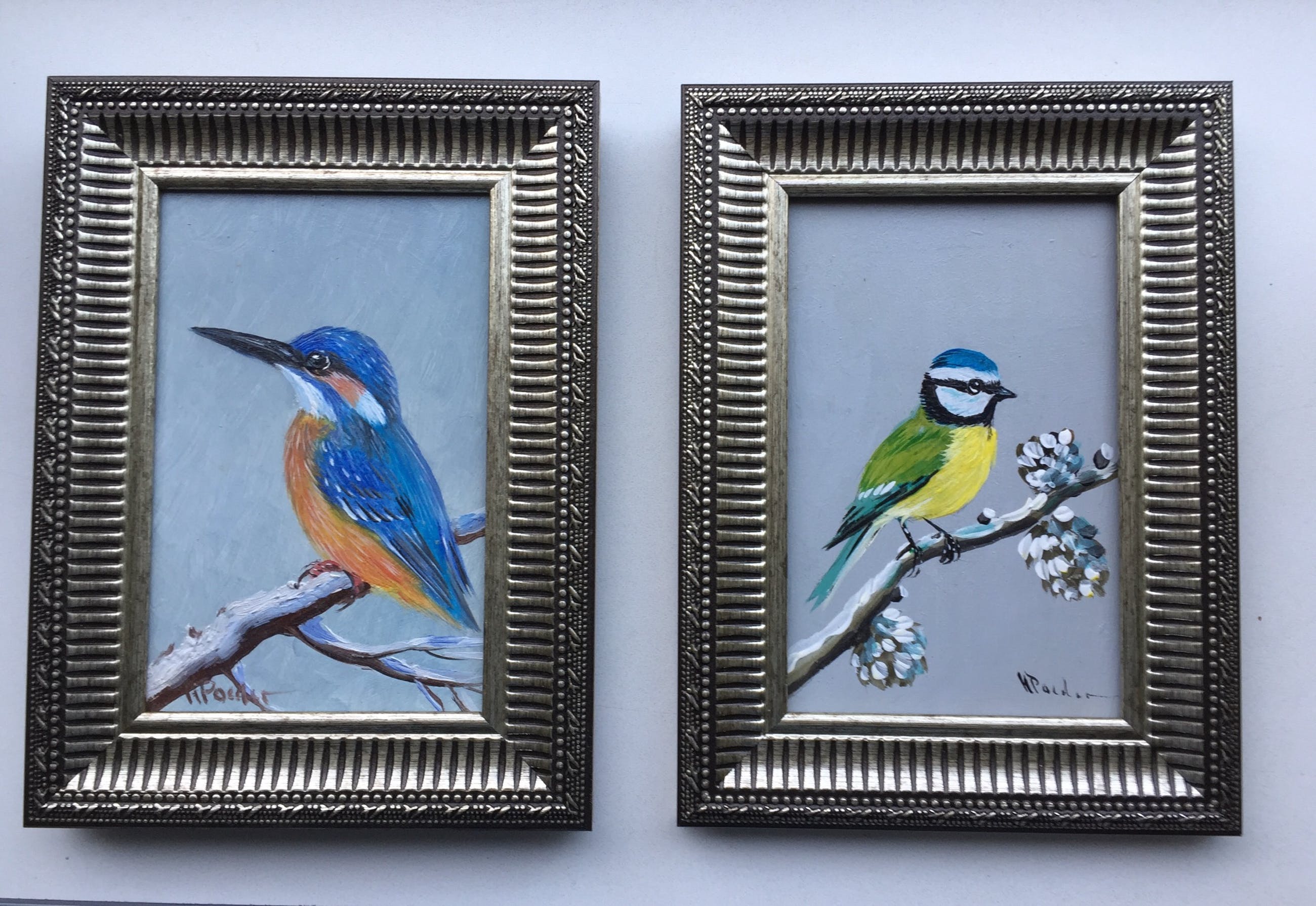 Olieverf van 2 schilderijtjes bij elkaar (pendant) betreft een Ijsvogel op paneeltje en pimpelmeesje op hardboard in de sneeuw erg leuk in de zelfde lijstjes gesigneerd h poeder