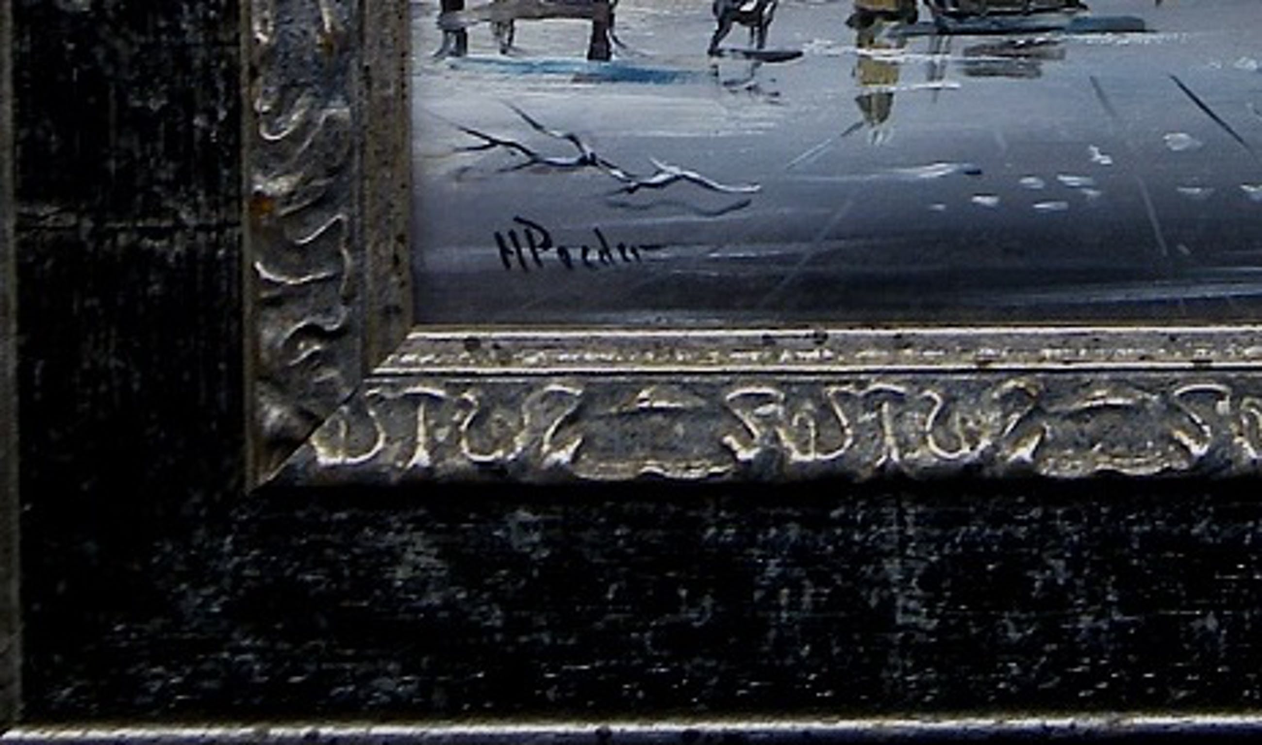 Olieverf op painterboard nederlands lwinterlandschap met schaatsers .Gesigneerd lo H Poeder de lijst is nieuw houtbewerkt [geen gips] dus lange levensduur.verder spreekt het werk voor zich zelf .vrgr Henk