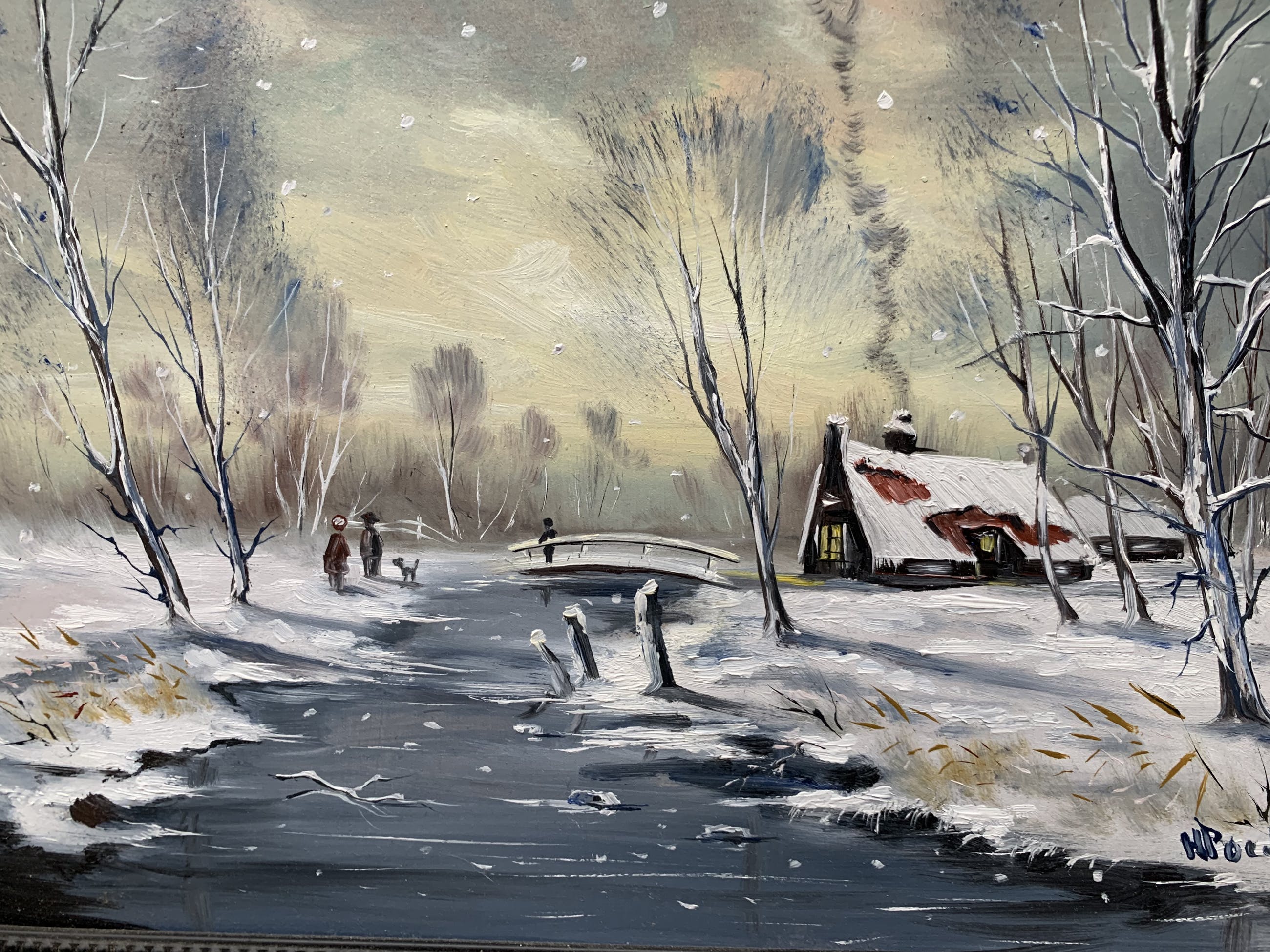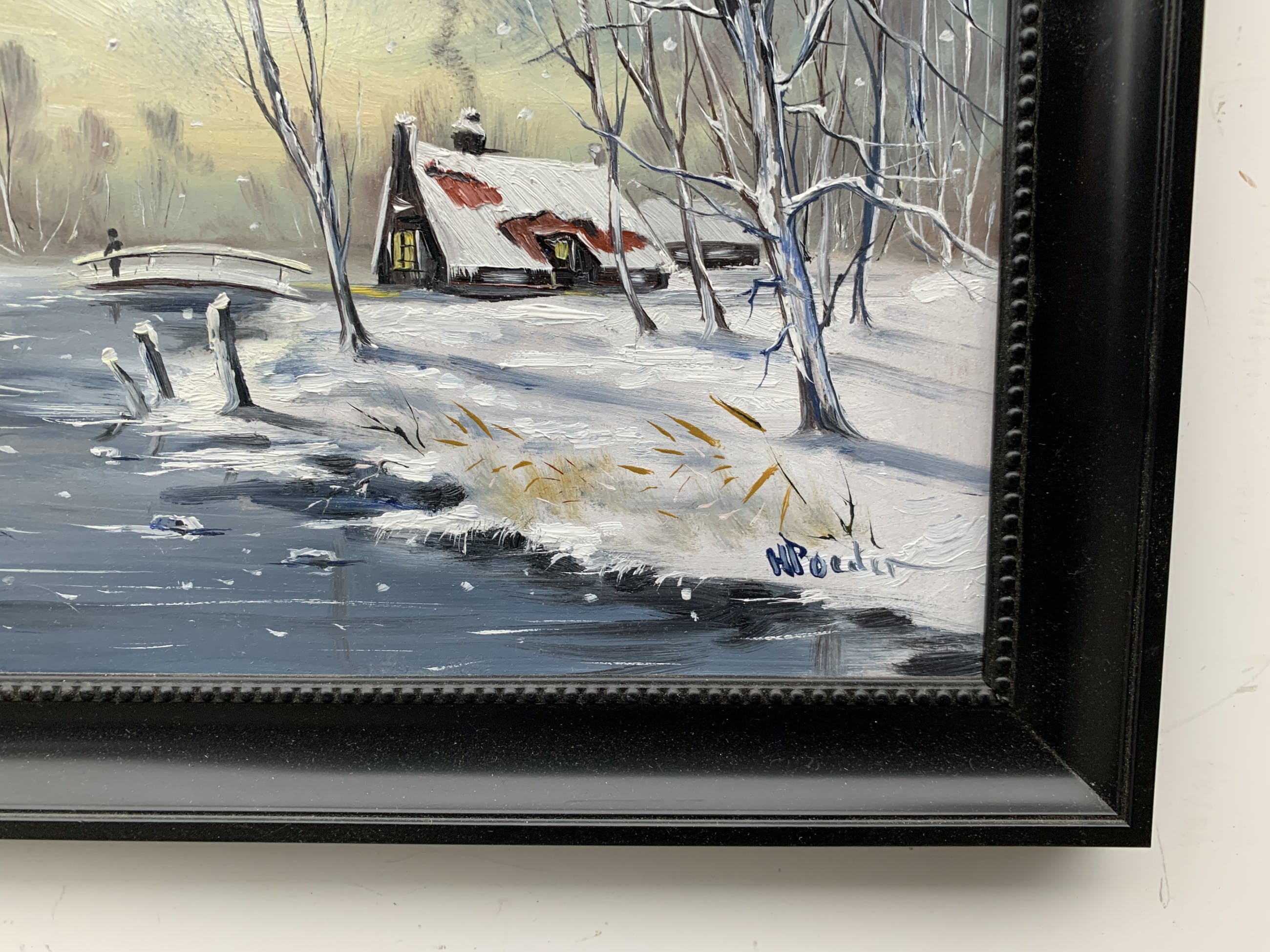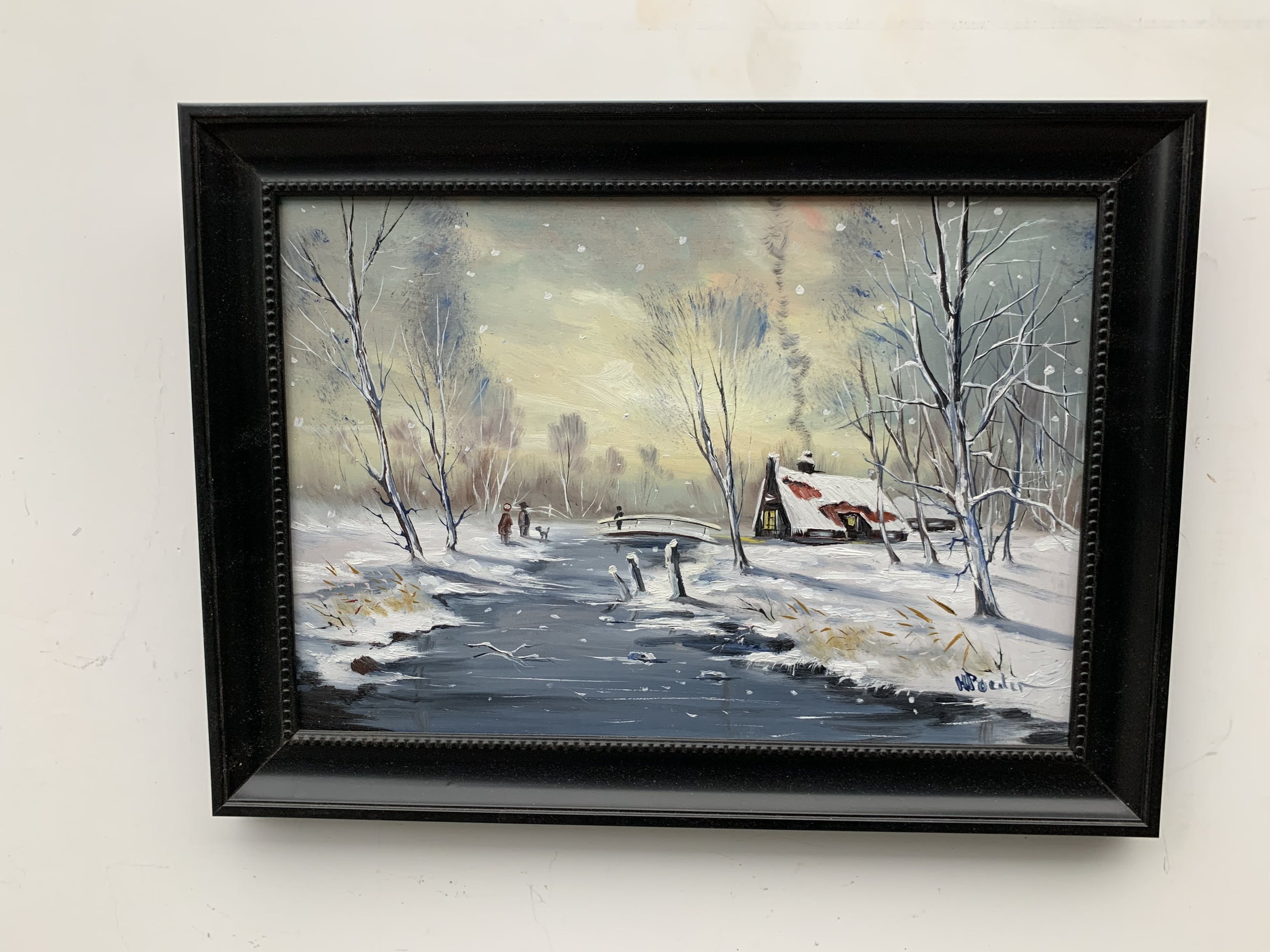 prachtig olieverf op paneel door H Poeder gemaakt gesigneerd rechts onder schilderij is erg leuk voor het komende jaar getijde lekker sneeuw en in het huisje brand de kachel .