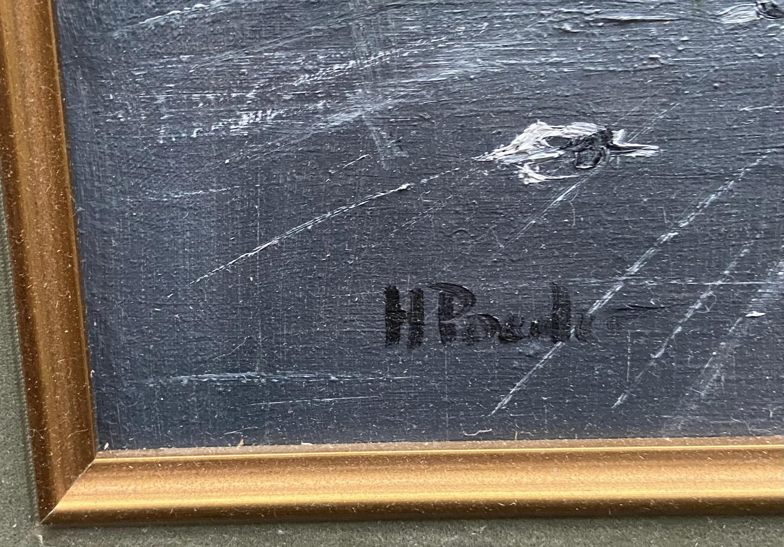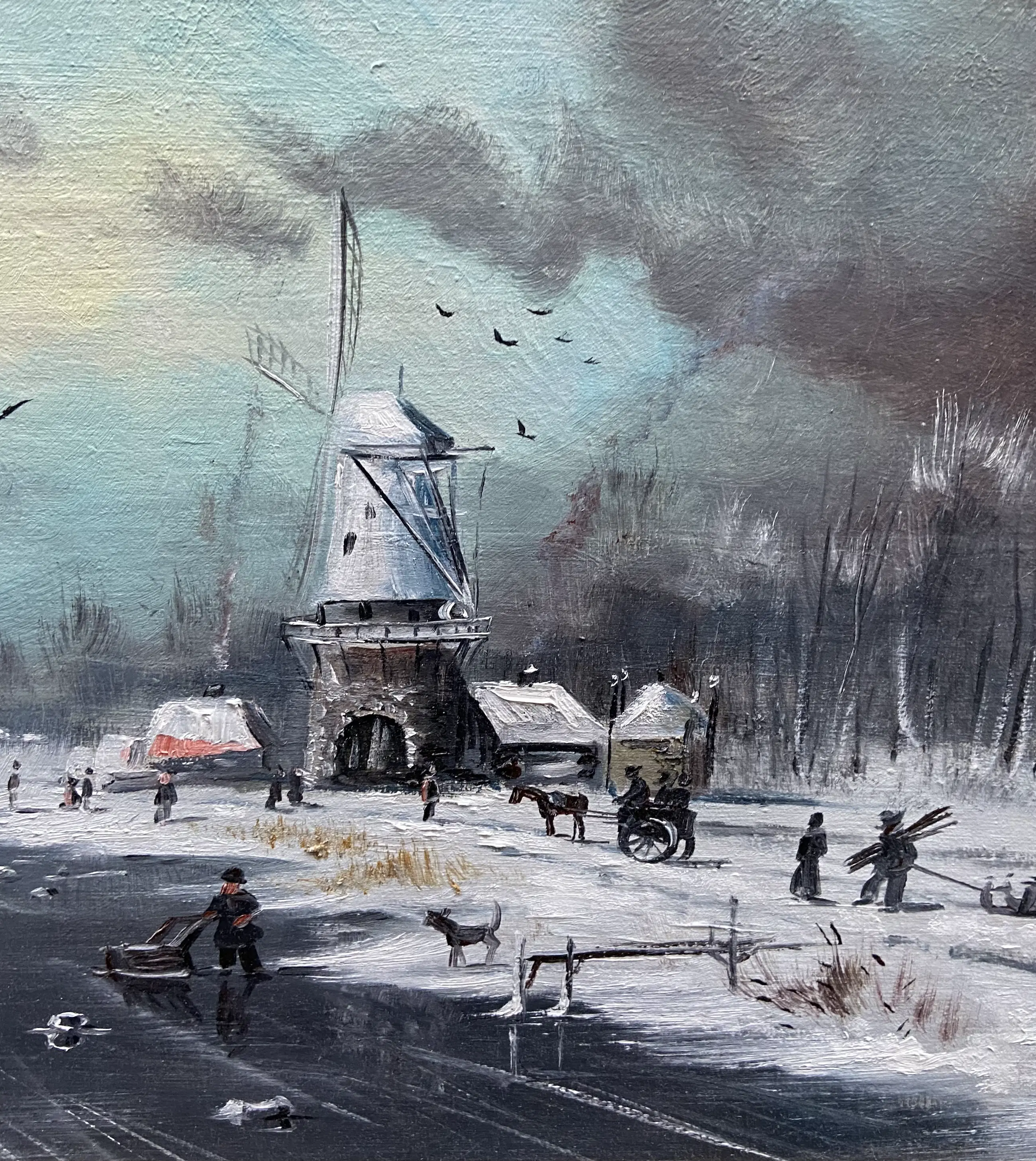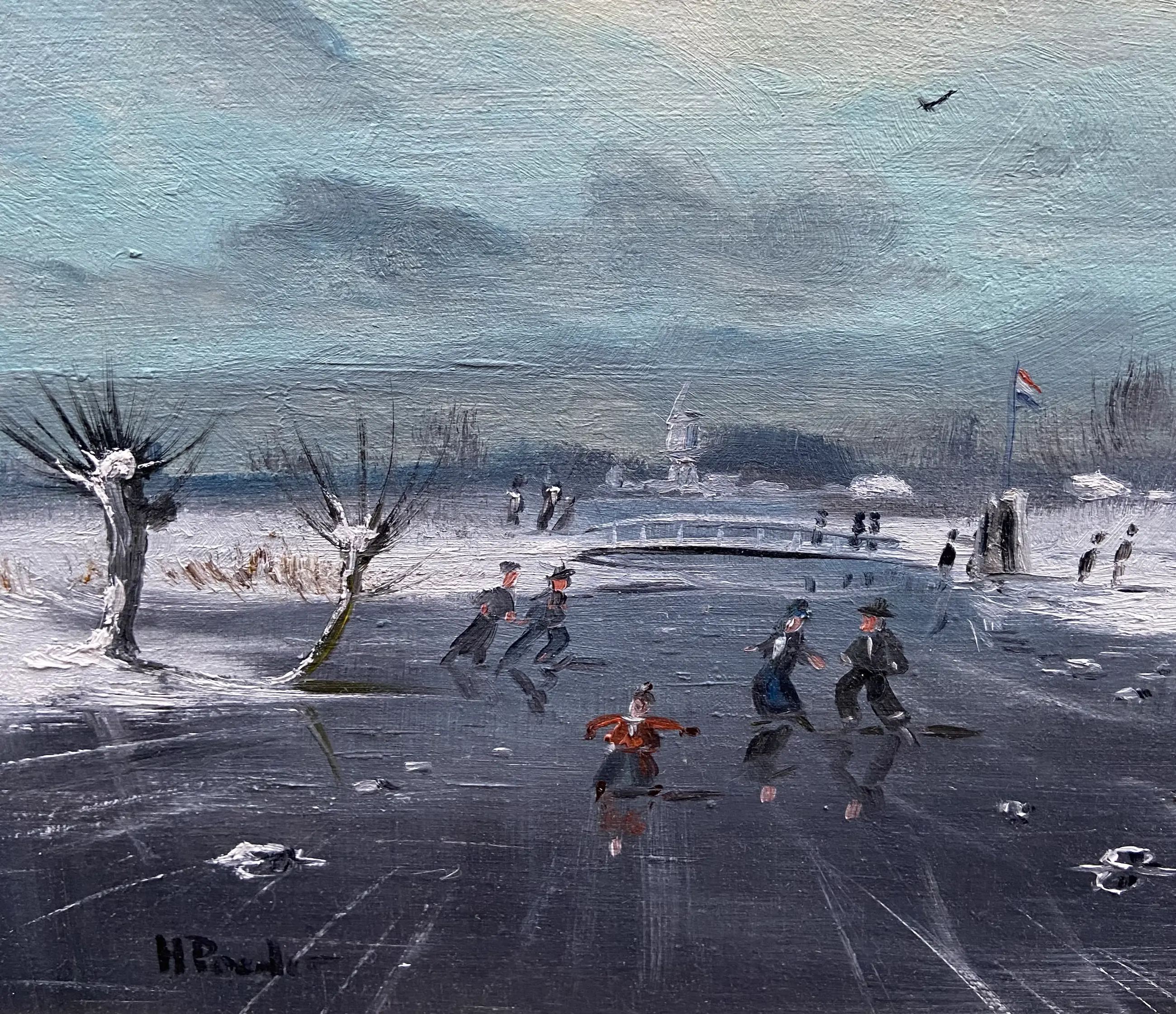 Prachtig olieverf van H Poeder 1964 nostalgisch Hollands ijs gezicht maart en wagen hout sprokkelaar en schaatsers in de verte ook nog een koek en zopie Trent . Schilderij is links onder gesigneerd H Poeder (zie ook rkd in Denhaag voor info ) schilderij zit in een mooie houten lijst met inleg .