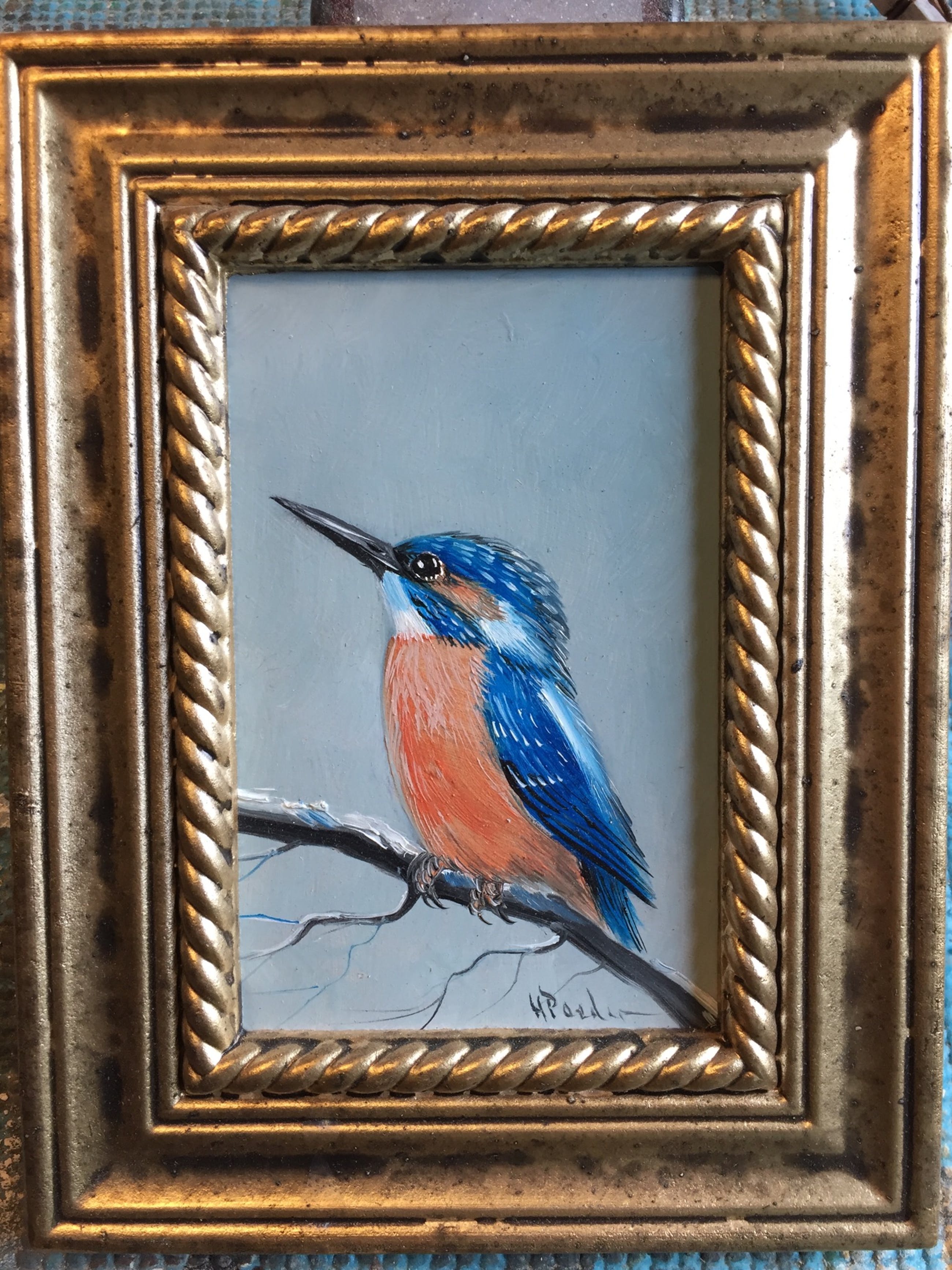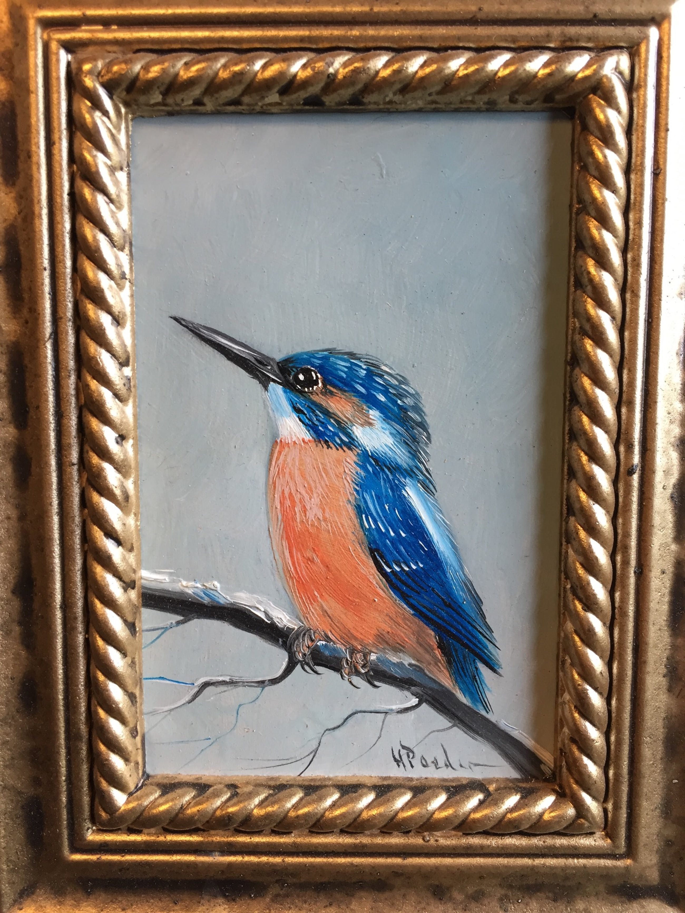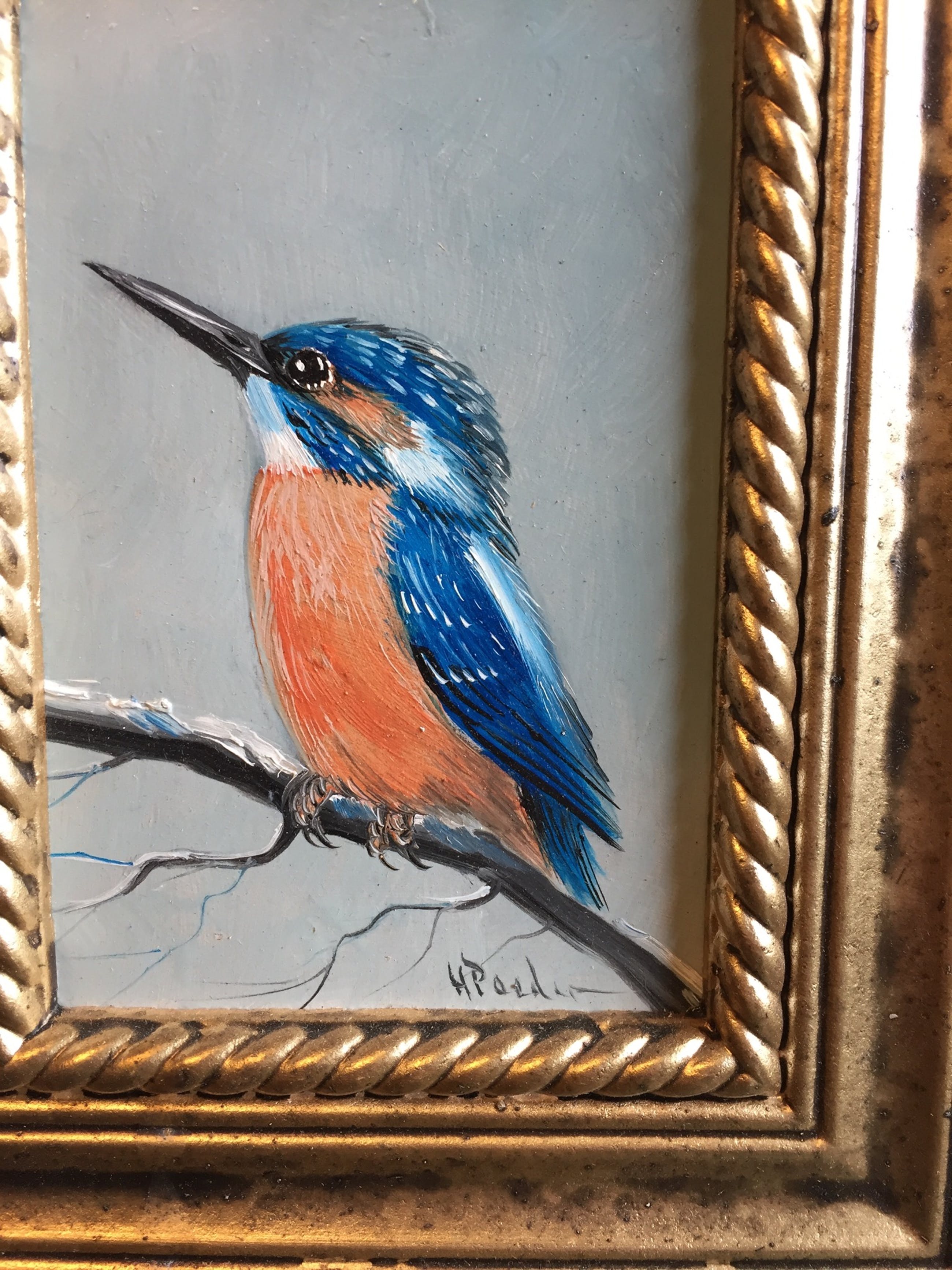 Leuk schilderijtje van een ysvogeltje gesigneerd h poeder