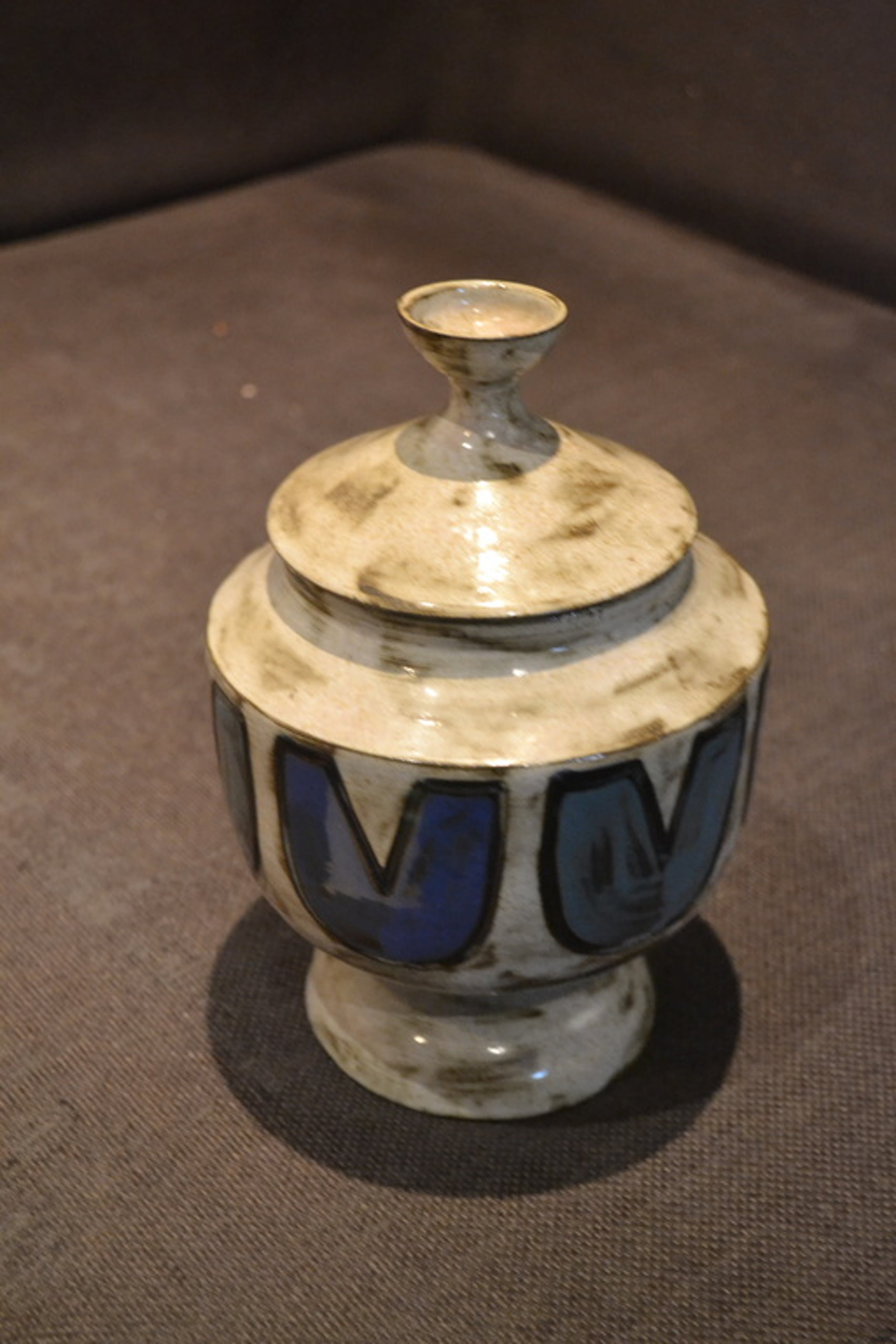 Mooie kan op voet en met deksel van Henk Potters. In mooie en helemaal gave staat. Hoogte is 21cm en doorsnede is 14 cm. Onderop gesigneerd.
