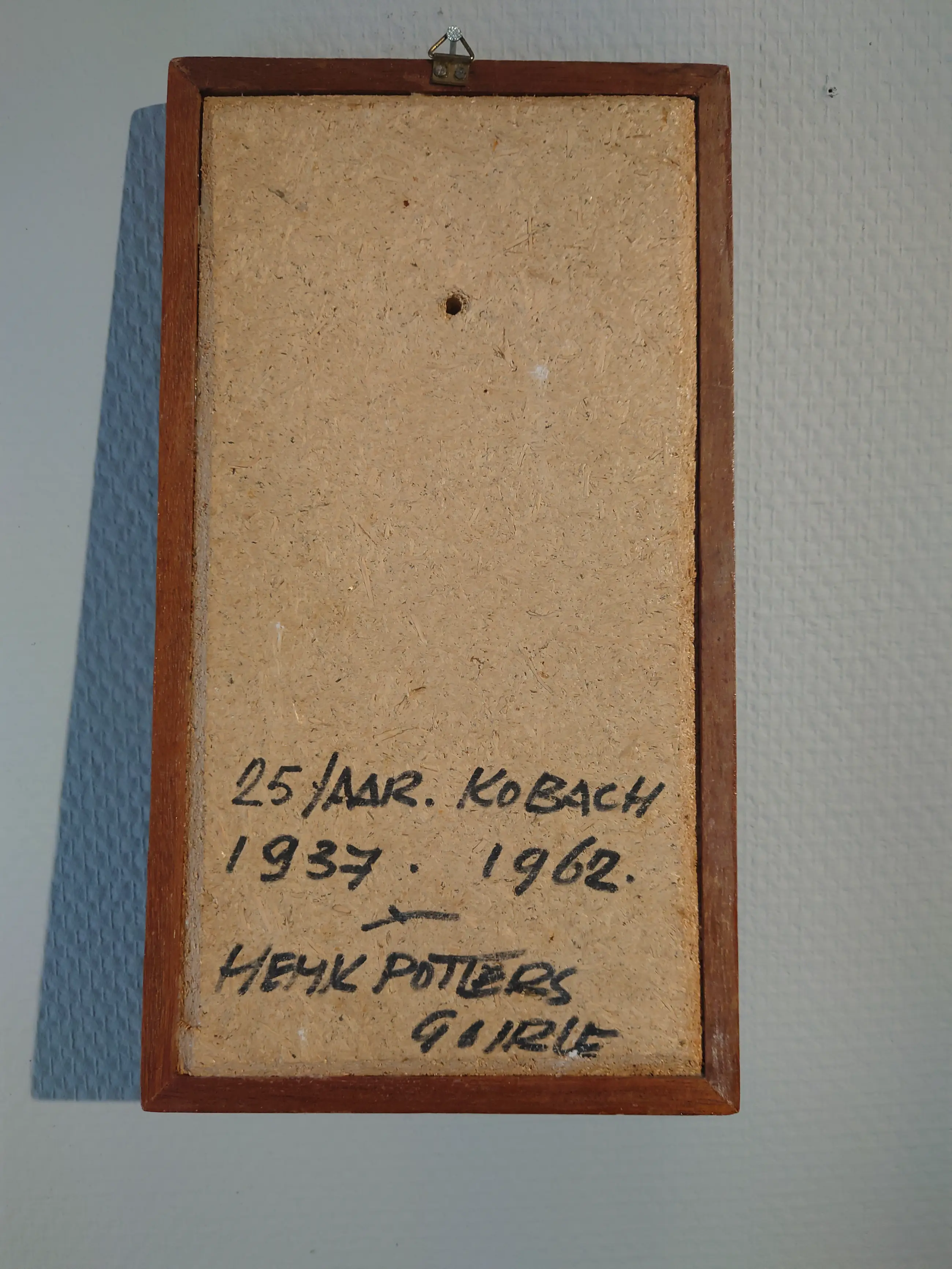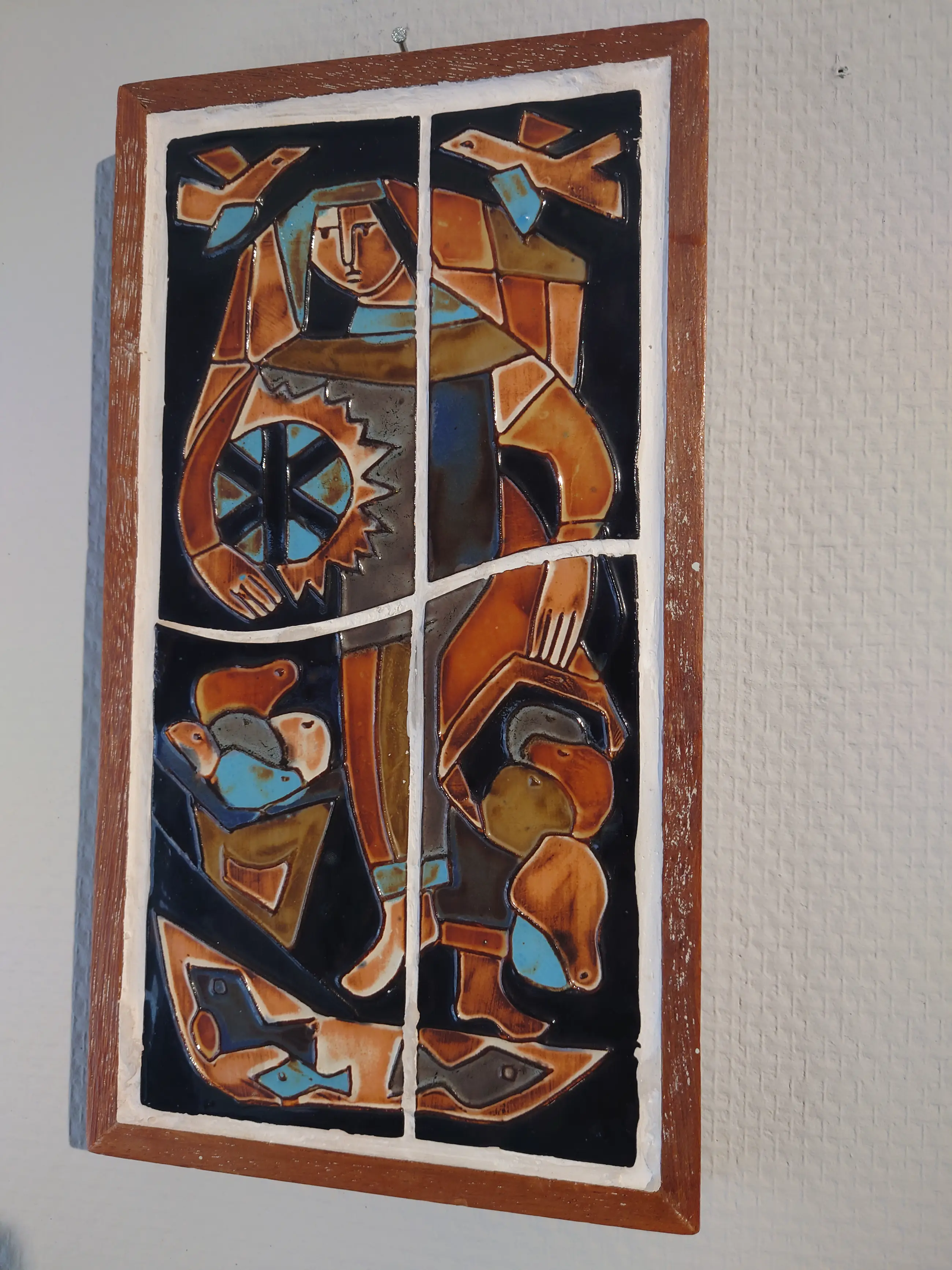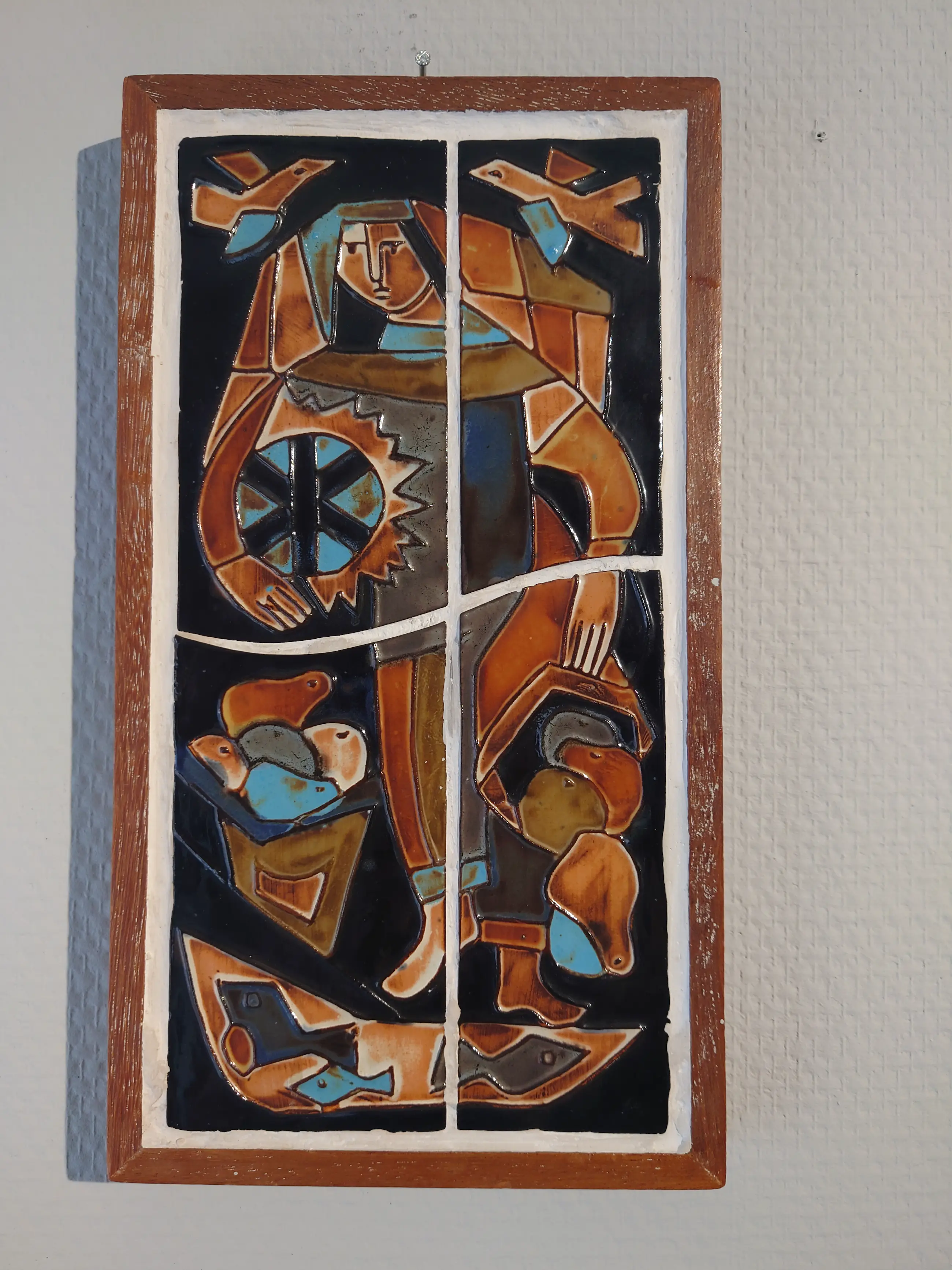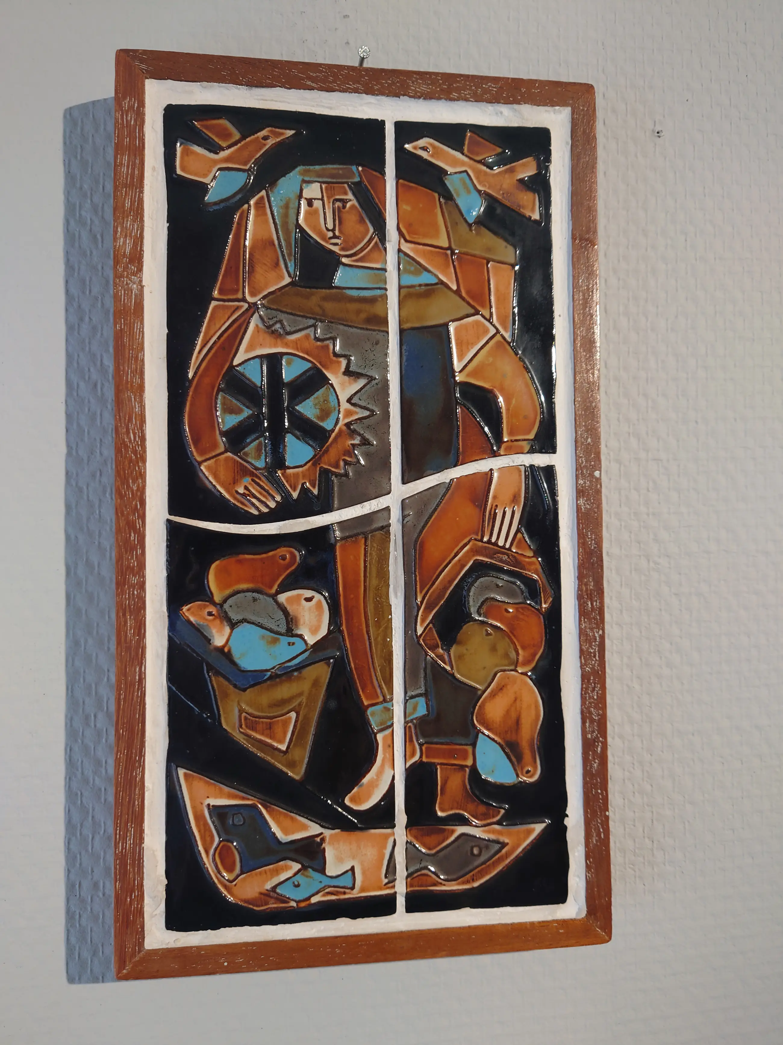 Henk Potters, ca1962 Vrouw of non op Markt. Puntgave ceramische tegel, ingewassen en houten omlijsting. Achterkant gesigneerd.