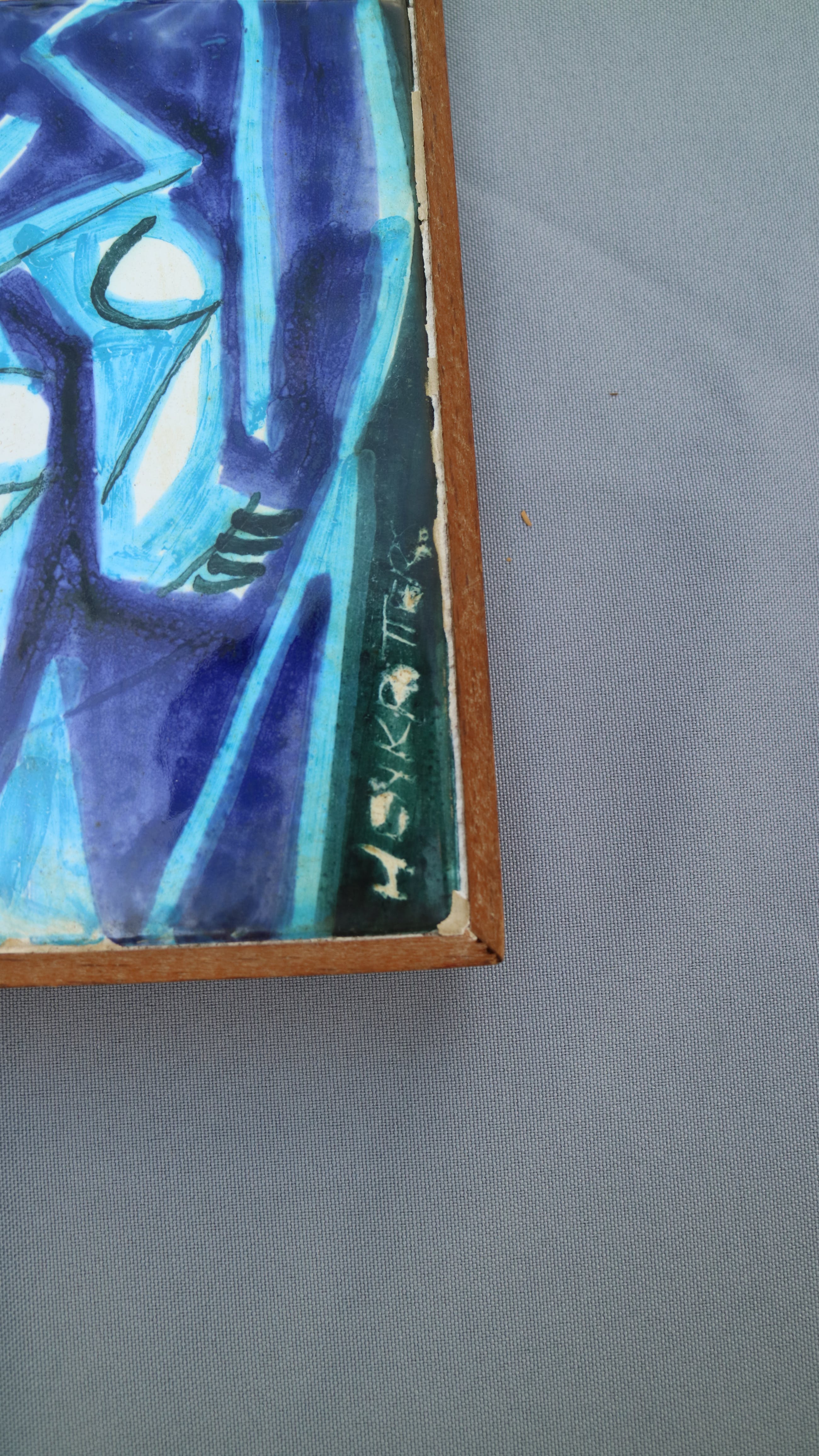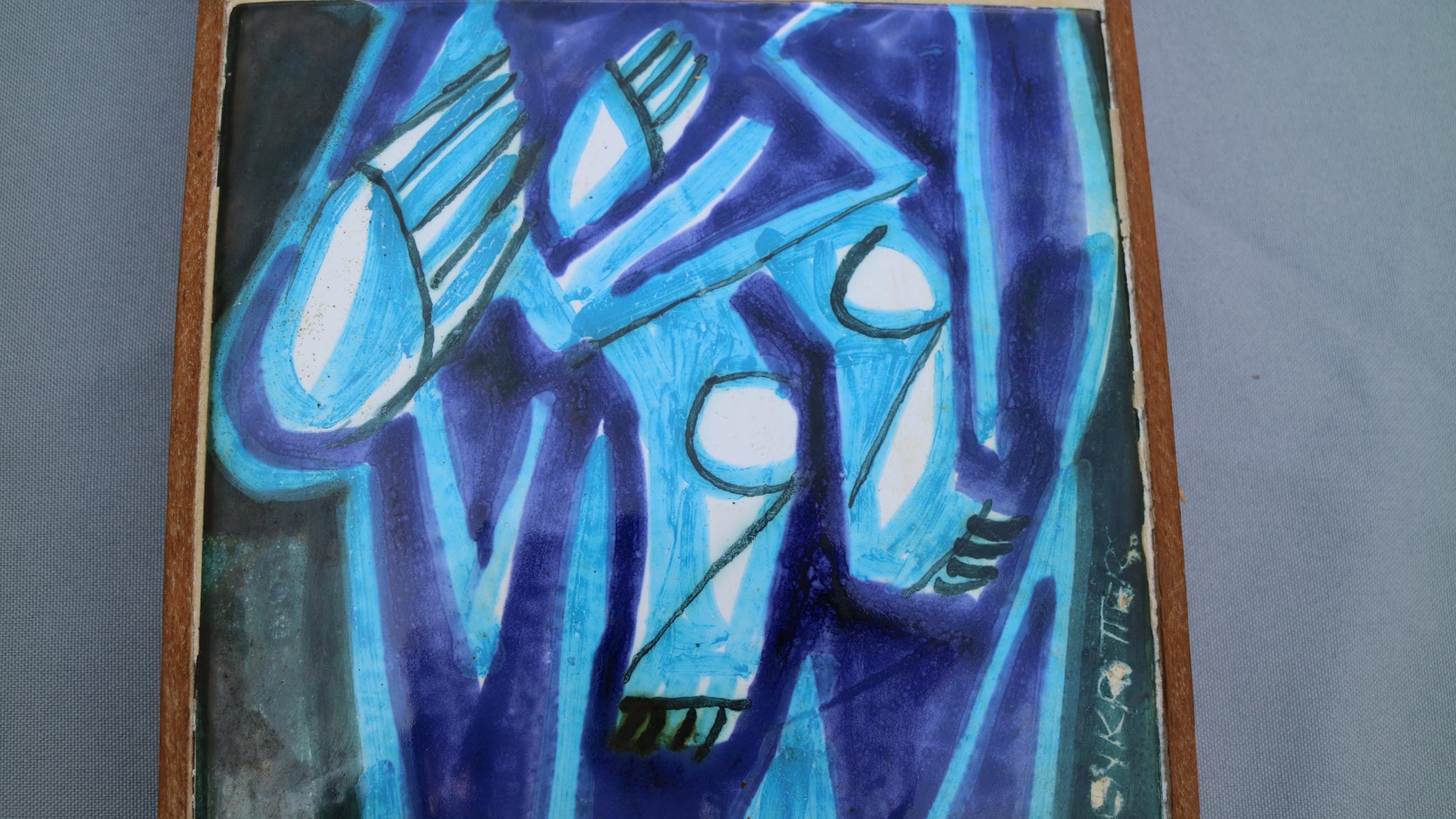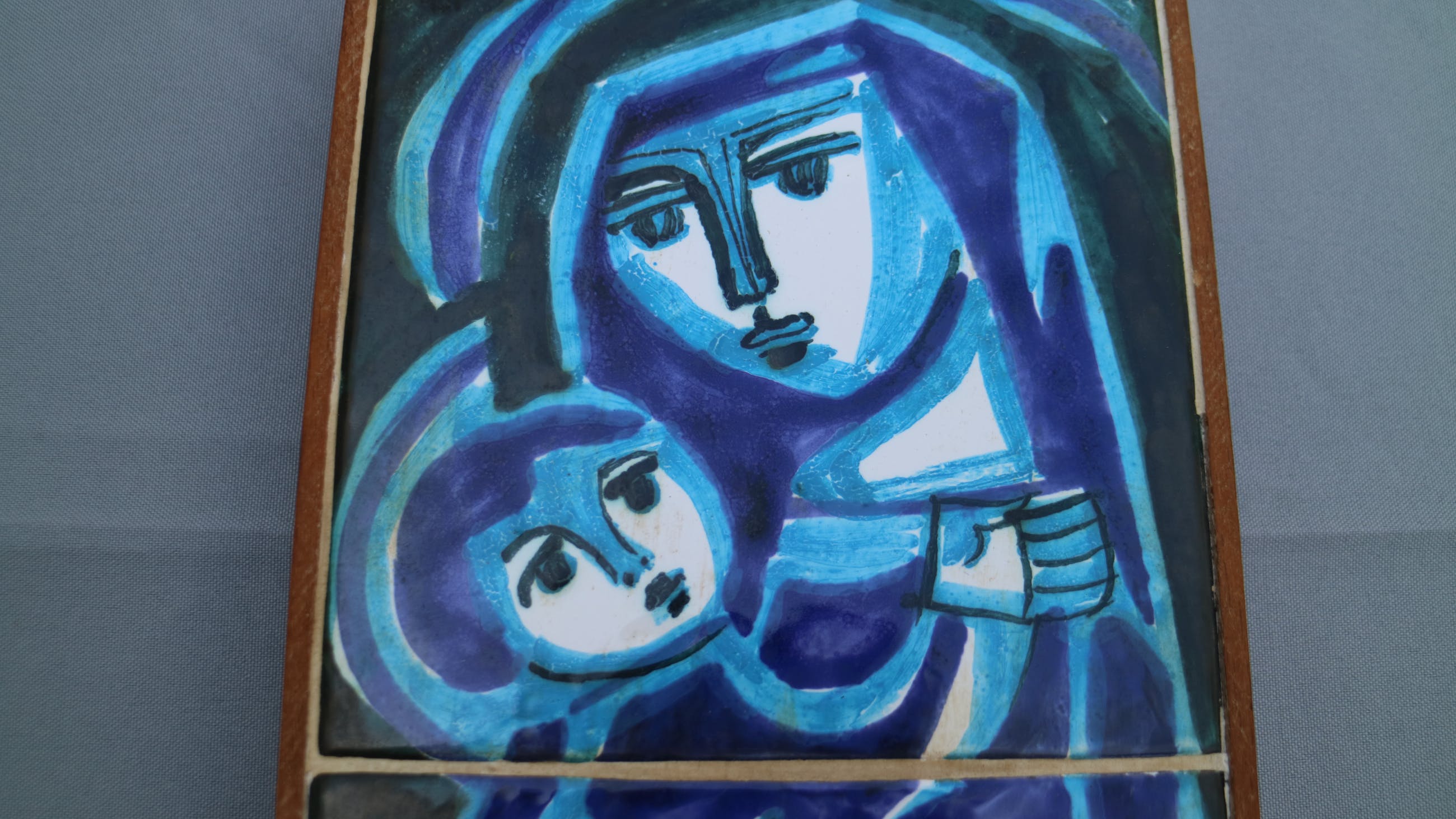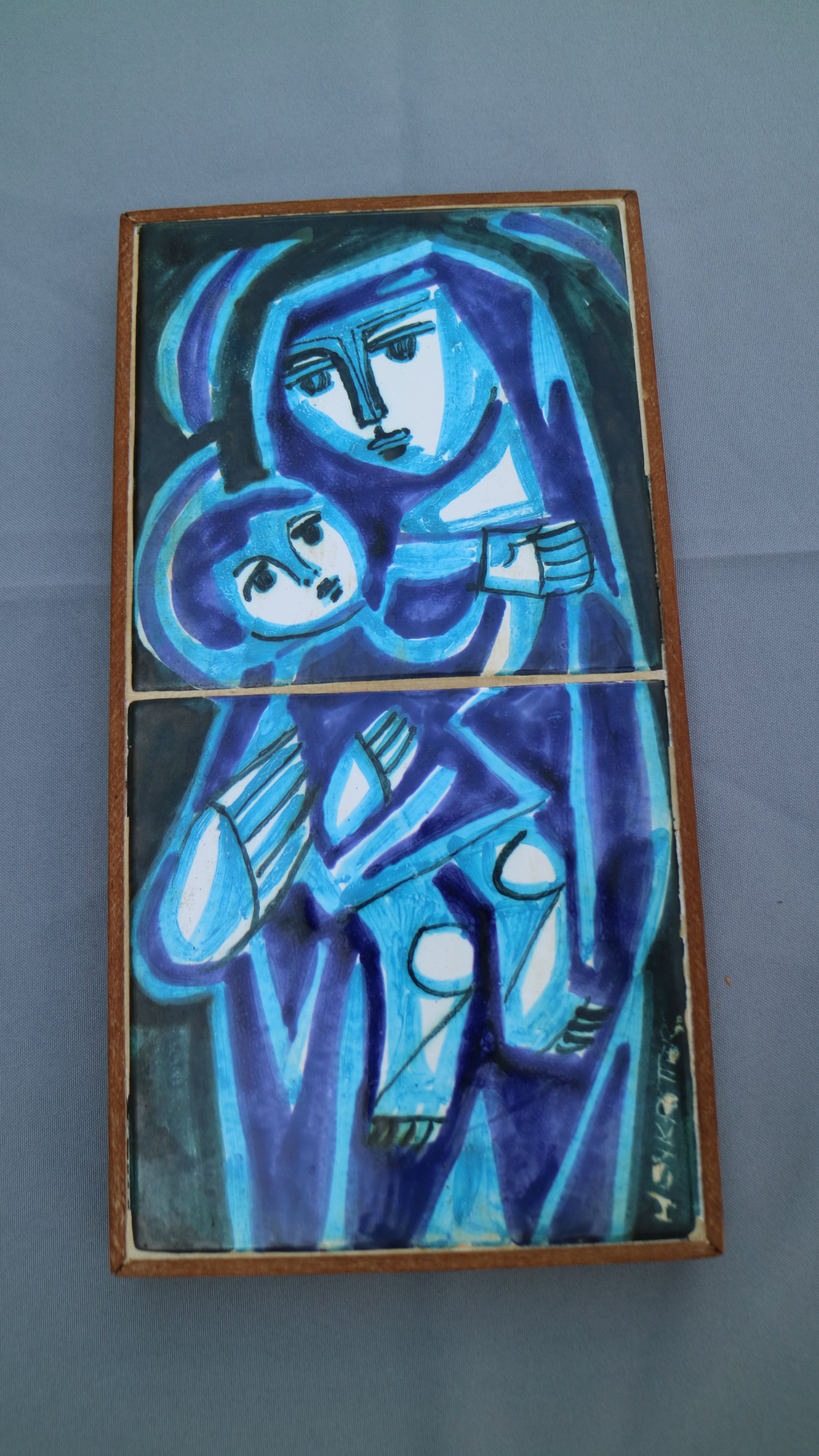 Mooie abstracte voorstelling in heldere kleuren van Madonna met kind, Maria met kind. Gesigneerd in glazuur rechtsonder en in inkt(?) aan achterzijde.