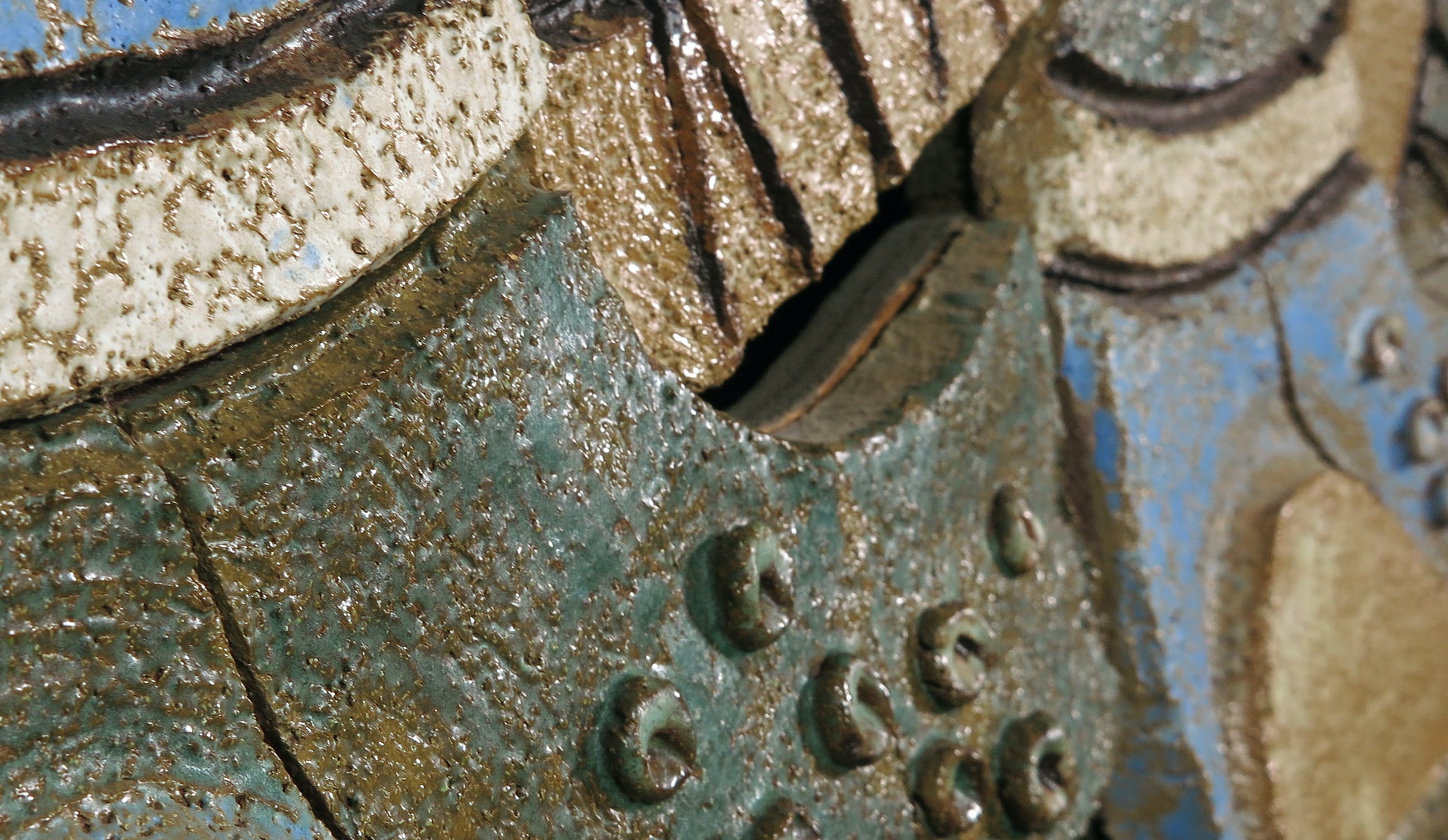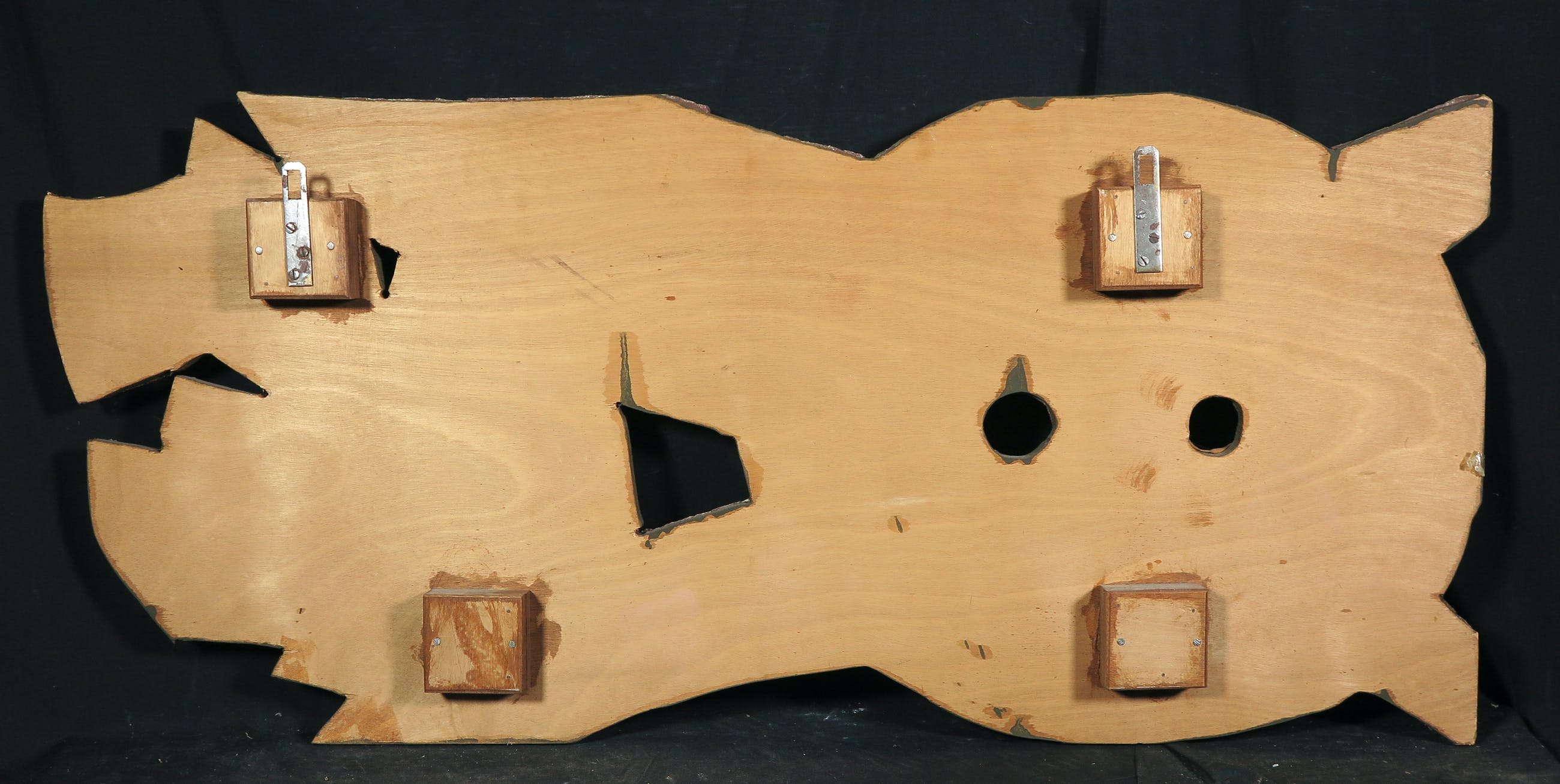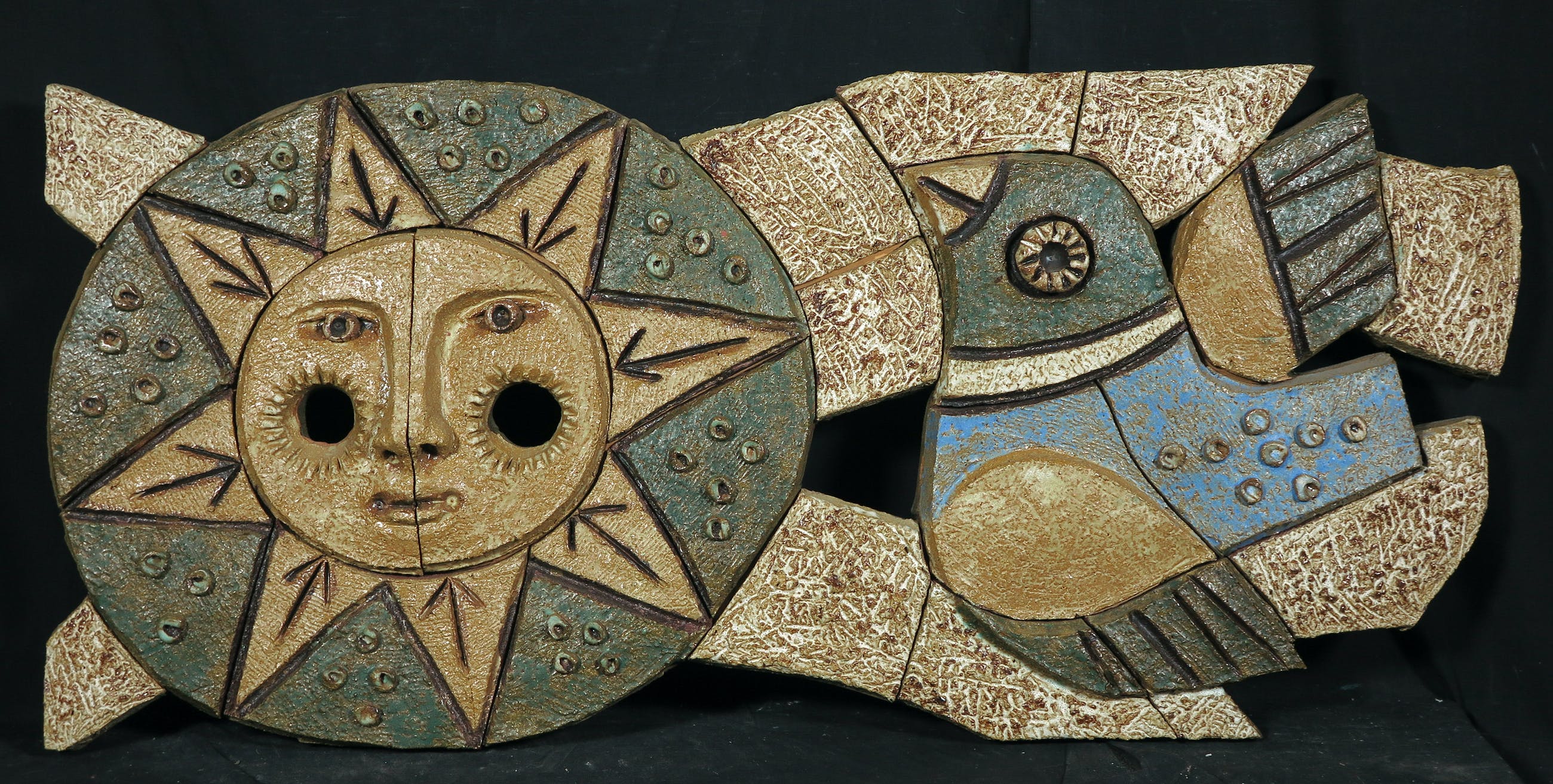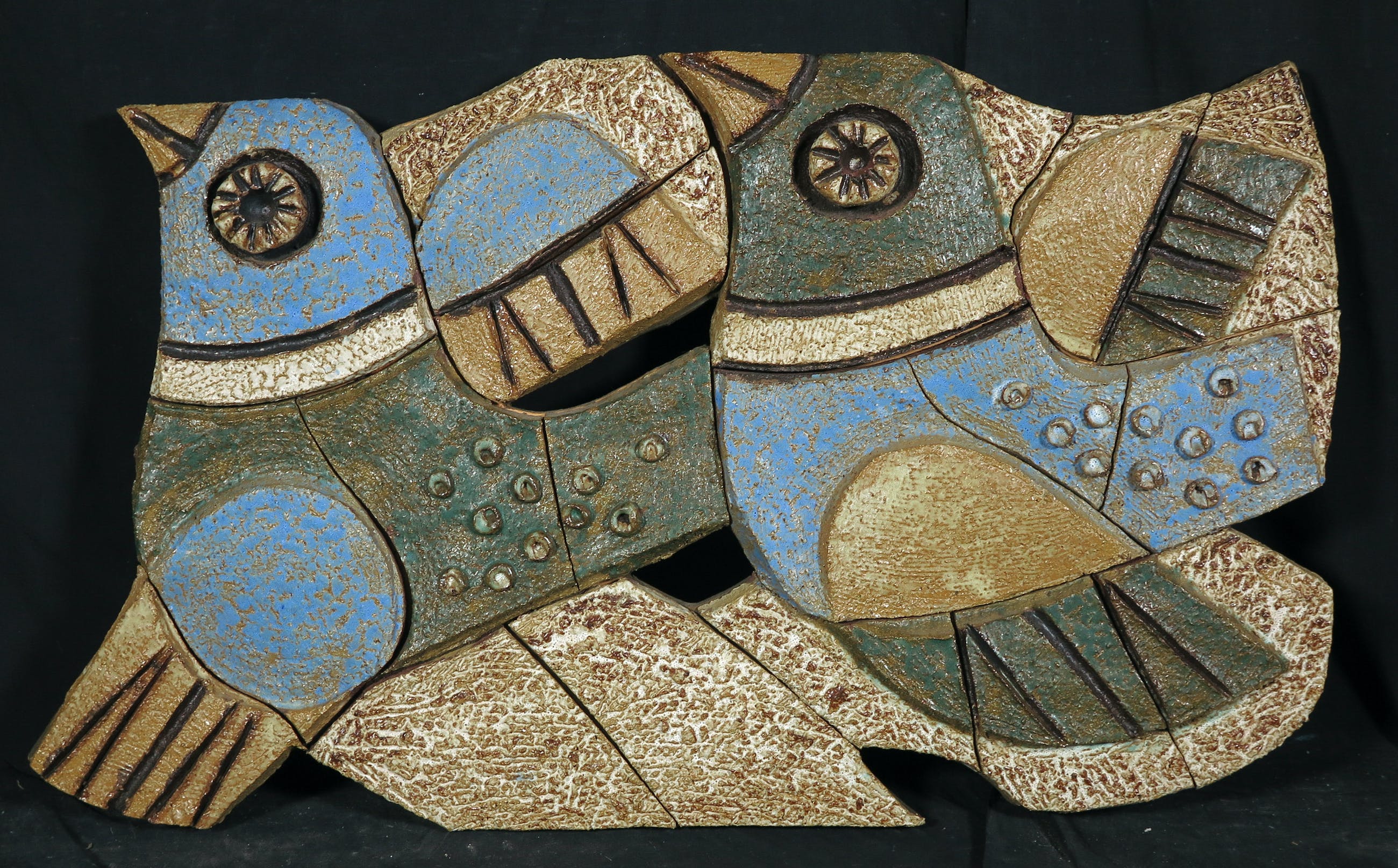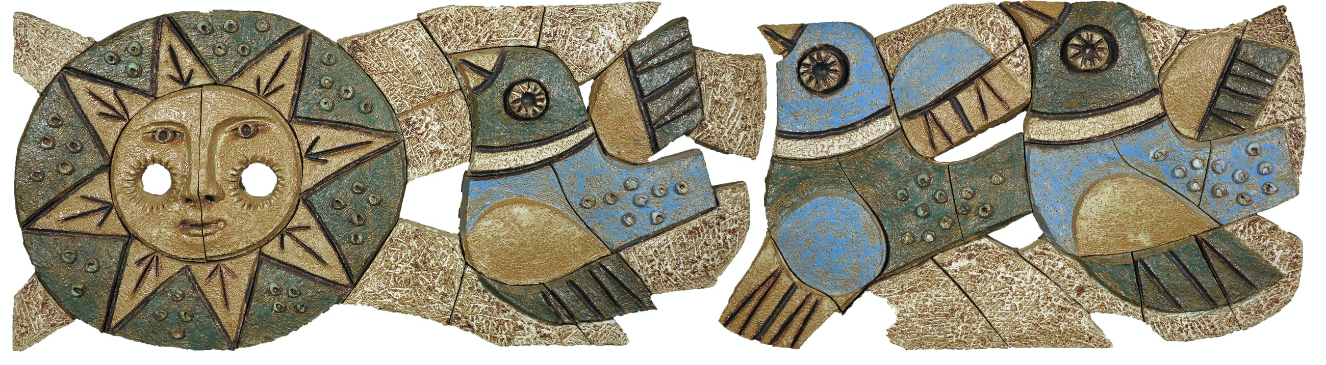 Keramieken wandobject. Het twee-luik stelt drie vogels voor met een zon. Het keramiek is als een soort mozaïek gemonteerd, op een houten dragen.