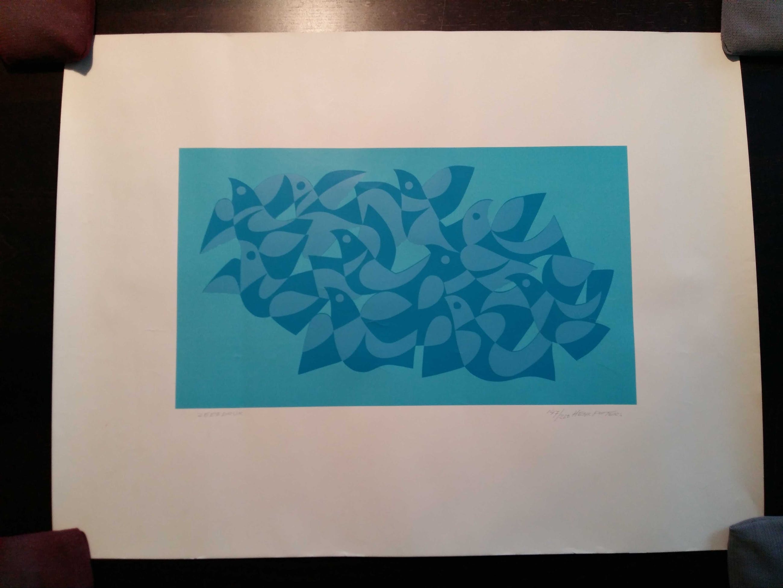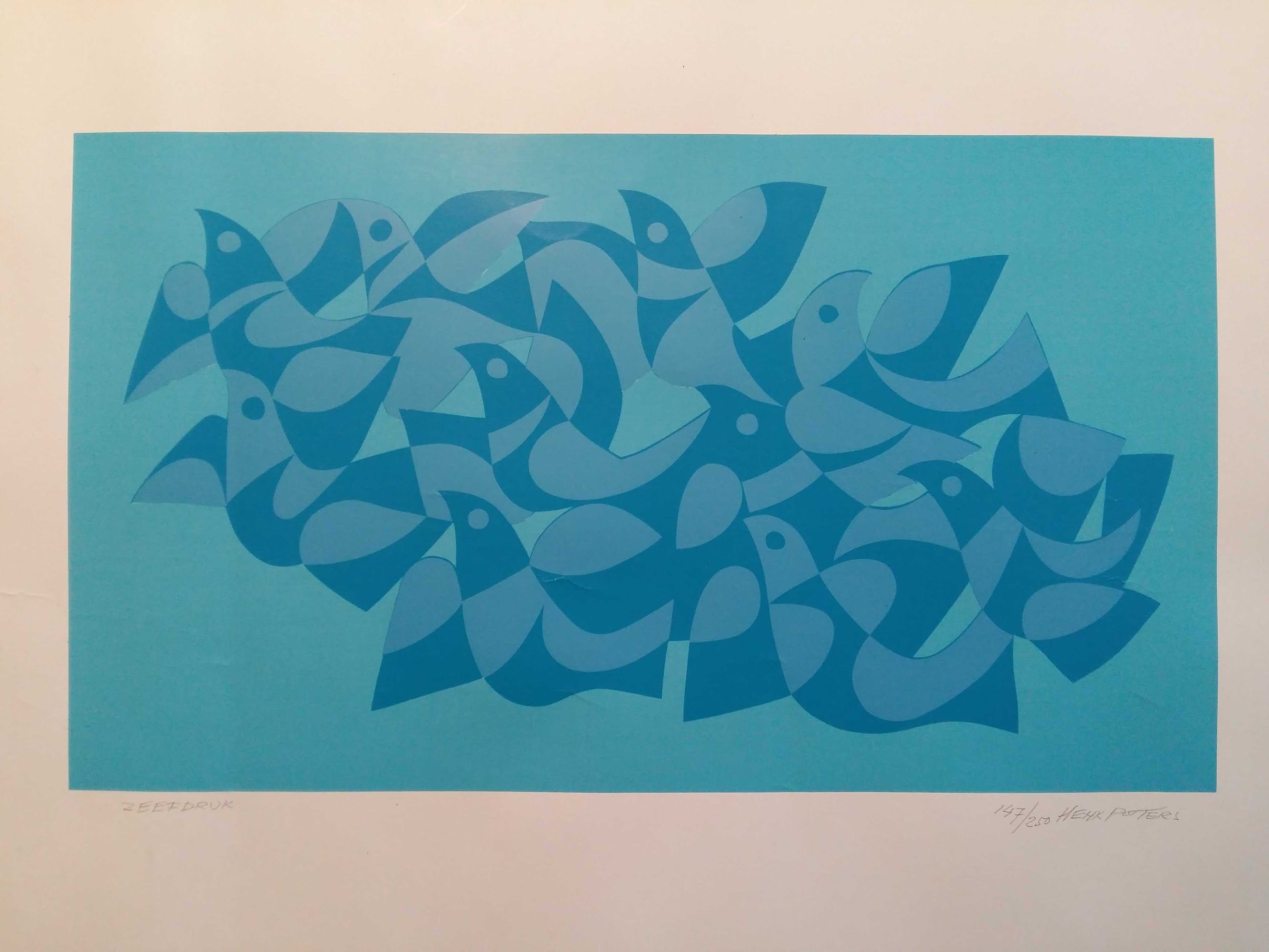 De afbeelding is samengesteld uit 3 zeefdruklagen in turquoise en stelt een zwerm vogels voor. Het is nr. 147 van 250 afdrukken. Doet denken aan Escher.