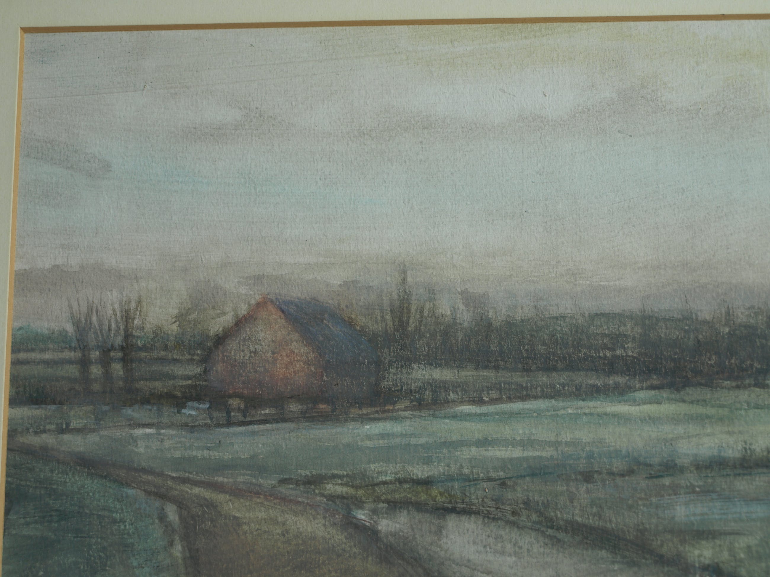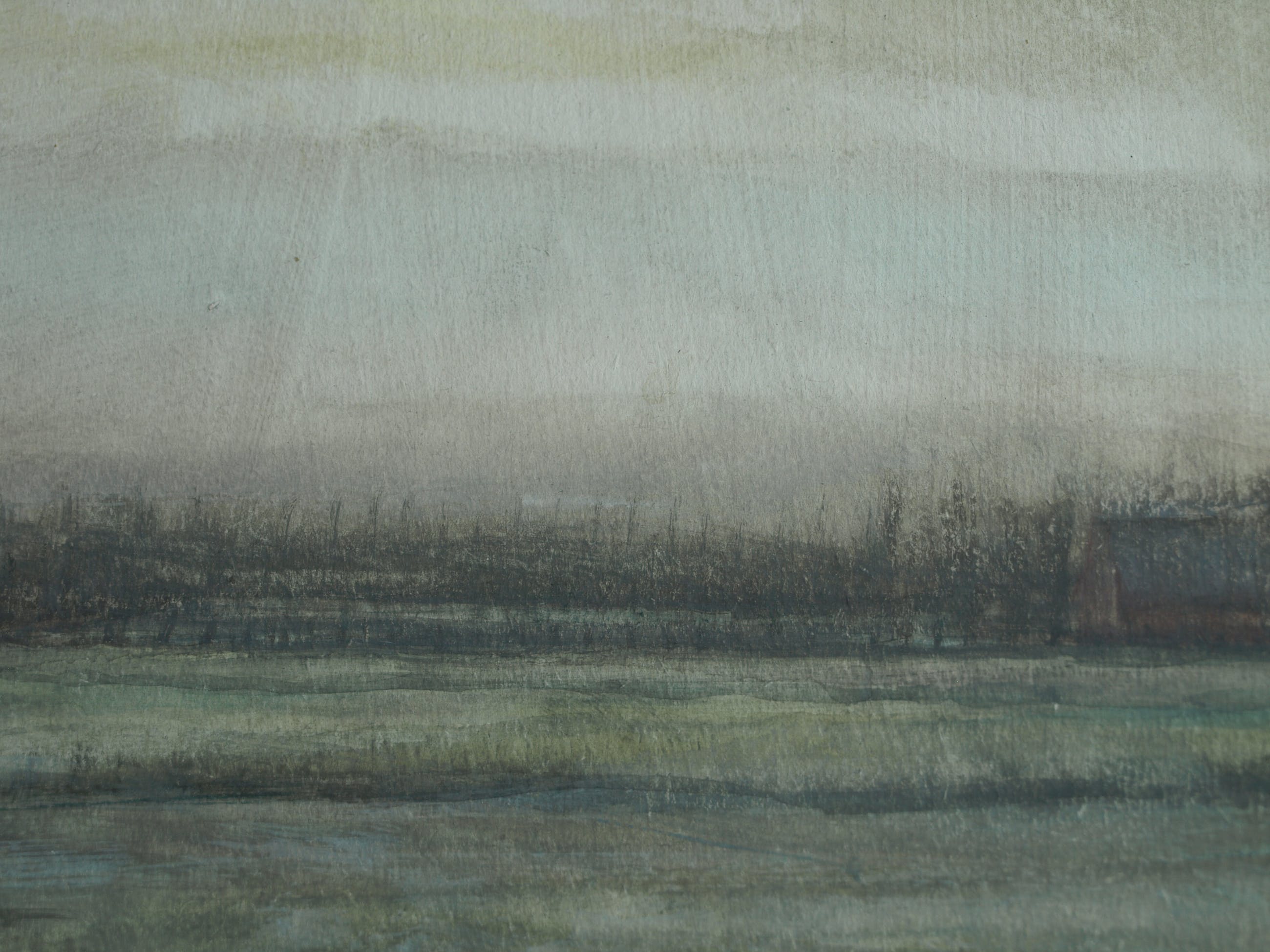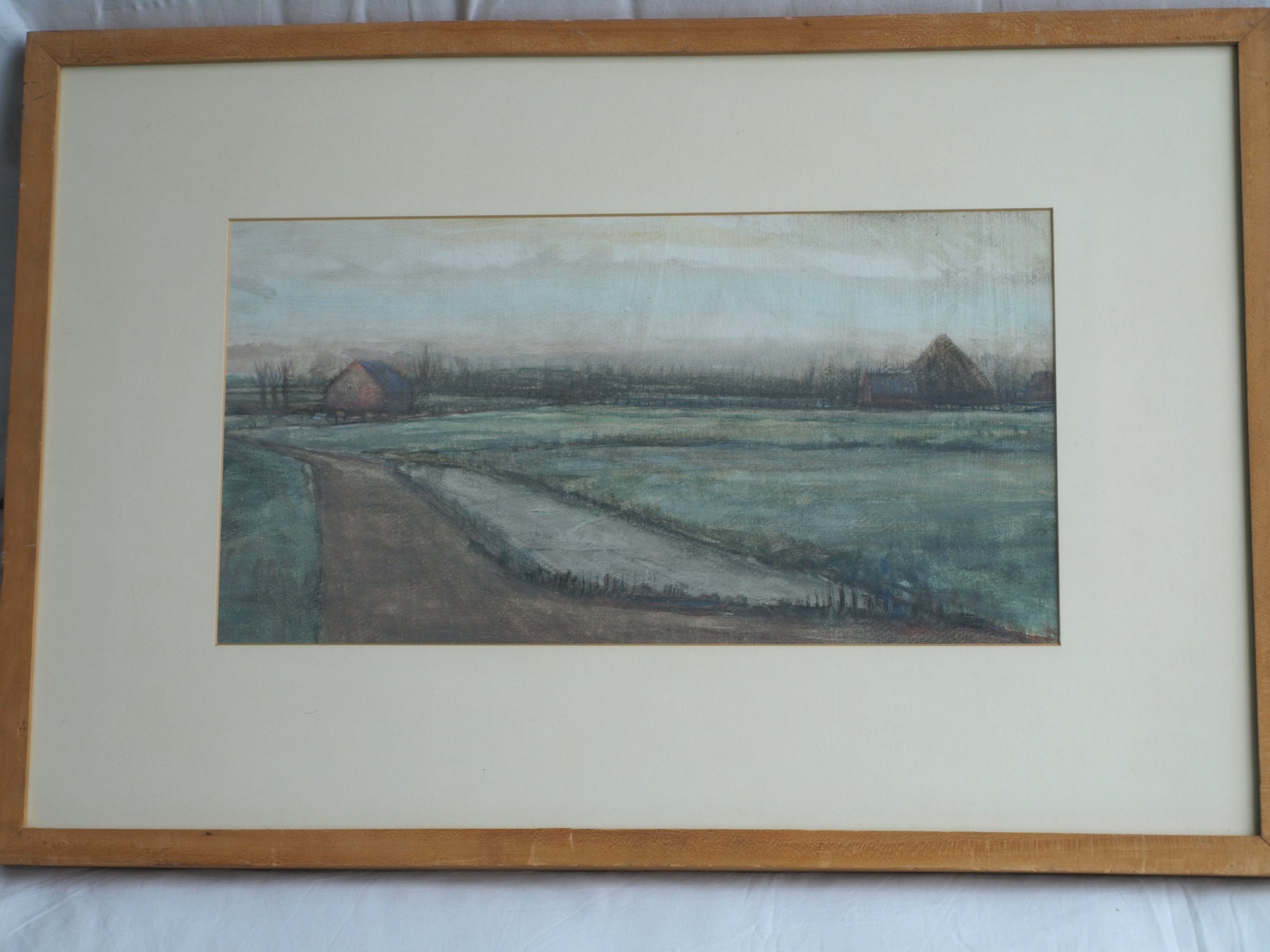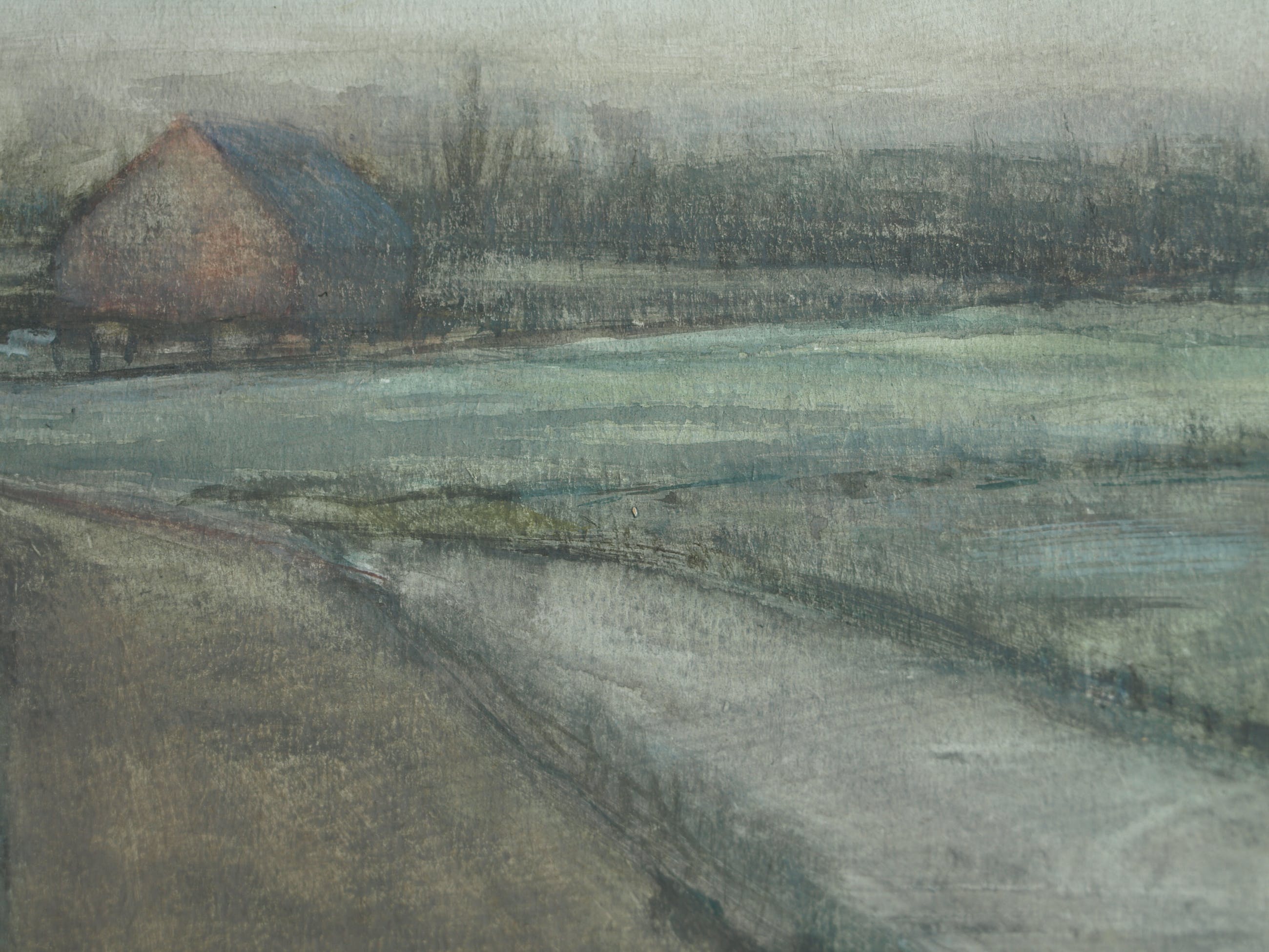-Ingelijst in een houten baklijst met passe-partout en glasplaat. Op de achterkant staat de titel vermeld: “Duinlandschap”.