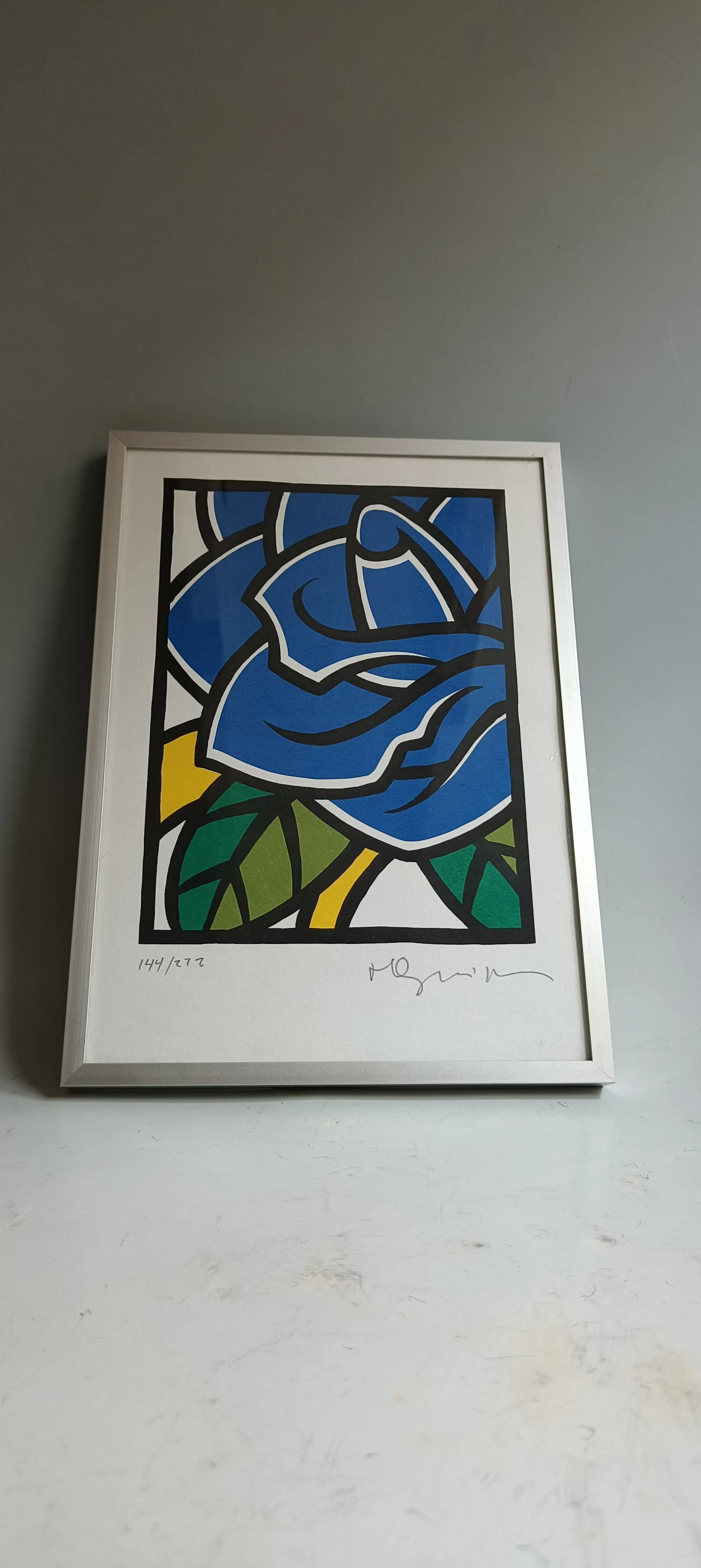 Mooie tattoo stijl zeefdruk van de bekendste tatoeëerder Henk Schiffmacher. Titel de blauwe roos.