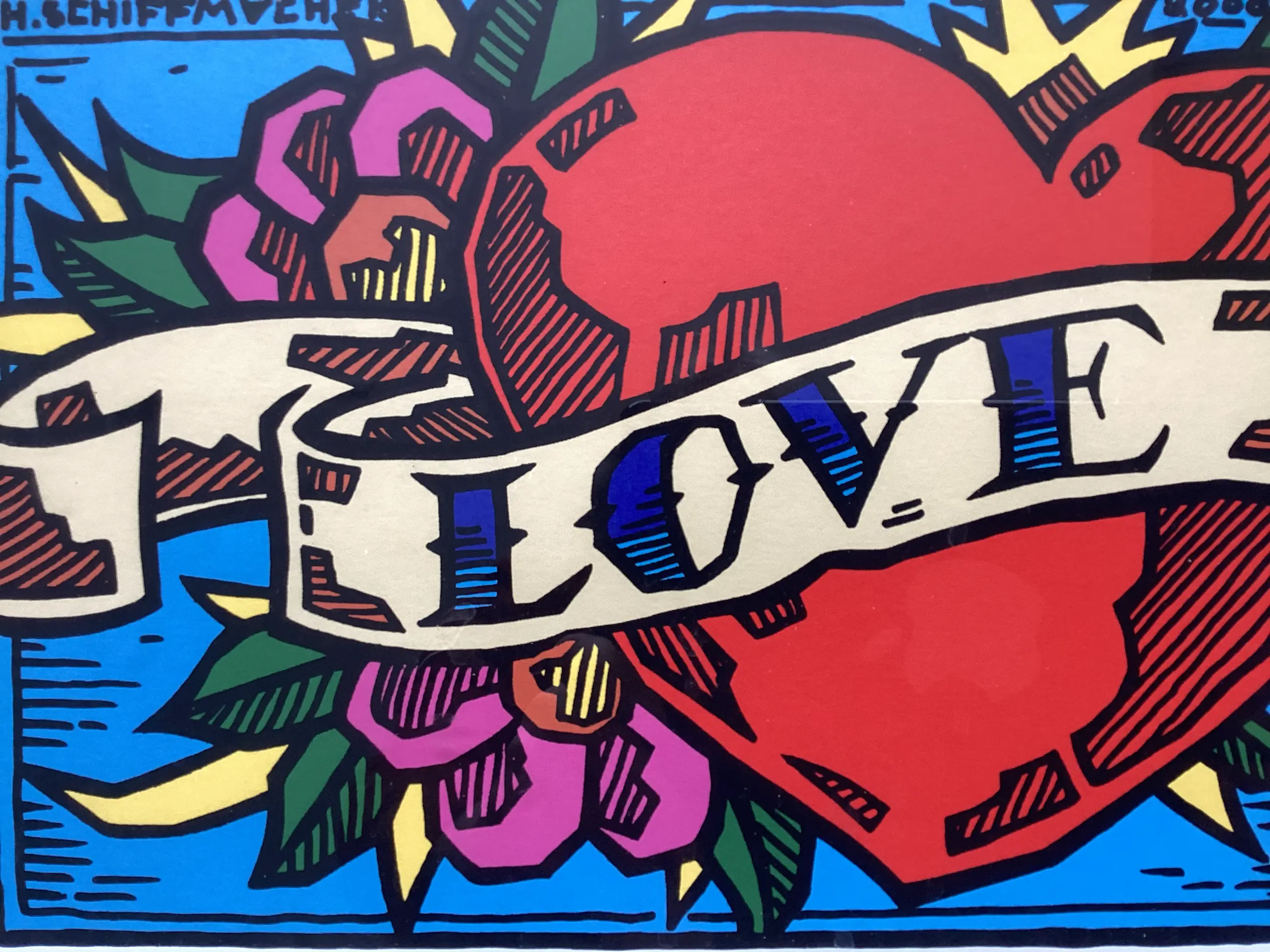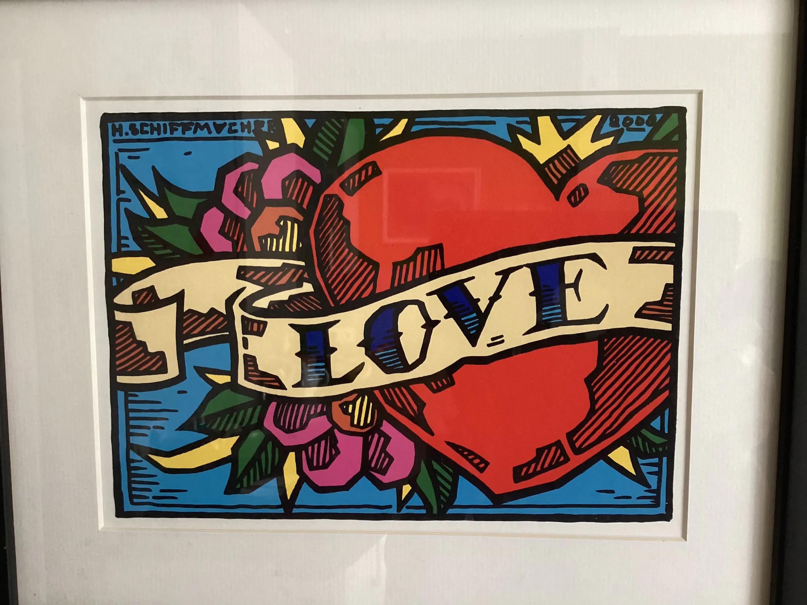 In zwarte houten lijst kleuren zeefdruk van Henk Schiffmacher uit 2008. Formaat incl. zwarte houten lijst 30 x 36 cm. ArtMarketing. Links boven gesigneerd. In prima conditie.