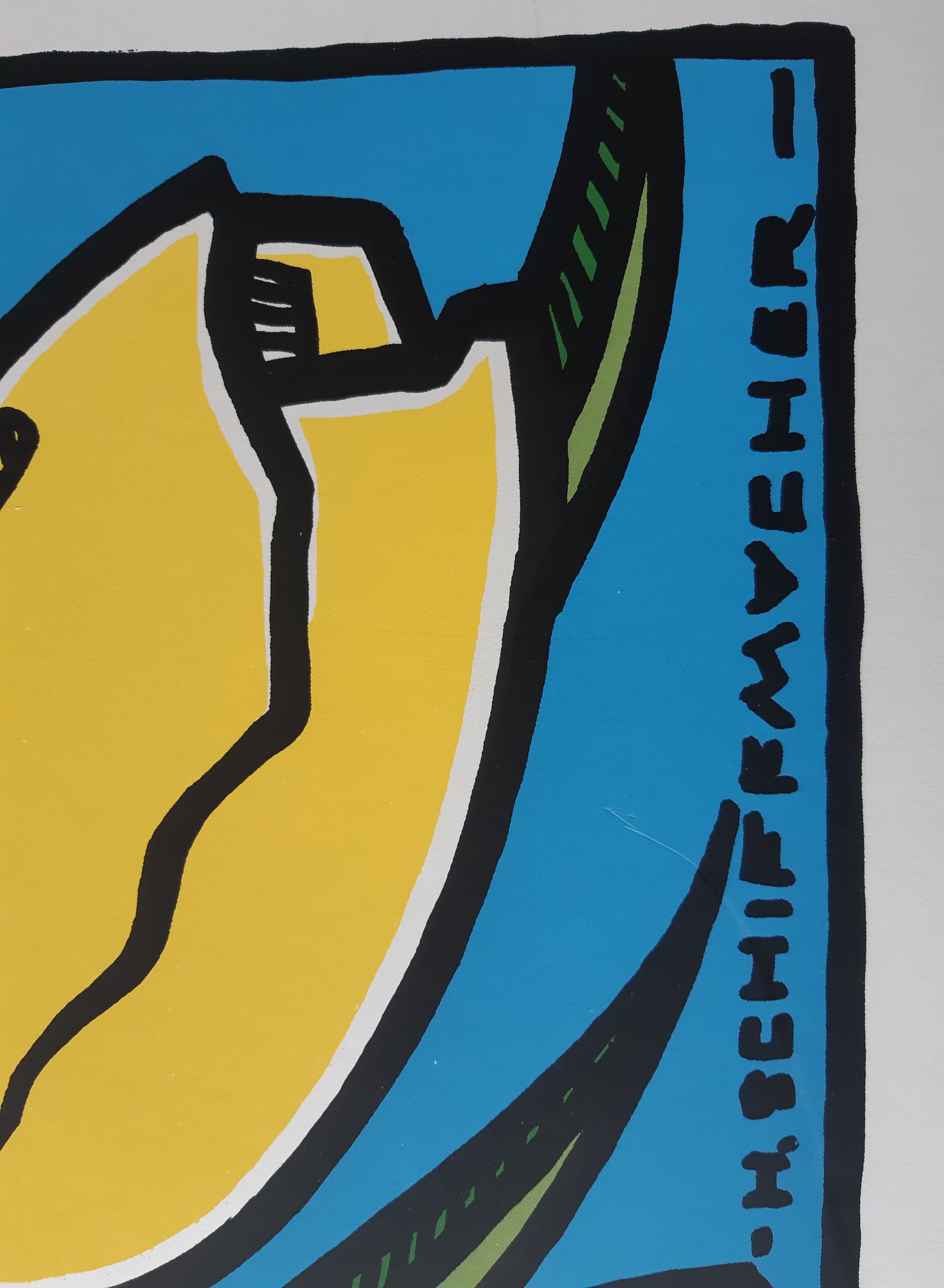 Zeefdruk van Henk Schiffmacher. Niet ingelijst. Blad is 49 x 49, afbeelding 40 x 40. De conditie is goed, kleine beschadigingen in blauw vlak (zie foto's), plakbandrest op achterkant.