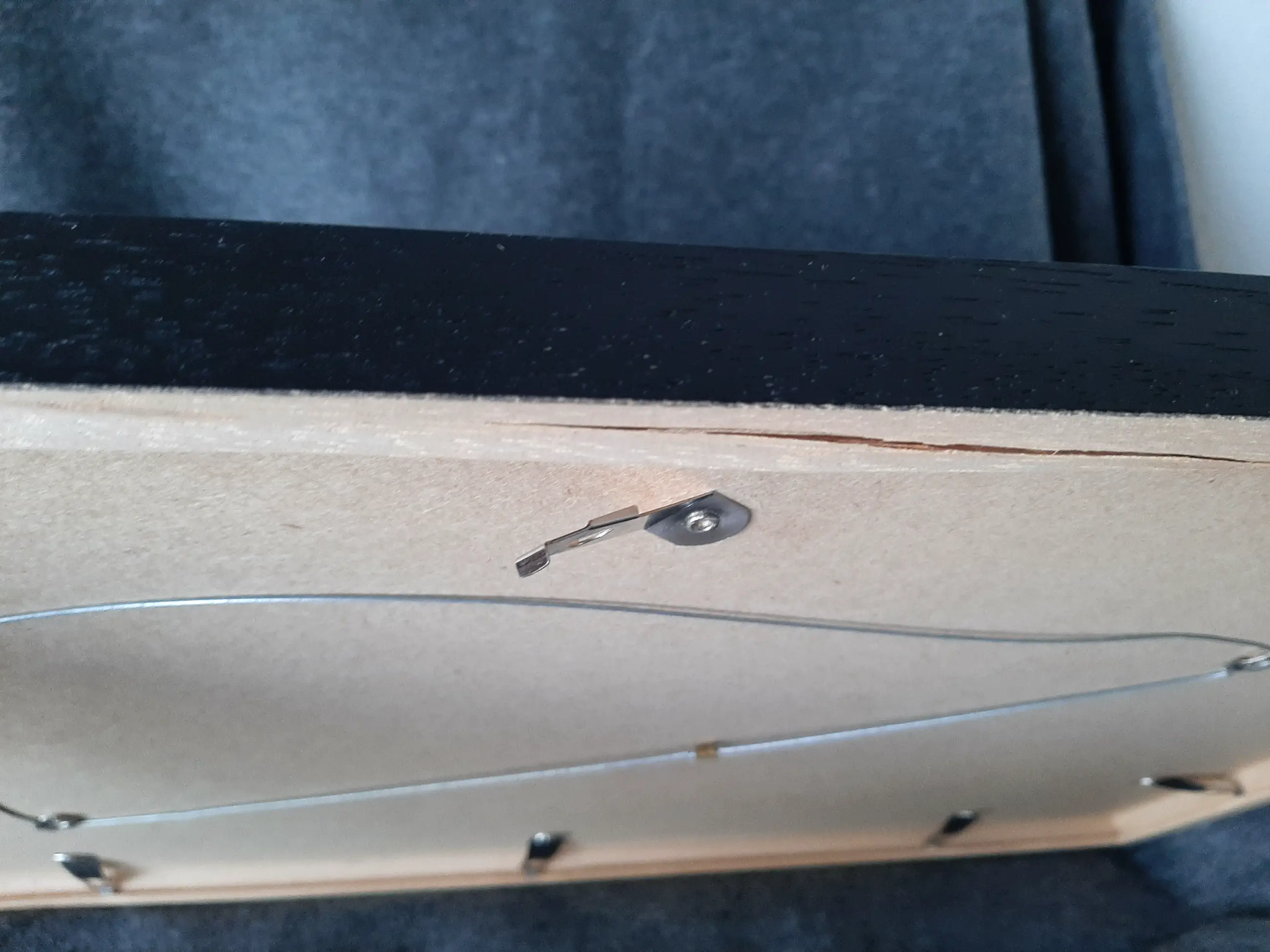 Helaas heeft het glas een krasje en is aan de achterzijde een strookje hout los gekomen (zie foto`s). Op deze plekken na is de lijst in nieuwstaat.