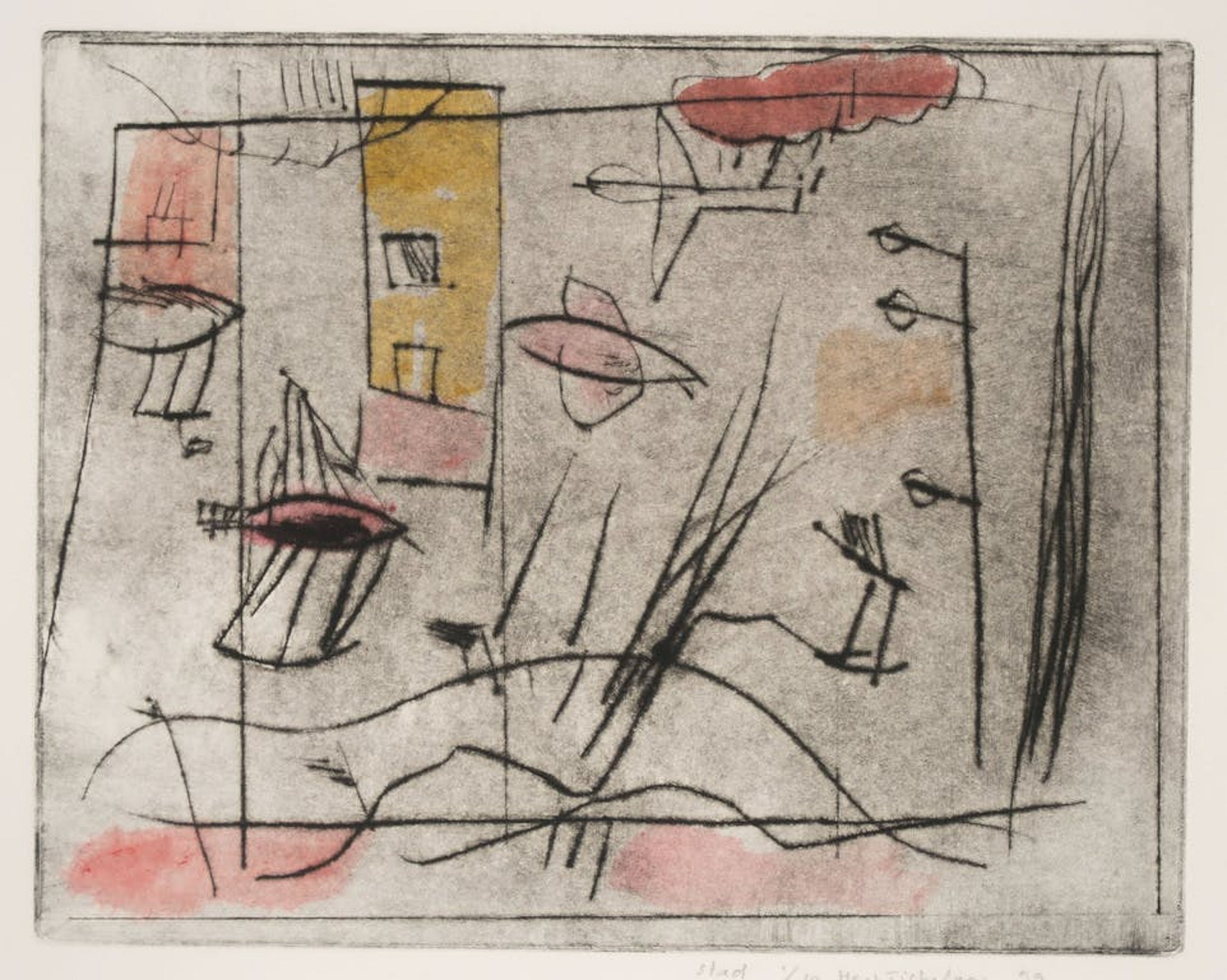 Materiaal: Droge naald, ingekleurd met gekleurde inkt op papier