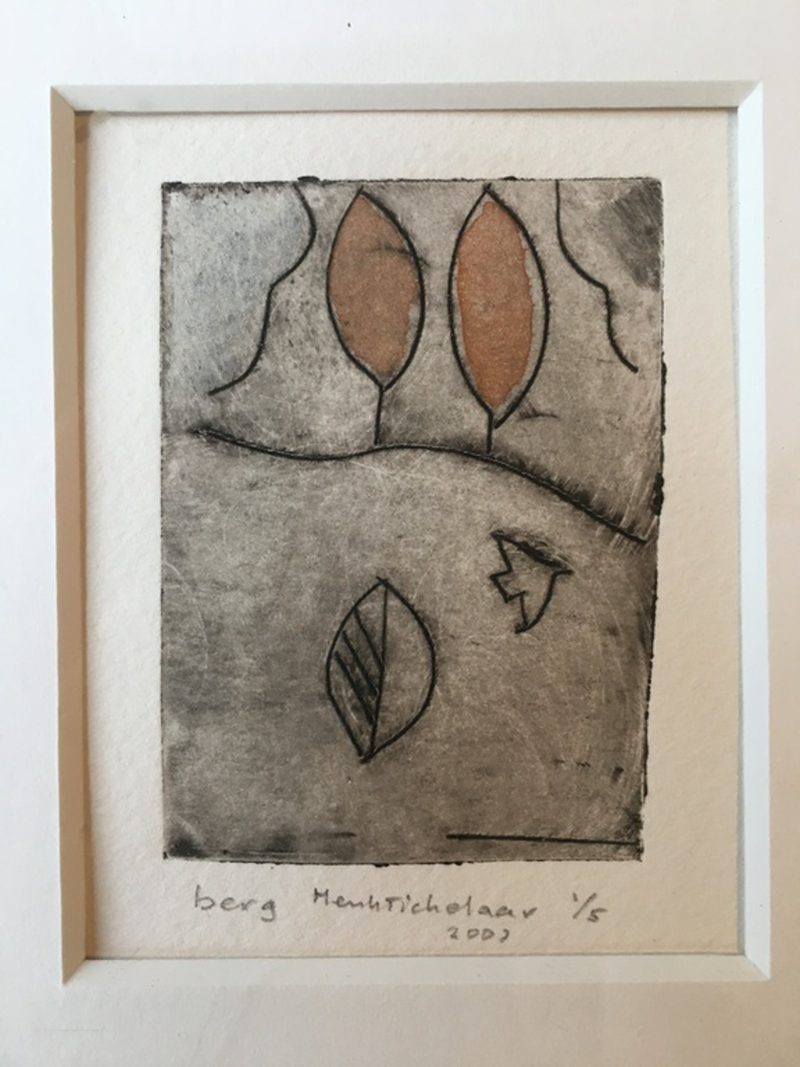 Juist het kleine formaat in combinatie met de terra kleuren en de fijne naaldlijnen maken dit een uniek werk.