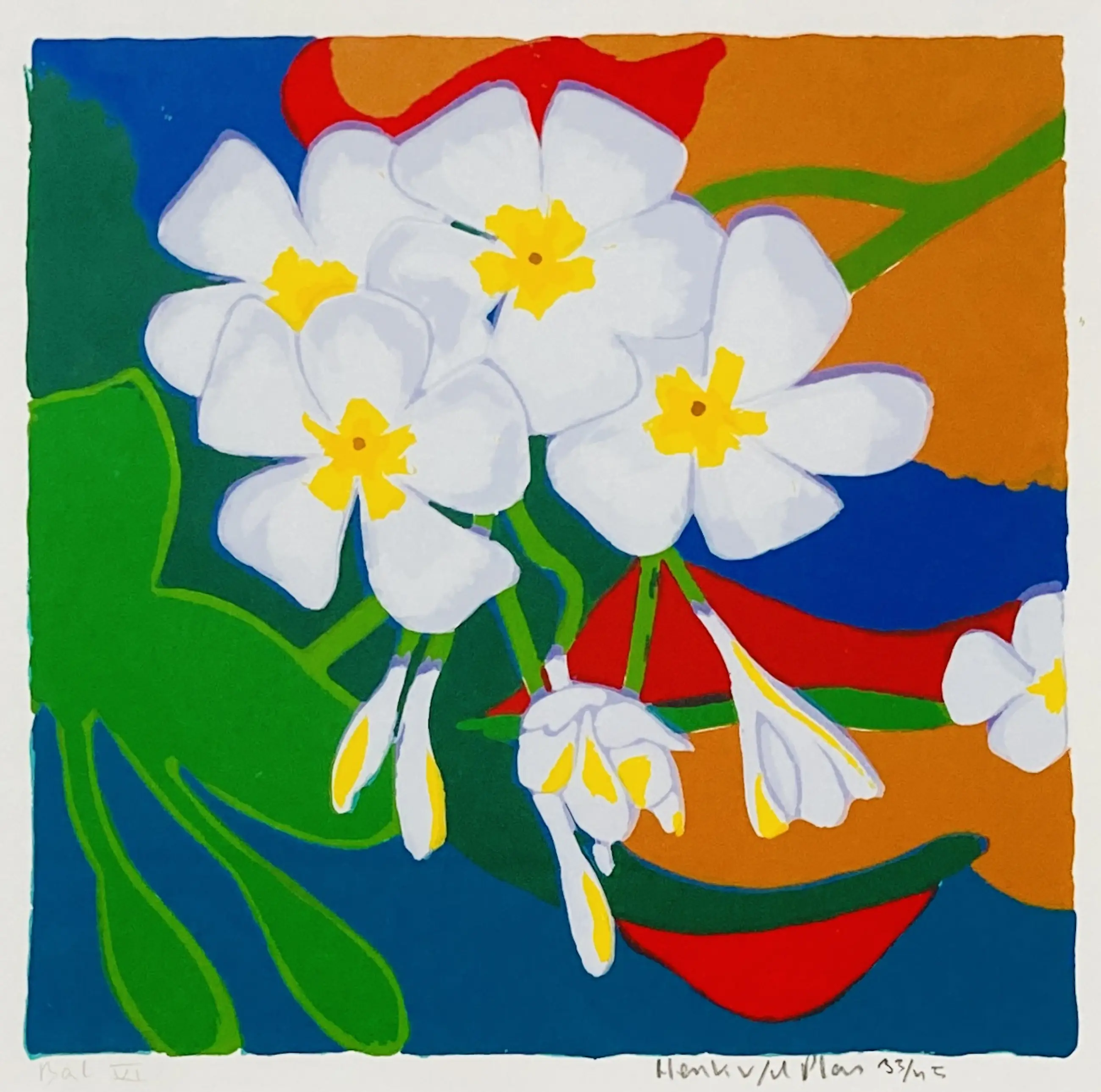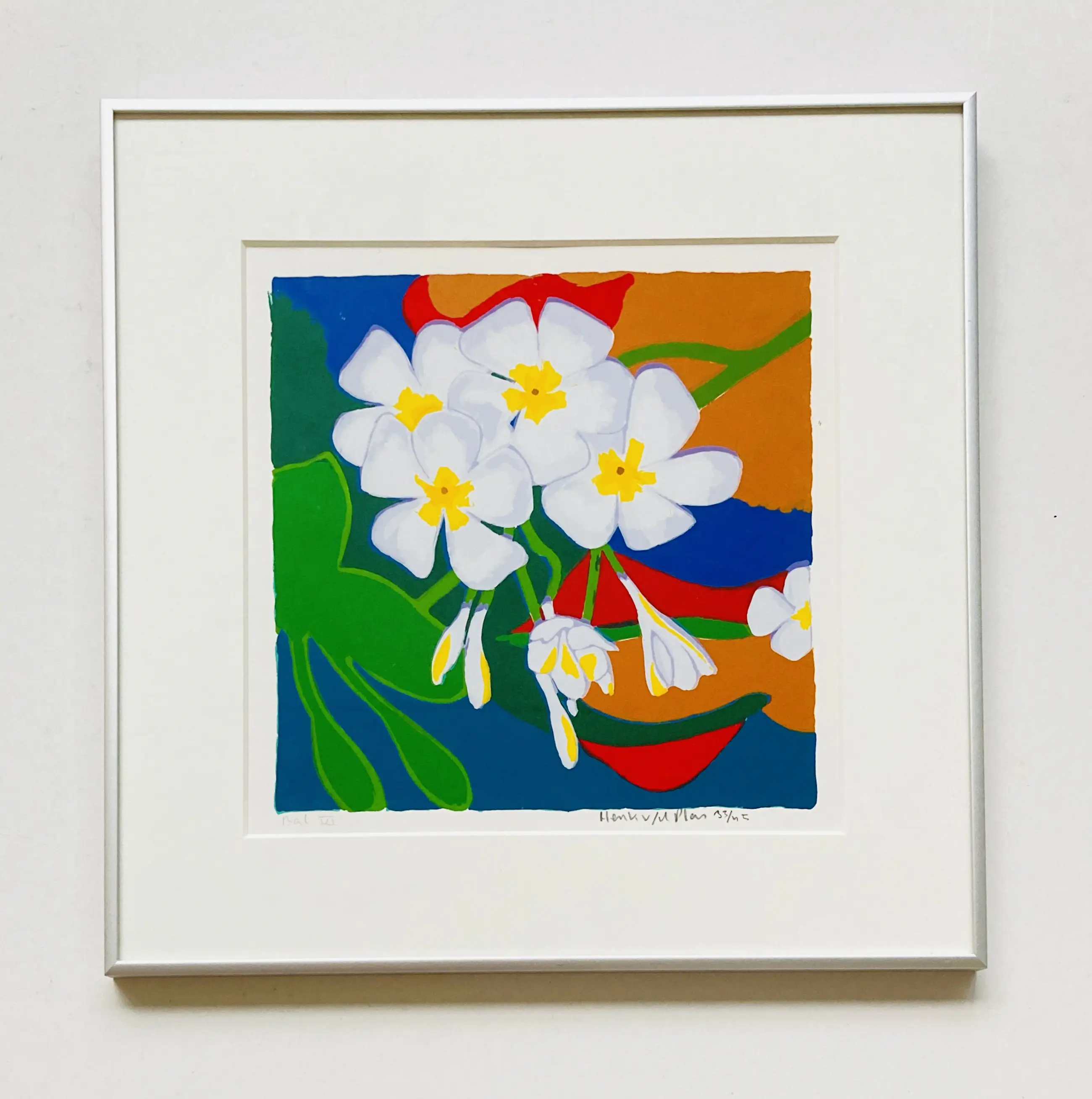 Een mooie zeefdruk van de Nederlandse kunstenaar Henk van der Plas. Het werk verkeert in uitstekende conditie en is handgesigneerd door de kunstenaar.