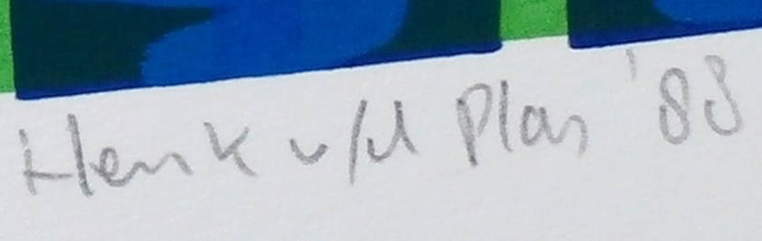 Zeefdruk van Henk van der Plas uit 1988. Abstracte compositie. Nummer: 36/300. Afmetingen blad: H46 x b46 cm. Afmetingen voorstelling: H40 x b40cm. Het werk is rechtsonder, met potlood, gesigneerd door de kunstenaar. De authenticiteit van dit werk wordt volledig gegarandeerd. Een certificaat van echtheid kan, op aanvraag, worden meegestuurd. Conditie: in zeer goede staat.