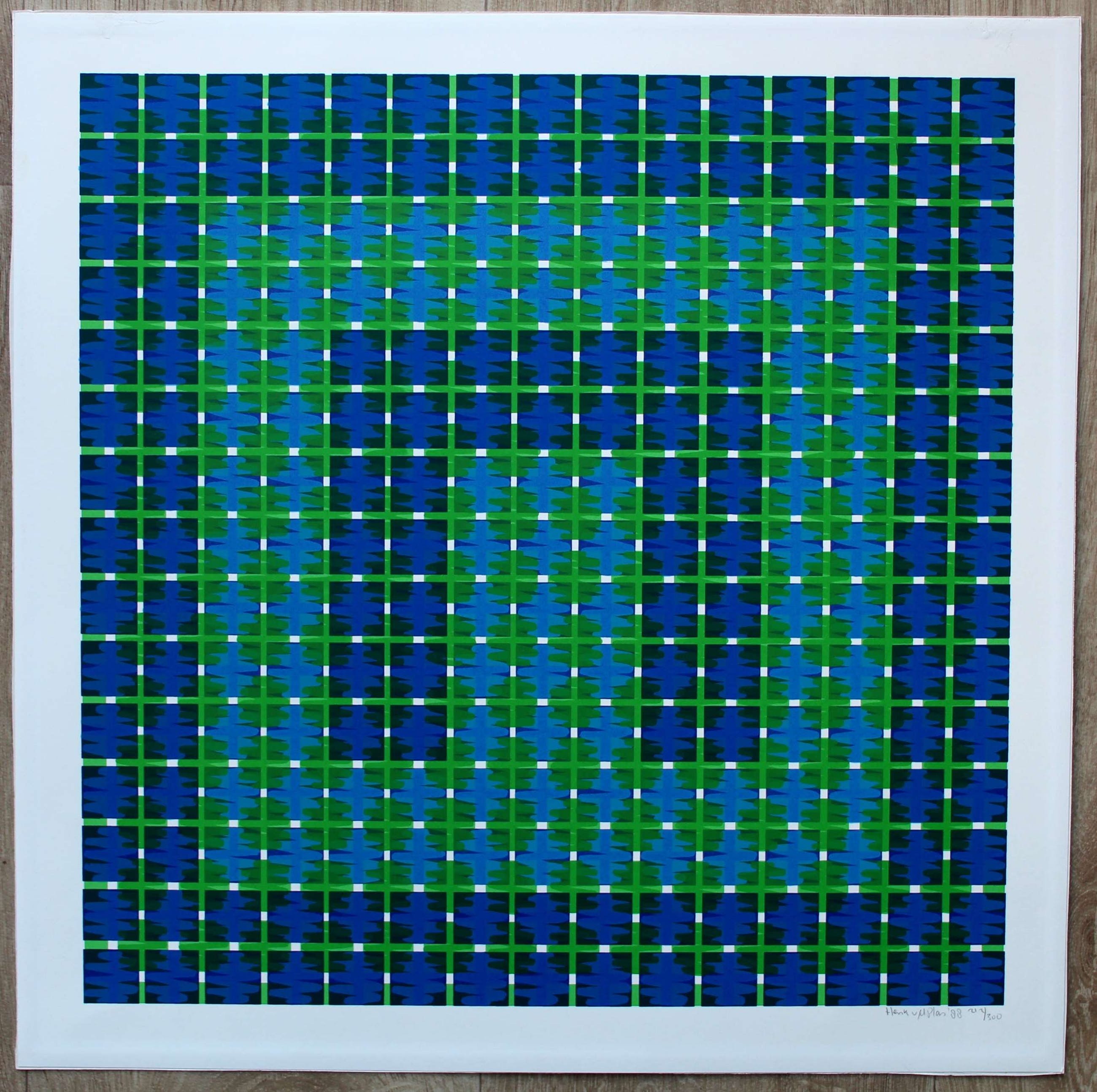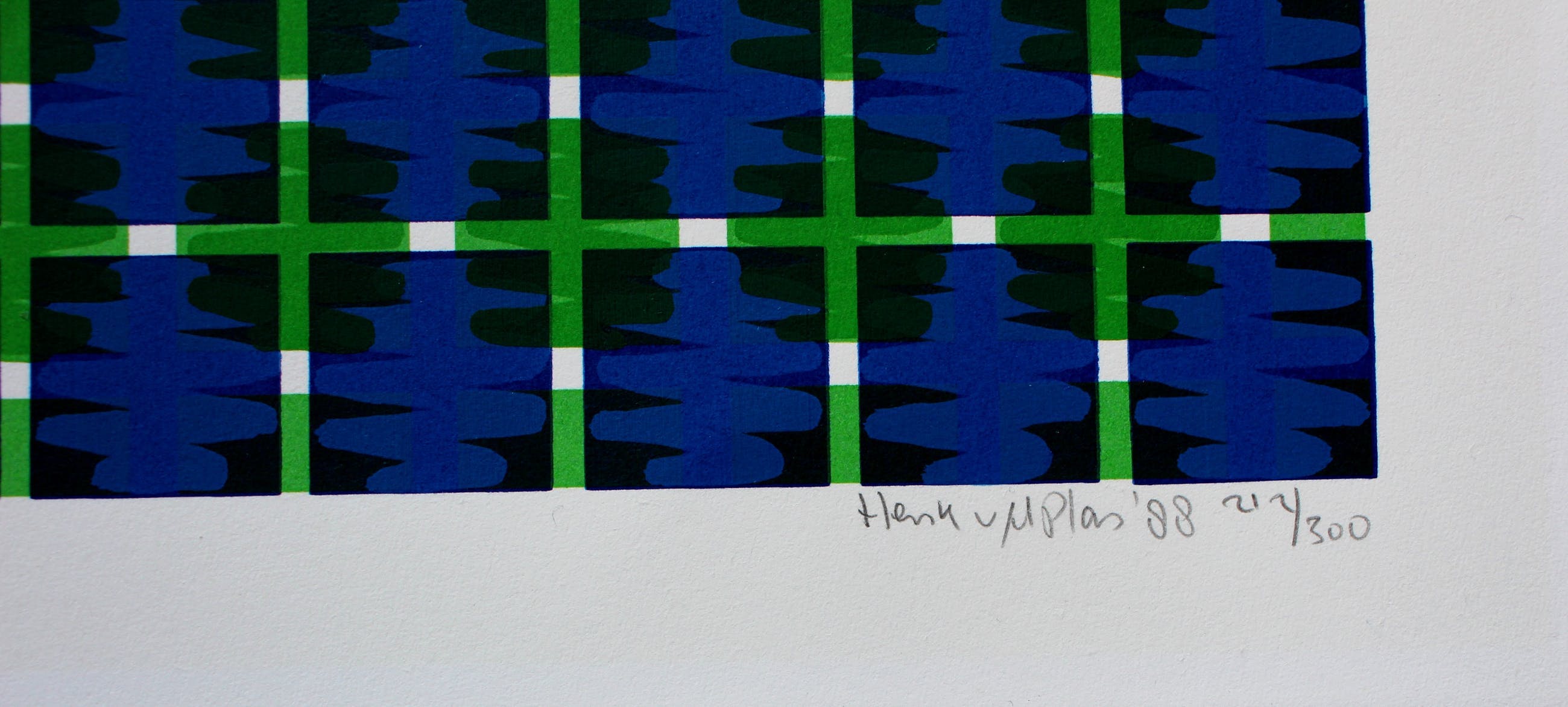 Zeefdruk van Henk van der Plas uit 1988. Abstracte compositie. Nummer: 36/300. (het nummer kan afwijken omdat ik meerdere exemplaren heb gehad). Afmetingen blad: H46 x b46 cm. Afmetingen voorstelling: H40 x b40cm. Het werk is rechtsonder, met potlood, gesigneerd door de kunstenaar. De authenticiteit van dit werk wordt volledig gegarandeerd. Een certificaat van echtheid kan, op aanvraag, worden gemaild. Herkomst: ABN AMRO collectie.