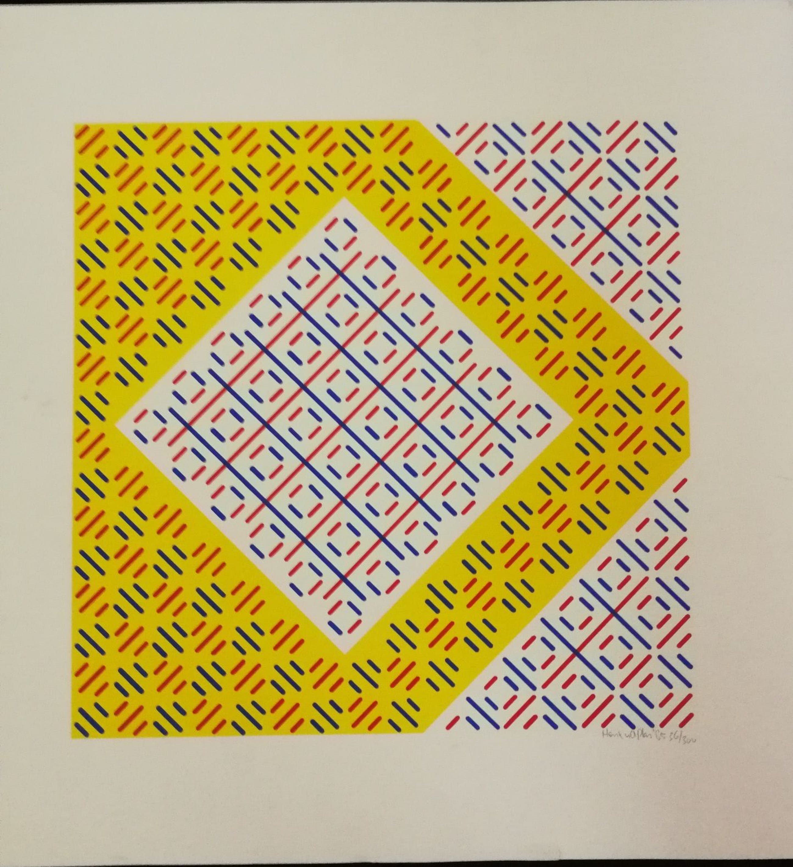 Een op Mondriaan geinspireerde zeefdruk met rode en blauwe streepjes in een geel en wit vlak. De afbeelding zelf meet 32 x 32 cm, met een brede witte marge dus. Vanwege kleine oneffenheden bieden vanaf 1 euro