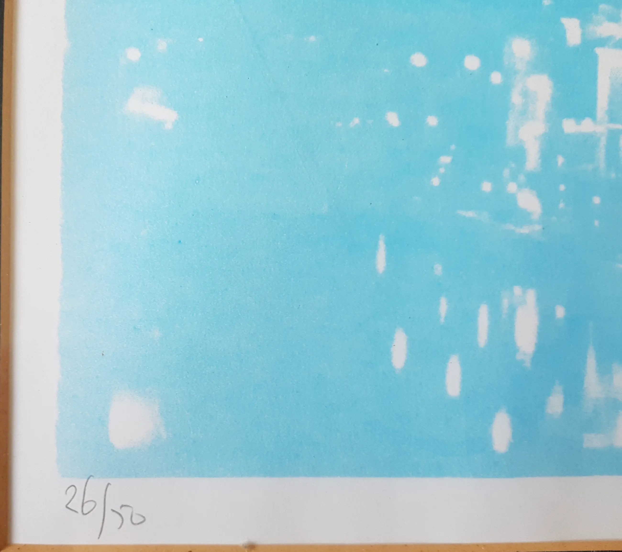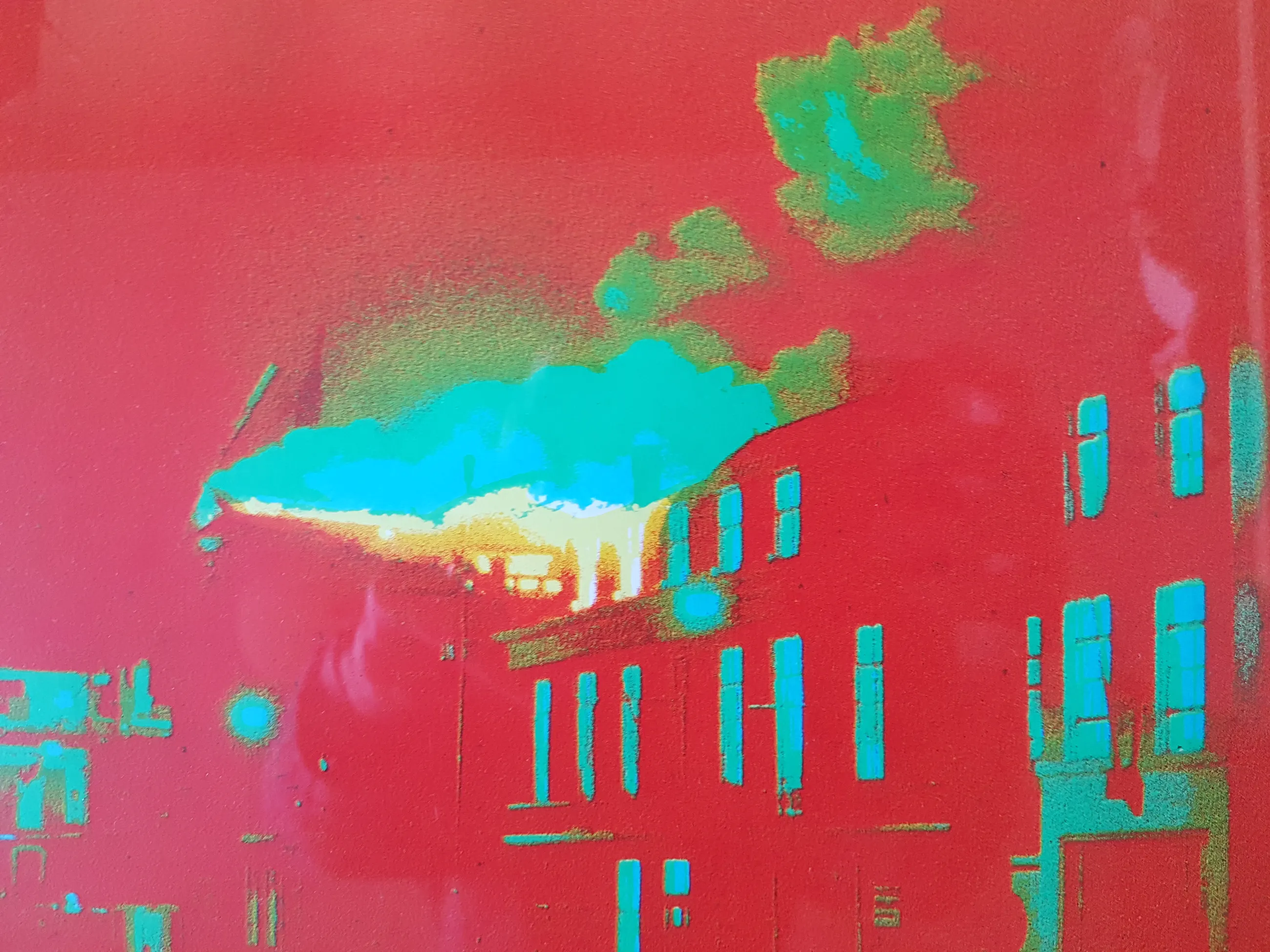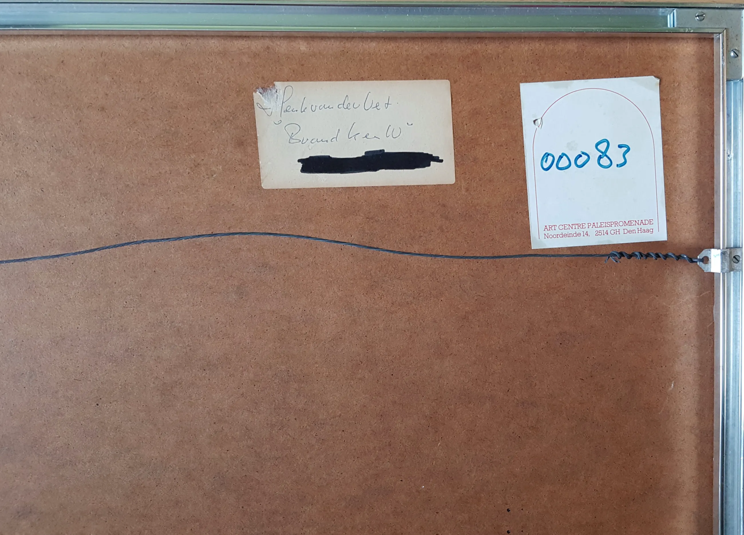 Henk van der Vet heeft met dit kunstwerk de enorme brand in het Gebouw van Kunsten en Wetenschappen vastgelegd op 18 december 1964 (https://www.dagvantoen.nl/k-en-w-uitgebrand-in-den-haag/).