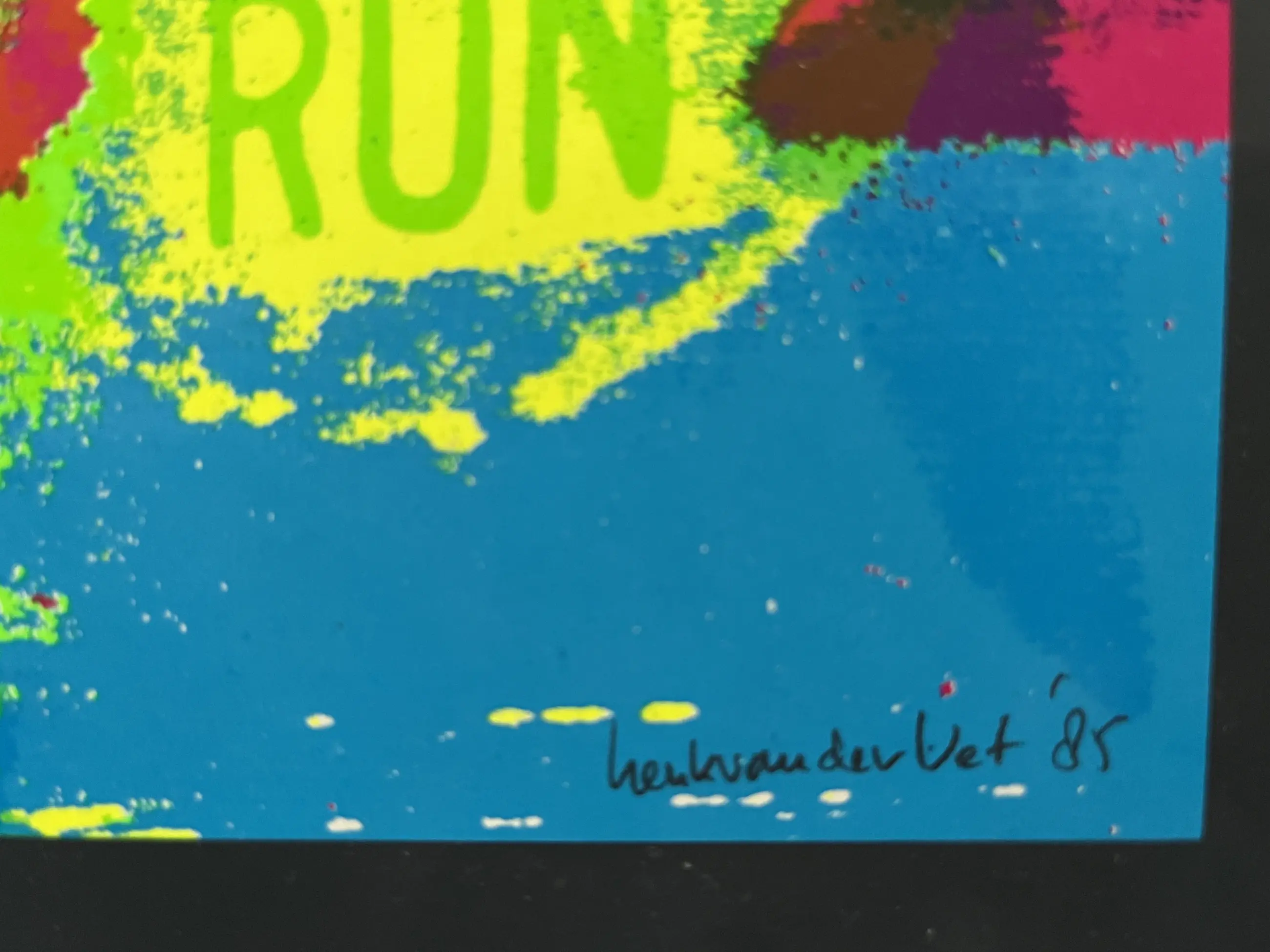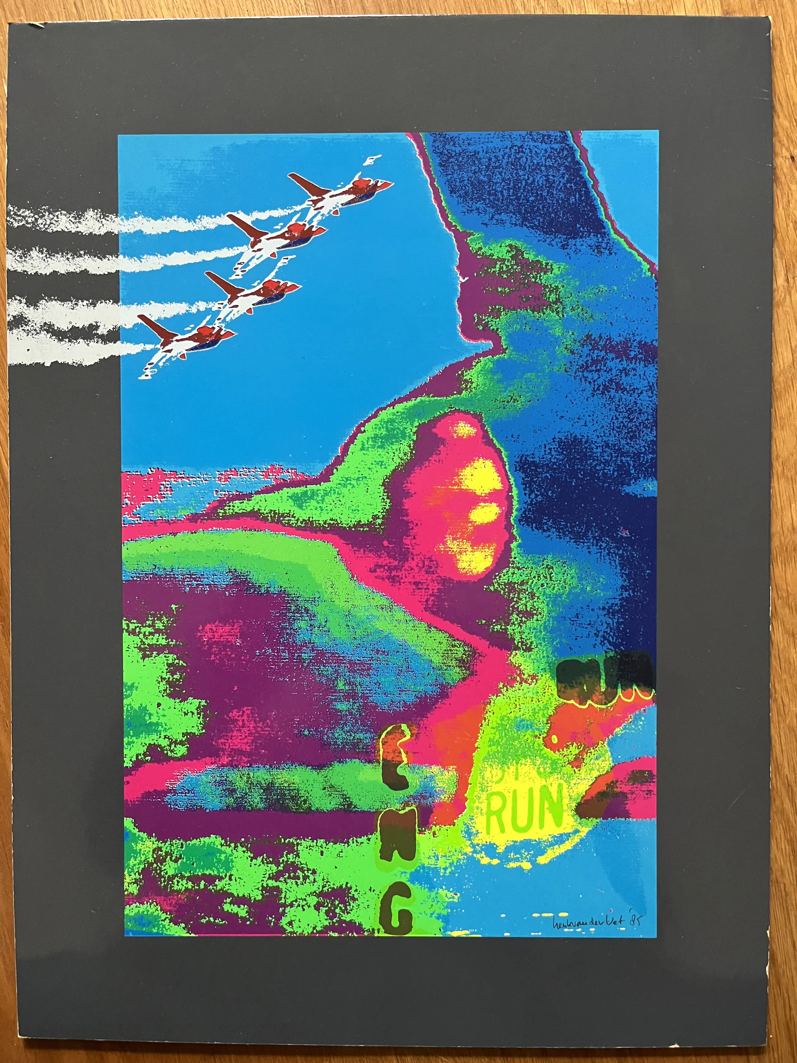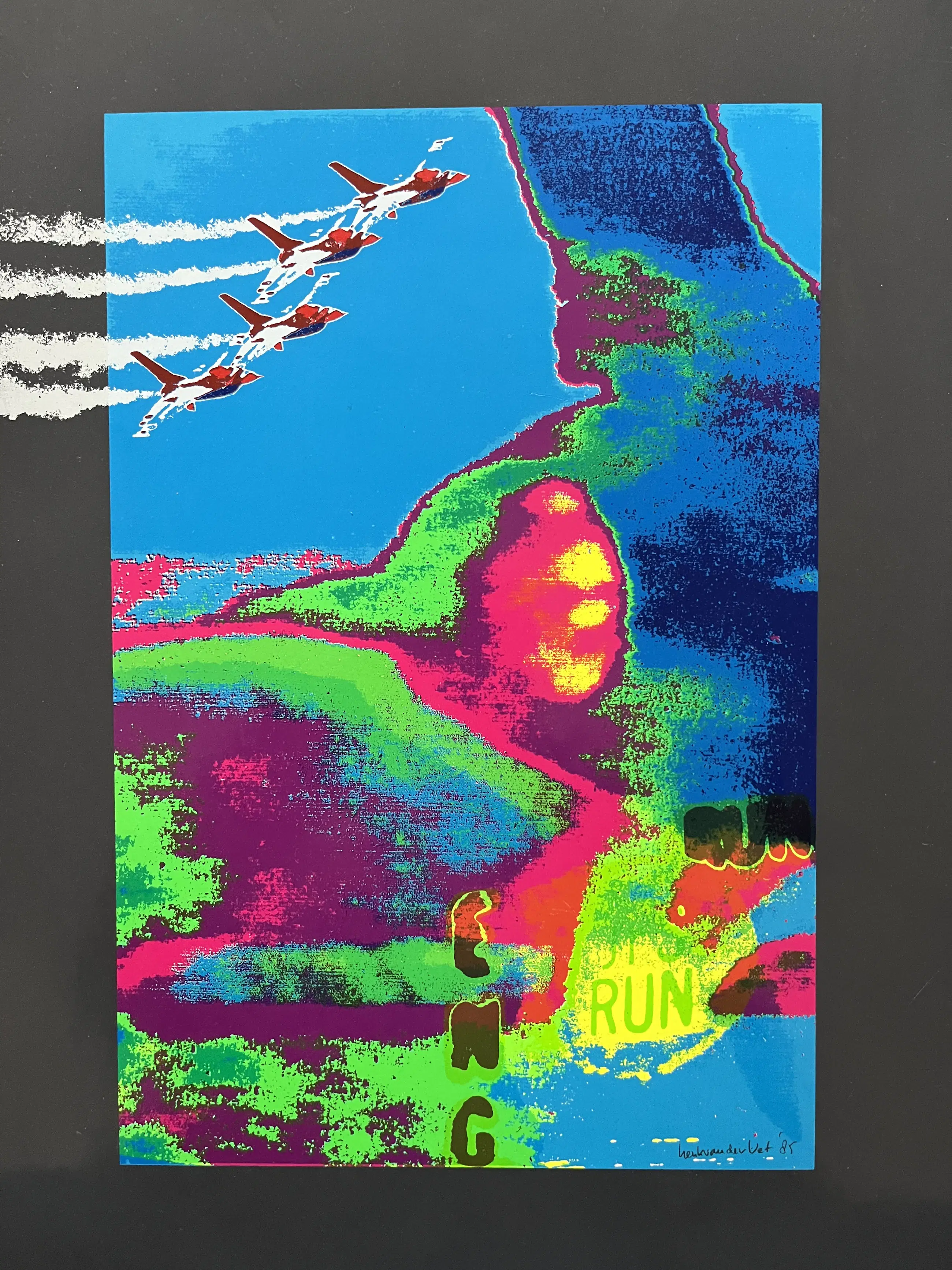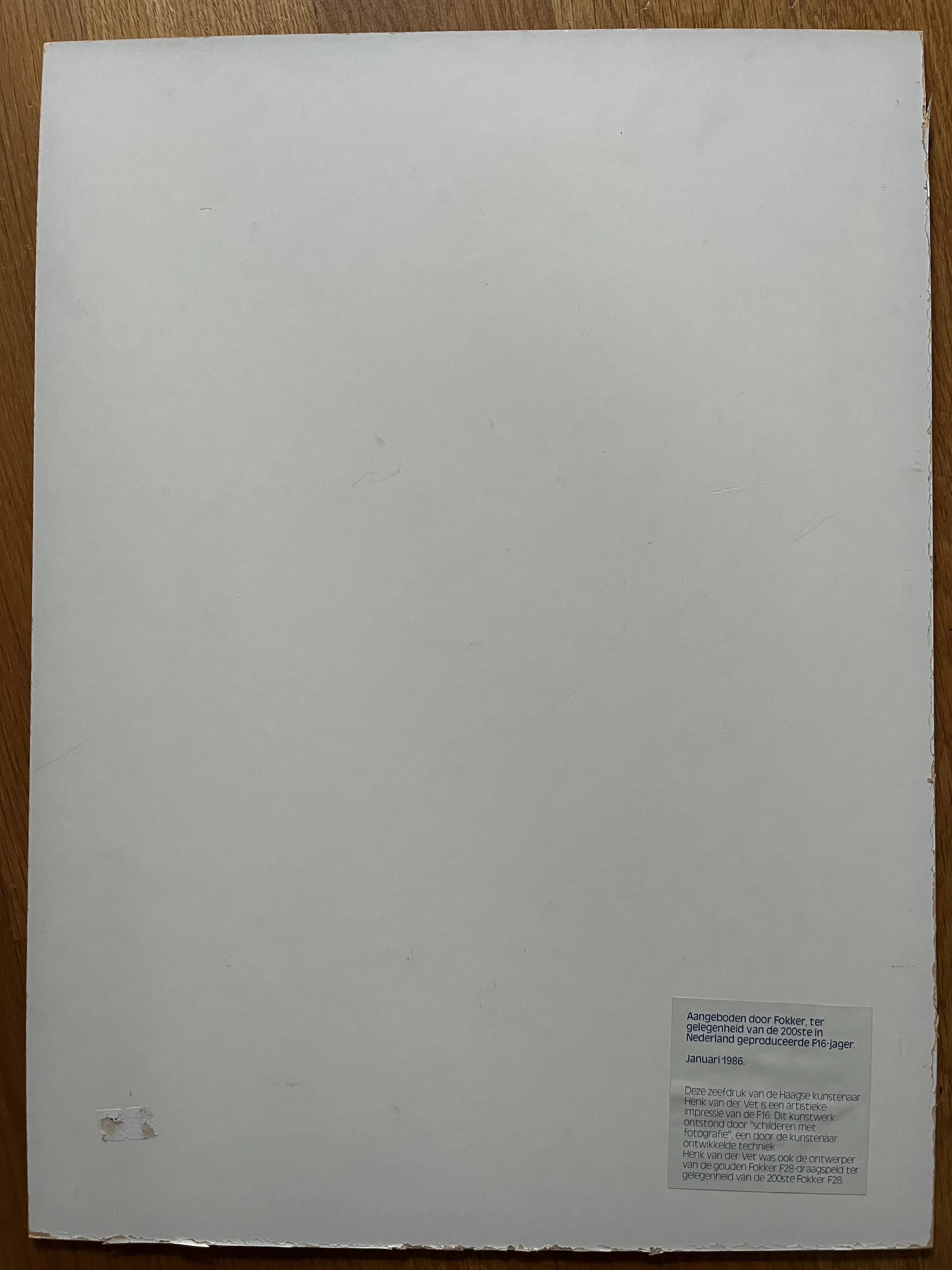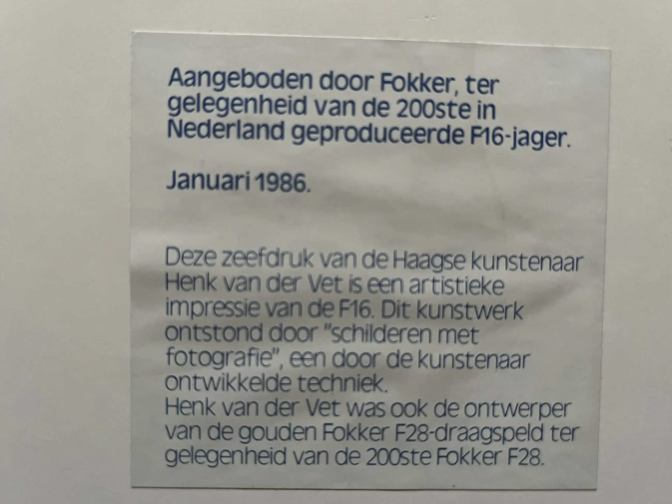 Zeefdruk uit 1986, uitgegeven door FOKKER ter gelegenheid van de 200 e in Nederland geproduceerde F-16. Geplakt op een kunststof ondergrond. Oplage onbekend. Afmeting 46 x 34 cm. Zijkantjes hebben, met name aan de rechteronderkant wat kleine beschadigingen.