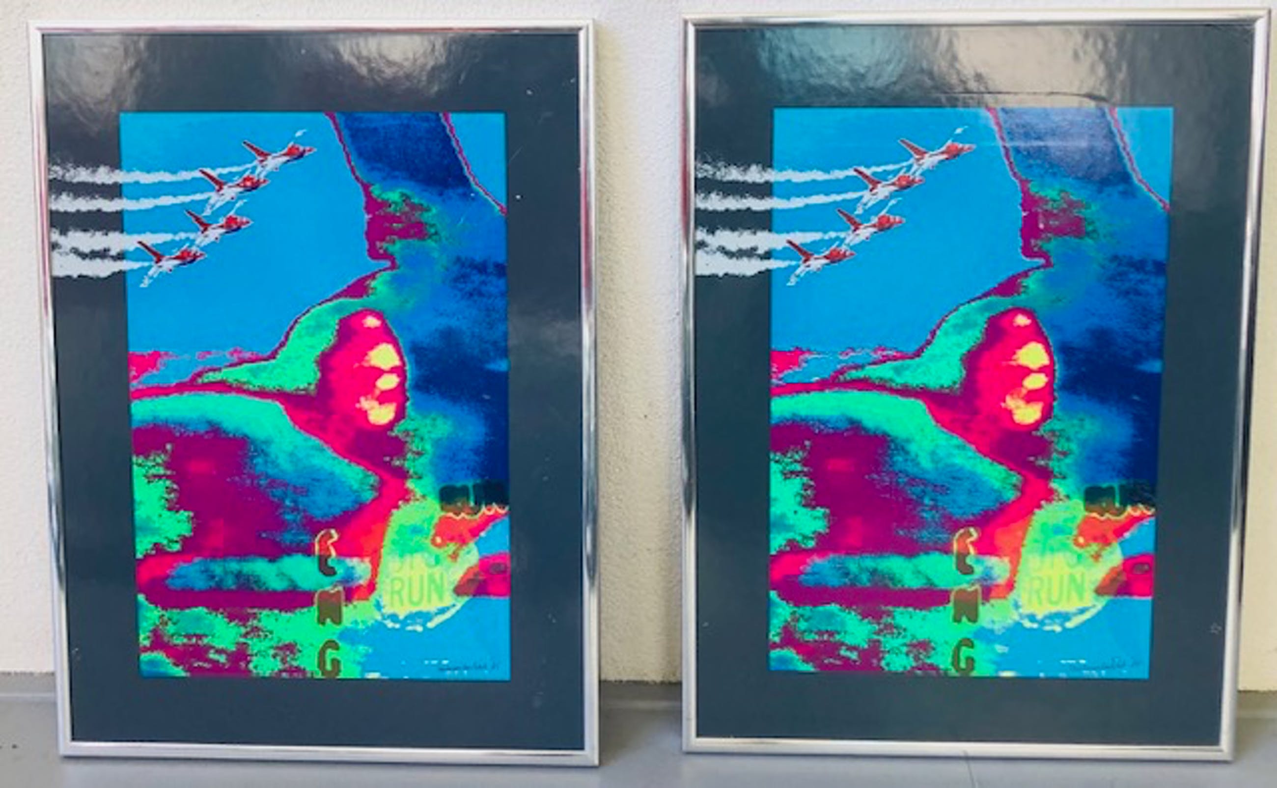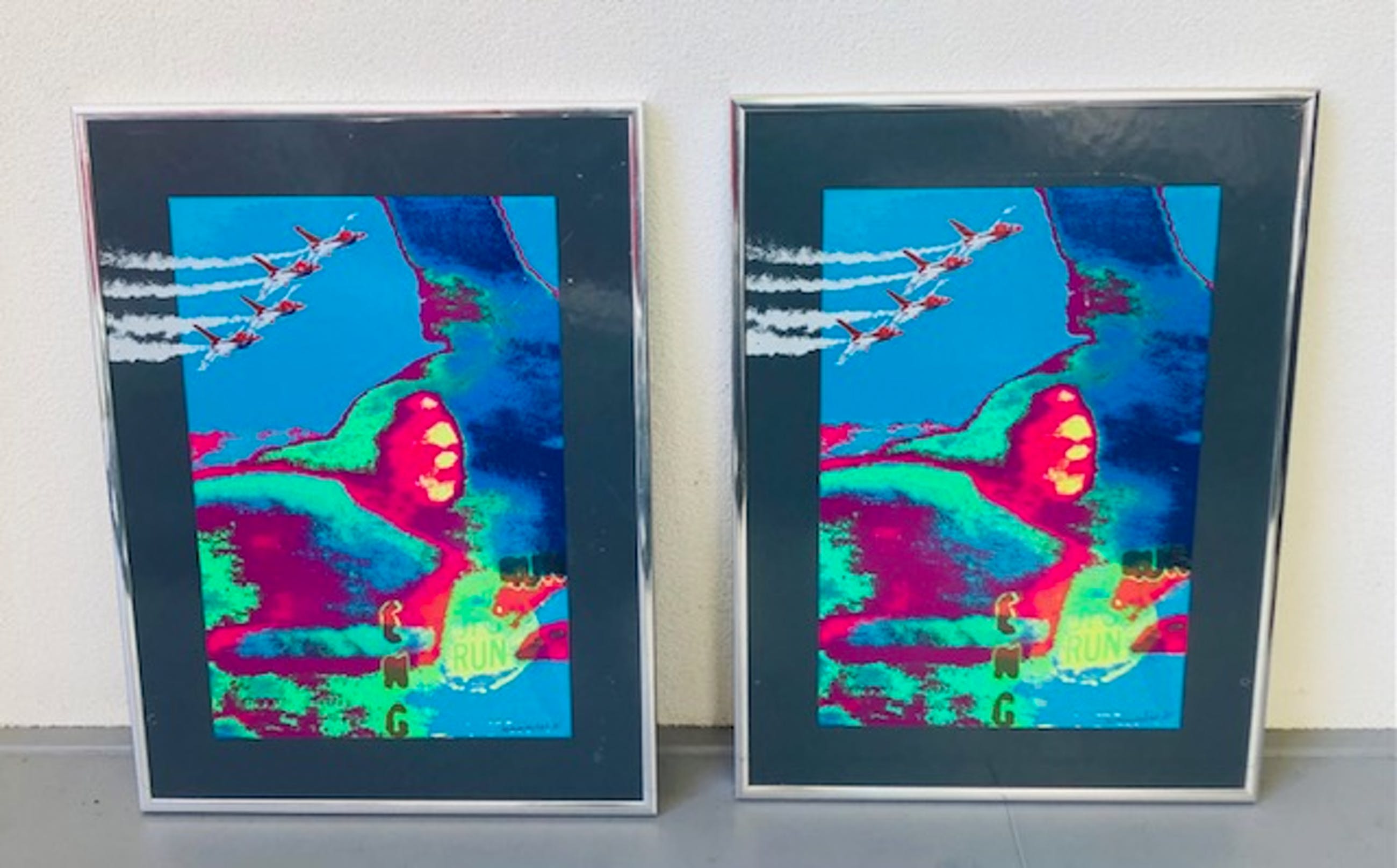 Gemaakt voor Fokker. Beide zeefdrukken komen in identieke lijst en zijn gesigneerd.