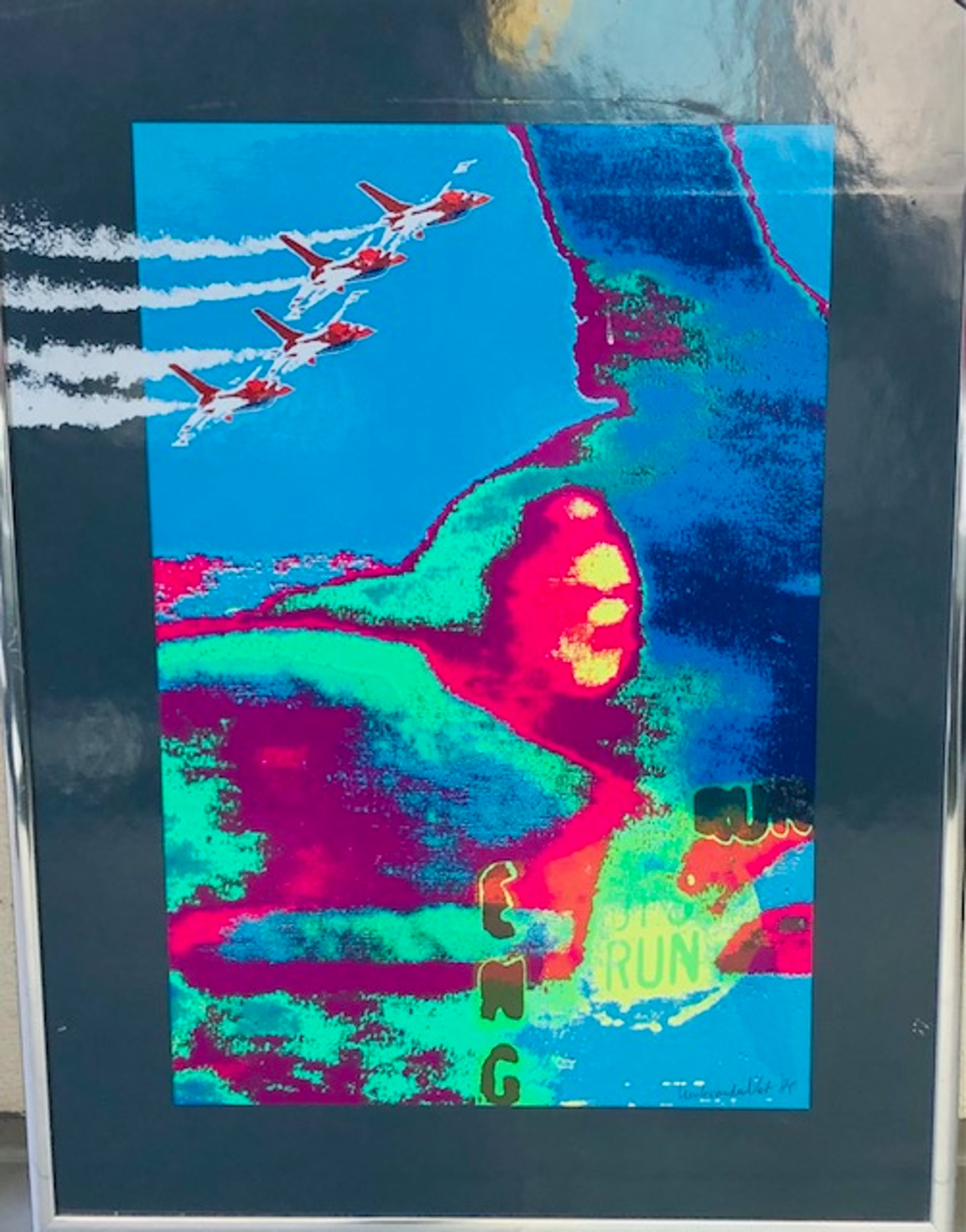 Deze Zeefdruk van de Haagse Kunstenaar Henk van der Vet is een artistieke impressie van de F16. Dit kunstwerk ontstond door 'schilderen met fotografie", een door de kunstenaar ontwikkelde techniek.