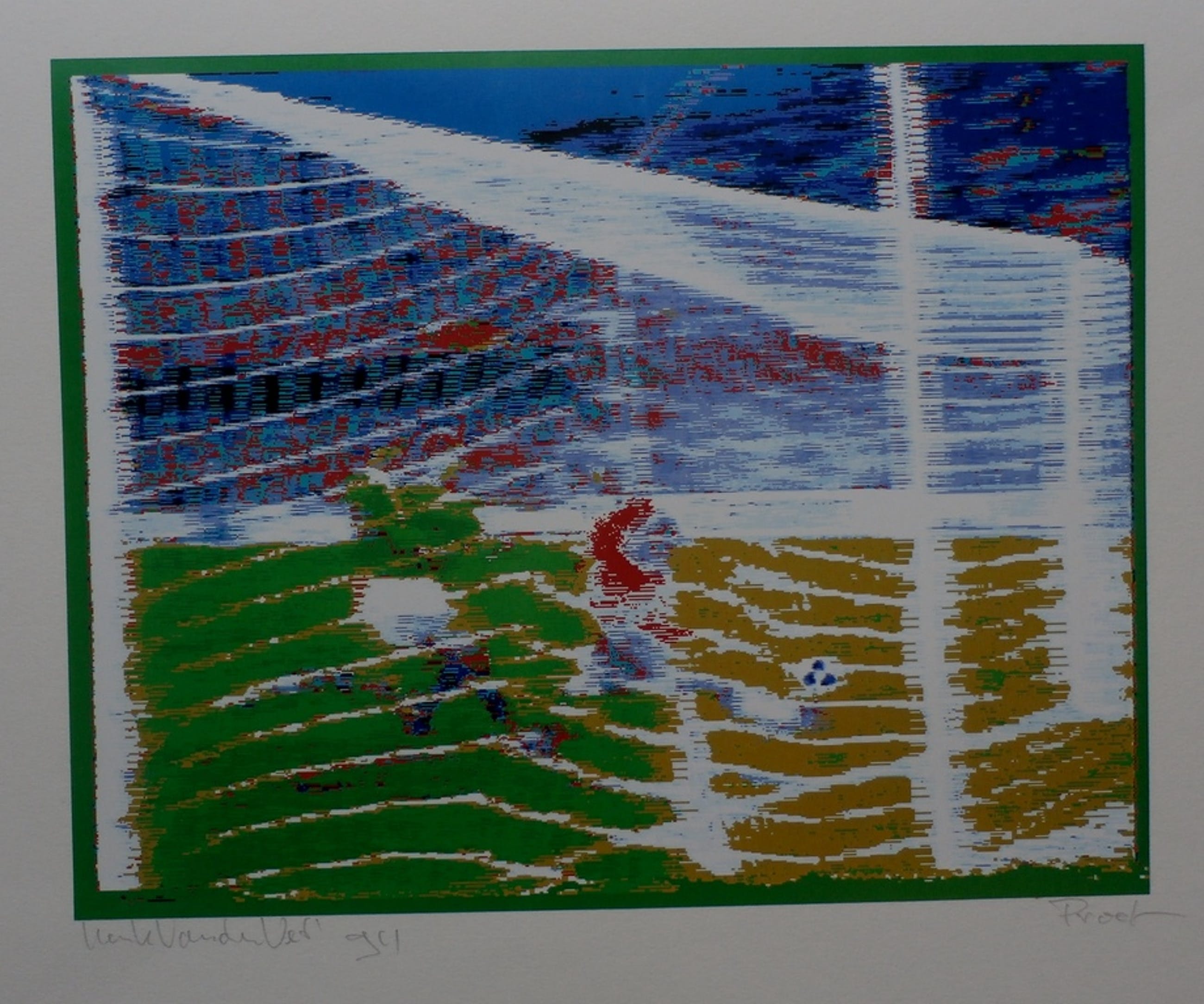 Zeefdruk van Henk van der Vet uit 1994. Proefdruk. "Voetballers". Afmetingen voorstelling: h37 x b46 cm. Afmetingen blad: H25 x b31.5 cm. Het werk is rechtsonder gesigneerd door de kunstenaar. De authenciteit van dit werk wordt volledig gegarandeerd. Een certificaat van echtheid kan, op verzoek, worden meegeleverd.