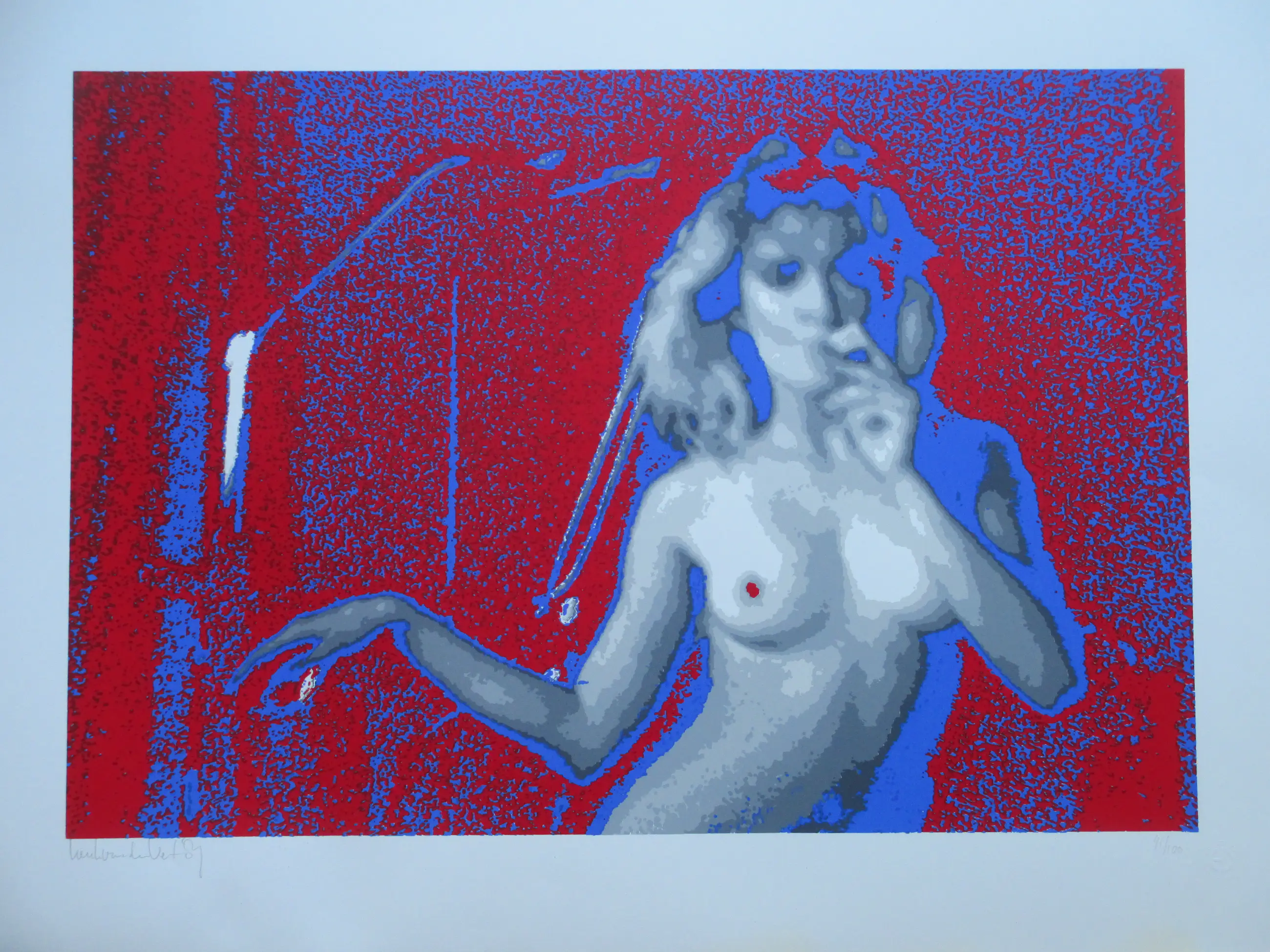 Fraaie zeefdruk/screenprint door Henk van der Vet Voorstelling van een nachtclubdanseres Losbladig, beeldmaat 47x68, bladmaat 62x84 Gesigneerd en gedateerd in potlood l.o.: 'Henk van der Vet '87' Genummerd in potlood r.o.: '91/100' Blindstempel r.o. met initialen en 'screenprinting' Authenticiteit volledig gegarandeerd